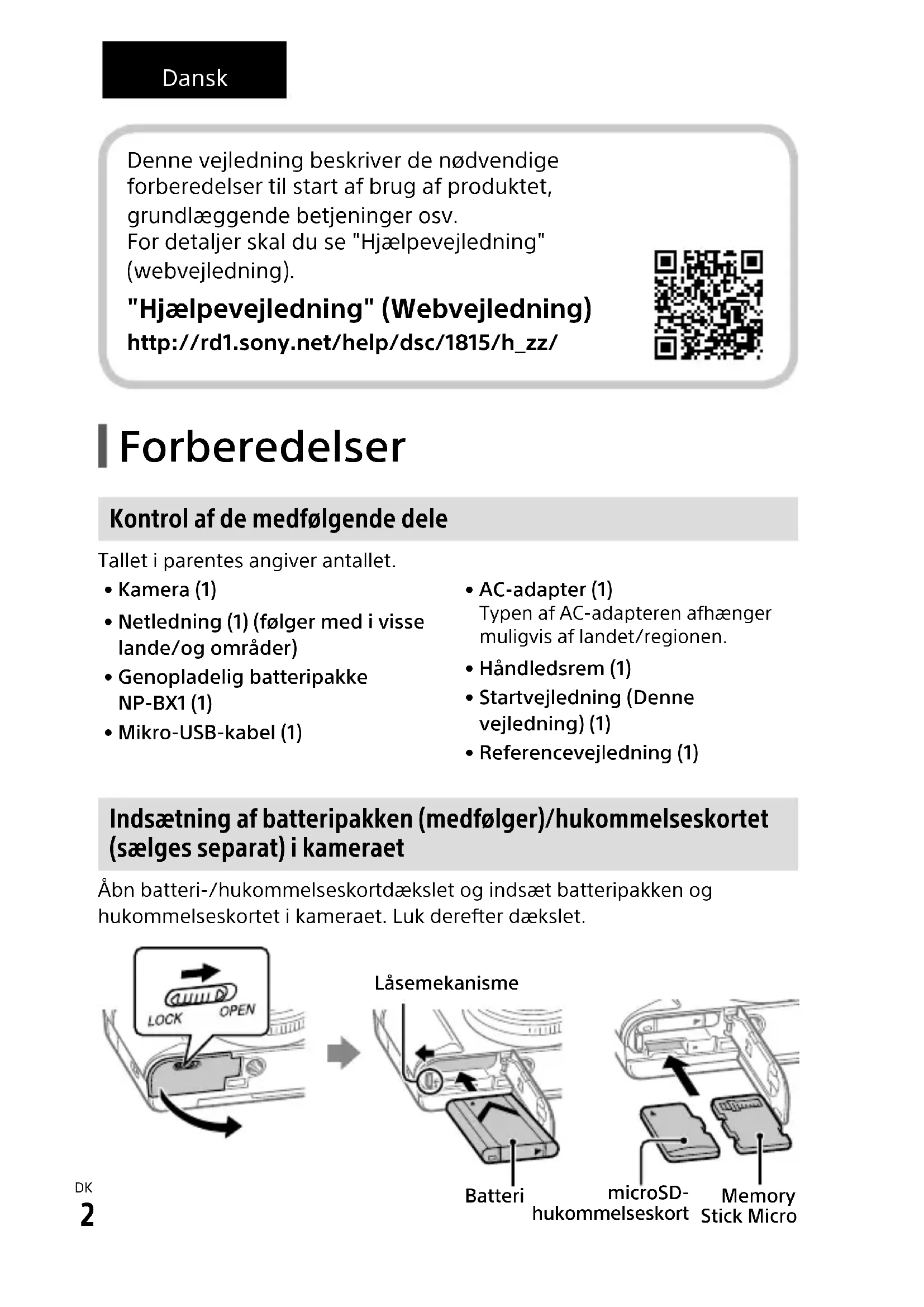 \\Win-473\camera\CX64400(ZLC)\Multi\06_Compose\4746011311_15lang\4746011311DSCHX99CE3\15DK-DSCHX99CE3\15DK.indd DTP data saved: 2018/08/20 09:24 PDF file created: 2018/08/30 10:31 Dansk Forberedelser Kontrol af de medfølgende dele Tallet i parentes angiver antallet.• Kamera (1)• Netledning (1) (følger med i visse lande/og områder)• Genopladelig batteripakke NP-BX1 (1)• Mikro-USB-kabel (1)• AC-adapter (1)Typen af AC-adapteren afhænger muligvis af landet/regionen.• Håndledsrem (1)• Startvejledning (Denne vejledning) (1)• Referencevejledning (1) Indsætning af batteripakken (medfølger)/hukommelseskortet (sælges separat) i kameraet Åbn batteri-/hukommelseskortdækslet og indsæt batteripakken og hukommelseskortet i kameraet. Luk derefter dækslet.microSD- hukommelseskort Memory Stick MicroBatteriLåsemekanisme Denne vejledning beskriver de nødvendige forberedelser til start af brug af produktet, grundlæggende betjeninger osv. For detaljer skal du se "Hjælpevejledning" (webvejledning). "Hjælpevejledning" (Webvejledning) http://rd1.sony.net/help/dsc/1815/h_zz/DSC-HX99/DSC-HX95/DSC-WX800/DSC-WX7004-746-011-31(1)