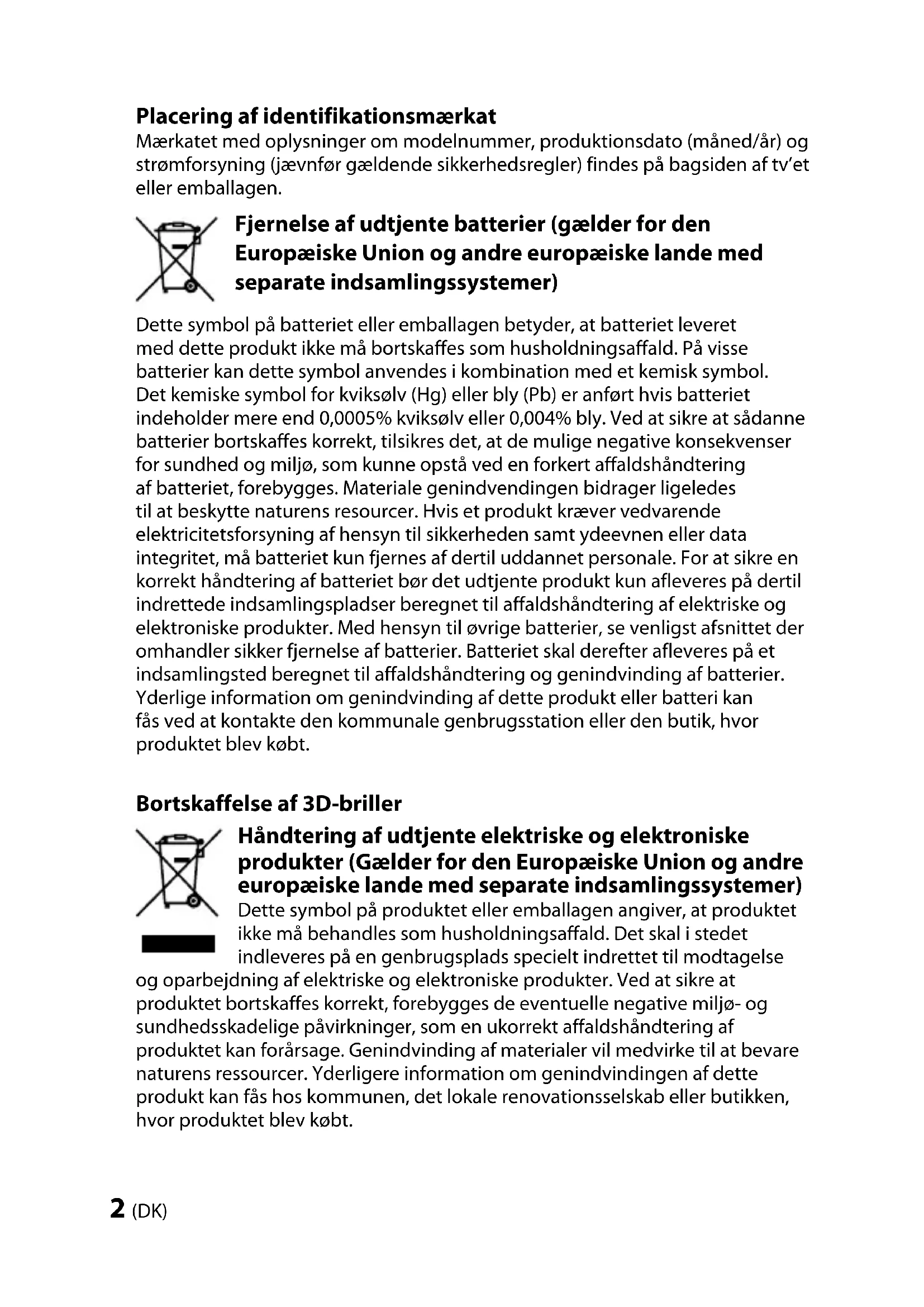 2 (DK) TDG-BR750 4-417-747-22(1) TDG-BR750 4-417-747-22(1) Placering af identifikationsmærkat Mærkatet med oplysninger om modelnummer, produktionsdato (måned/år) og strømforsyning (jævnfør gældende sikkerhedsregler) findes på bagsiden af tv’et eller emballagen. Fjernelse af udtjente batterier (gælder for den Europæiske Union og andre europæiske lande med separate indsamlingssystemer) Dette symbol på batteriet eller emballagen betyder, at batteriet leveret med dette produkt ikke må bortskaffes som husholdningsaffald. På visse batterier kan dette symbol anvendes i kombination med et kemisk symbol. Det kemiske symbol for kviksølv (Hg) eller bly (Pb) er anført hvis batteriet indeholder mere end 0,0005% kviksølv eller 0,004% bly. Ved at sikre at sådanne batterier bortskaffes korrekt, tilsikres det, at de mulige negative konsekvenser for sundhed og miljø, som kunne opstå ved en forkert affaldshåndtering af batteriet, forebygges. Materiale genindvendingen bidrager ligeledes til at beskytte naturens resourcer. Hvis et produkt kræver vedvarende elektricitetsforsyning af hensyn til sikkerheden samt ydeevnen eller data integritet, må batteriet kun fjernes af dertil uddannet personale. For at sikre en korrekt håndtering af batteriet bør det udtjente produkt kun afleveres på dertil indrettede indsamlingspladser beregnet til affaldshåndtering af elektriske og elektroniske produkter. Med hensyn til øvrige batterier, se venligst afsnittet der omhandler sikker fjernelse af batterier. Batteriet skal derefter afleveres på et indsamlingsted beregnet til affaldshåndtering og genindvinding af batterier. Yderlige information om genindvinding af dette produkt eller batteri kan fås ved at kontakte den kommunale genbrugsstation eller den butik, hvor produktet blev købt. Bortskaffelse af 3D-briller Håndtering af udtjente elektriske og elektroniske produkter (Gælder for den Europæiske Union og andre europæiske lande med separate indsamlingssystemer) Dette symbol på produktet eller emballagen angiver, at produktet ikke må behandles som husholdningsaffald. Det skal i stedet indleveres på en genbrugsplads specielt indrettet til modtagelse og oparbejdning af elektriske og elektroniske produkter. Ved at sikre at produktet bortskaffes korrekt, forebygges de eventuelle negative miljø- og sundhedsskadelige påvirkninger, som en ukorrekt affaldshåndtering af produktet kan forårsage. Genindvinding af materialer vil medvirke til at bevare naturens ressourcer. Yderligere information om genindvindingen af dette produkt kan fås hos kommunen, det lokale renovationsselskab eller butikken, hvor produktet blev købt.TDG-BR750 4-417-747-22(1) 3 (DK) TDG-BR750 4-417-747-22(1) Producenten af dette produkt er Sony Corporation, 1-7-1 Konan Minato-ku Tokyo, 108-0075 Japan. Den autoriserede repræsentant for EMC og produktsikkerhed er Sony Deutschland GmbH, Hedelfinger Strasse 61, 70327 Stuttgart, Tyskland. For service eller garanti henviser vi til de adresser, som fremgår af vedlagte garantidokument. Forsigtig Sikkerhedsforanstaltningerne nedenfor skal læses for at beskytte dig og undgå tingskade. Advarsel 3D-briller må ikke brændes. 3D-briller må ikke skilles ad. Brug, oplad, opbevar eller efterlad ikke 3D-briller i nærheden af ild eller på steder med en høj temperatur, f.eks. i direkte sollys eller i en bil, der opvarmes af solen. Brug kun det medfølgende USB-kabel. Oplad ikke 3D-brillerne med andet end et Sony 3D-tv eller den anbefalede netadapter til USB-opladning. For oplysninger om Sony-enheder, som er kompatible med 3D, henvises til betjeningsvejledningen, som fulgte med enheden. Der må ikke komme vand eller fremmedlegemer i 3D-brillerne. Forholdsregler ved brug 3D-briller modtager infrarøde signaler fra 3D-synkroniseringssenderen. Der kan opstå fejl i følgende situationer: Når 3D-brillerne ikke er rettet mod 3D-synkroniseringssenderen. Når der er genstande mellem 3D-brillerne og 3D-synkroniseringssenderen. Hvis der er andre enheder, som kommunikerer med infrarødt lys eller lysudstyr, boligopvarmningsudstyr osv. i nærheden, kan dette påvirke deres ydelse. Du skal se direkte hen på tv'et, når du ser tv med 3D-briller. 3D-effekten er utilstrækkelig, og skærmens farve ændres, når du ligger ned eller lægger hovedet på skrå. Sikkerhedsforanstaltninger Du må kun bruge dette produkt til at se 3D-videoer på et kompatibelt Sony-tv.
