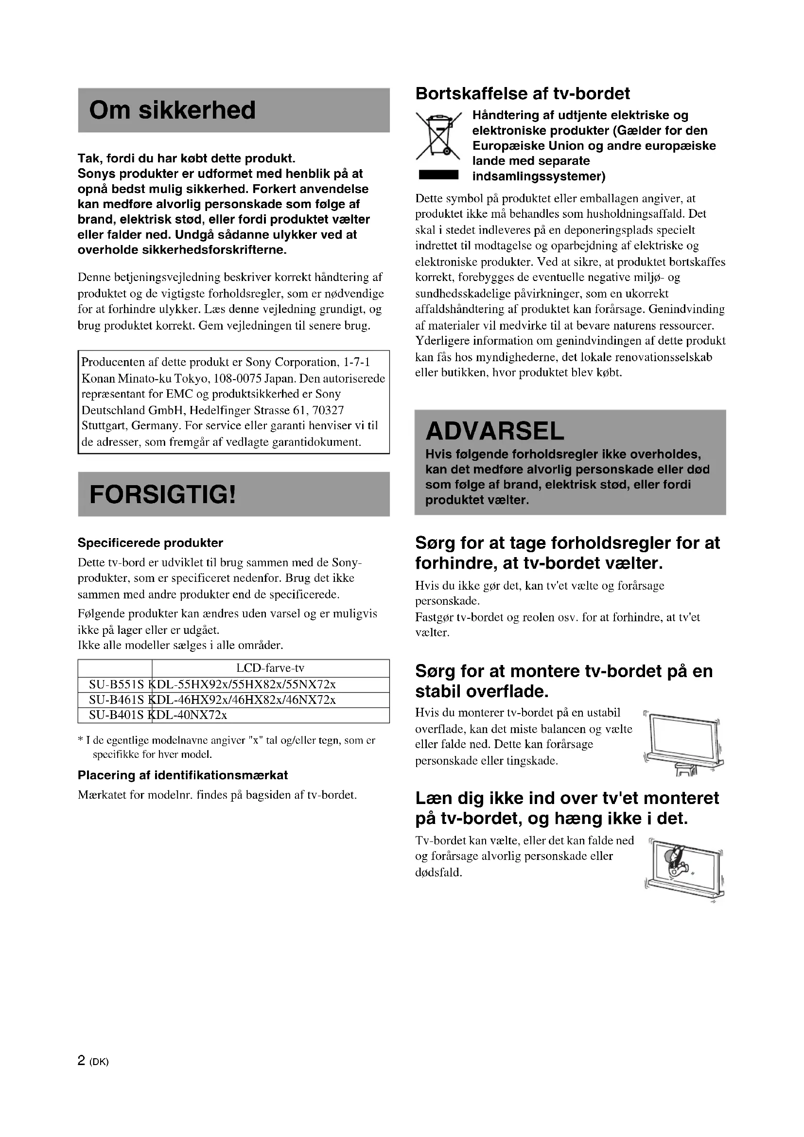 - I de egentlige modelnavne angiver "x" tal og/eller tegn, som er specifikke for hver model. Placering af identifikationsmærkat Mærkatet for modelnr. findes på bagsiden af tv-bordet. Bortskaffelse af tv-bordet Håndtering af udtjente elektriske og elektroniske produkter (Gælder for den Europæiske Union og andre europæiske lande med separate indsamlingssystemer) Dette symbol på produktet eller emballagen angiver, at produktet ikke må behandles som husholdningsaffald. Det skal i stedet indleveres på en deponeringsplads specielt indrettet til modtagelse og oparbejdning af elektriske og elektroniske produkter. Ved at sikre, at produktet bortskaffes korrekt, forebygges de eventuelle negative miljø- og sundhedsskadelige påvirkninger, som en ukorrekt affaldshåndtering af produktet kan forårsage. Genindvinding af materialer vil medvirke til at bevare naturens ressourcer. Yderligere information om genindvindingen af dette produkt kan fås hos myndighederne, det lokale renovationsselskab eller butikken, hvor produktet blev købt. Sørg for at tage forholdsregler for at forhindre, at tv-bordet vælter. Hvis du ikke gør det, kan tv'et vælte og forårsage personskade. Fastgør tv-bordet og reolen osv. for at forhindre, at tv'et vælter. Sørg for at montere tv-bordet på en stabil overflade. Hvis du monterer tv-bordet på en ustabil overflade, kan det miste balancen og vælte eller falde ned. Dette kan forårsage personskade eller tingskade. Læn dig ikke ind over tv'et monteret på tv-bordet, og hæng ikke i det. Tv-bordet kan vælte, eller det kan falde ned og forårsage alvorlig personskade eller dødsfald. Om sikkerhed Producenten af dette produkt er Sony Corporation, 1-7-1 Konan Minato-ku Tokyo, 108-0075 Japan. Den autoriserede repræsentant for EMC og produktsikkerhed er Sony Deutschland GmbH, Hedelfinger Strasse 61, 70327 Stuttgart, Germany. For service eller garanti henviser vi til de adresser, som fremgår af vedlagte garantidokument. FORSIGTIG! LCD-farve-tv SU-B551S KDL-55HX92x/55HX82x/55NX72x SU-B461S KDL-46HX92x/46HX82x/46NX72x SU-B401S KDL-40NX72x ADVARSEL Hvis følgende forholdsregler ikke overholdes, kan det medføre alvorlig personskade eller død som følge af brand, elektrisk stød, eller fordi produktet vælter.3 (DK) Dæk ikke tv'ets ventilationshuller til. Tv'ets ventilationsåbninger er nødvendige for at garantere, at tv'et fungerer pålideligt, og for at beskytte det mod overophedning.