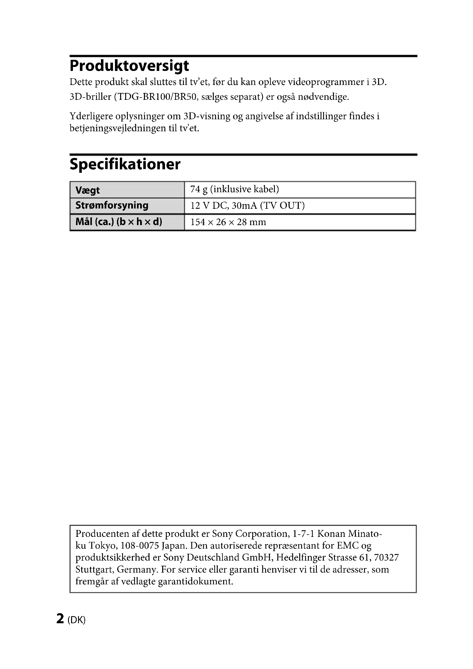 (Fortsættes)TMR-BR100 4-180-471-26(1) 6 (DK) TMR-BR100 4-180-471-26(1) 120˚ Når tv’et placeres på et skab eller et bord: Placer 3D-synkroniseringssenderen ud for midten af tv’et langs forkanten af tv-bordet eller tv-foden. 120˚ Hvis tv’et skal hænges op på en væg, skal 3D- synkroniseringssenderen monteres på tv’et med dobbeltklæbende tape (øverst i midten eller nederst til højre). Juster 3D synkroniseringssenderens vinkel, afhængigt af dens placering. +10˚ –10˚ 120˚ 120˚ 120˚TMR-BR100 4-180-471-26(1) TMR-BR100 4-180-471-26(1) 7 (DK) 3D-synkroniseringssenderens og 3D-brillernes kommunikationsområde Placer 3D-synkroniseringssenderen foran tv’et, og kontroller, at der ikke er hindringer mellem 3D-synkroniseringssenderen og 3D-brillerne. 120˚ typisk 1 m til 6 m typisk 1 m til 6 m 120˚ Set fra oven Set fra siden Tilslutninger Sluk tv’et, og slut 3D-synkroniseringssenderen til tv’ets 3D SYNC-stik. Tænd tv’et, og kontroller, at elementerne i menuen 3D vises på menulisten OPTIONS. Sørg for at slukke tv’et en gang, så tv’et kan genkende 3D-synkroniseringssender. Se betjeningsvejledningen til tv’et angående oplysninger om 3D-visning. Fejlfinding Læs betjeningsvejledningen til tv'et i tilfælde af problemer.TMR-BR100 4-180-471-26(1) 2 (FI) TMR-BR100 4-180-471-26(1) Yleisiä tietoja tuotteesta Kun kytket tämän tuotteen televisioosi, voit katsella ohjelmia kolmiulotteisina. Katseluun tarvitaan 3D-lasit (TDG-BR100/BR50, myydään erikseen). Lisätietoja kolmiulotteisten ohjelmien katselemisesta ja asetusten tekemisestä on television käyttöohjeessa. Tekniset tiedot Paino 74 g (kaapeli mukaan lukien) Virtalähde DC 12 V, 30mA (TV OUT) Mitat (noin) (l × k × s) 154 × 26 × 28 mm Tämän tuotteen valmistaja on Sony Corporation, 1-7-1 Konan Minato-ku Tokyo, 108-0075 Japani. Tuotteen turvallisuuden ja EMC hyväksyjä on Sony Deutschland GmbH, Hedelfinger Strasse 61, 70327 Stuttgart, Saksa. Kaikissa tuotteen huolto- tai takuuasioissa ottakaa yhteys valtuutettuun Sony huoltoon.TMR-BR100 4-180-471-26(1) TMR-BR100 4-180-471-26(1) 3 (FI)