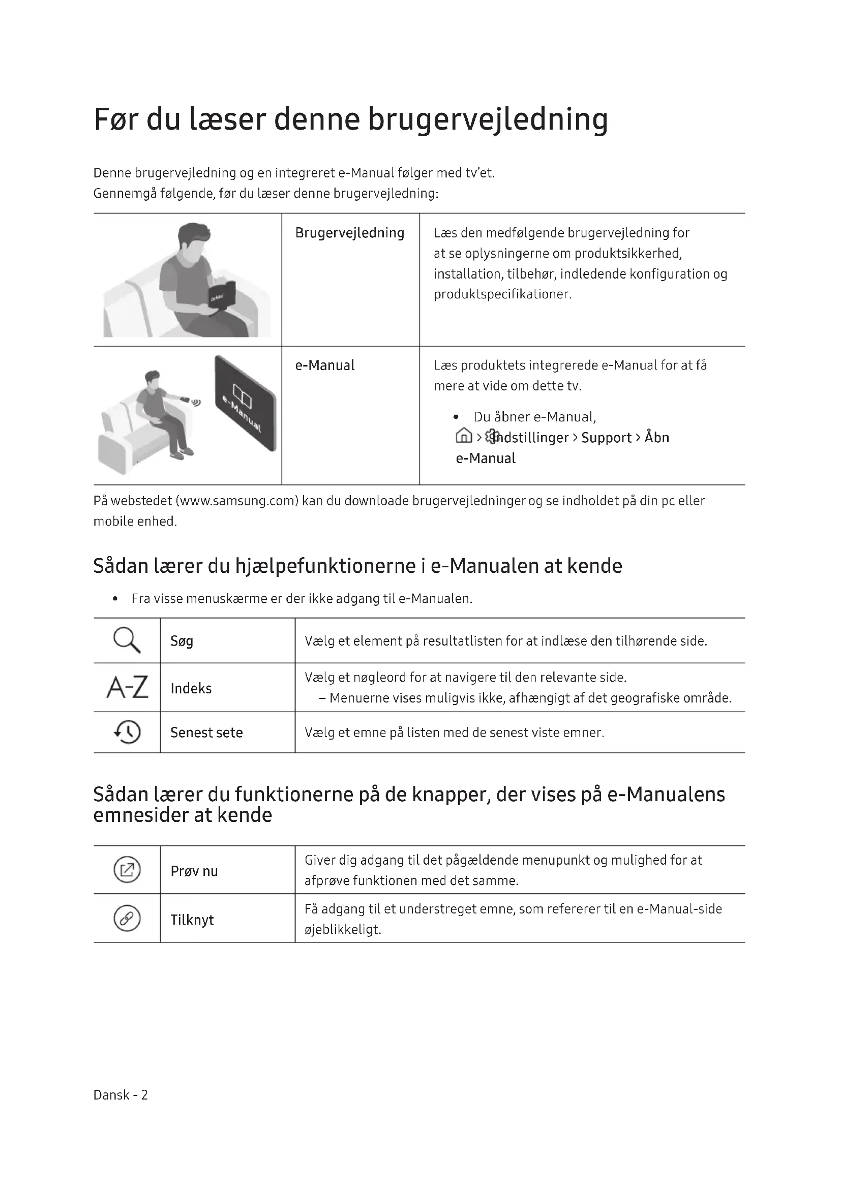 - Du åbner e-Manual, > Indstillinger > Support > Åbn e-Manual På webstedet (www.samsung.com) kan du downloade brugervejledninger og se indholdet på din pc eller mobile enhed. Sådan lærer du hjælpefunktionerne i e-Manualen at kende