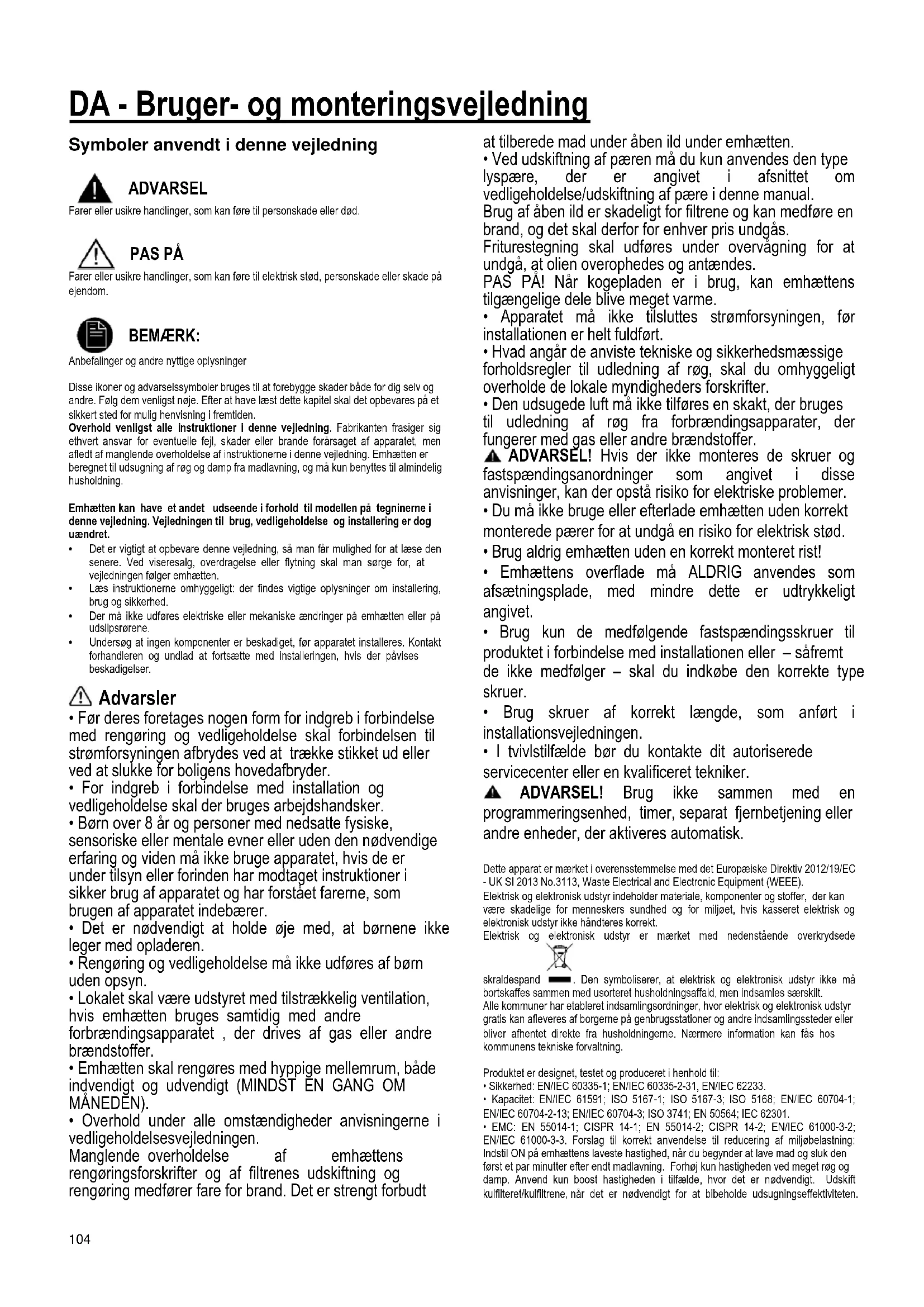 - I tvivlstilfælde bør du kontakte dit autoriserede servicecenter eller en kvalificeret tekniker. ADVARSEL! Brug ikke sammen med en programmeringsenhed, timer, separat fjernbetjening eller andre enheder, der aktiveres automatisk. Dette apparat er mærket i overensstemmelse med det Europæiske Direktiv 2012/19/EC - UK SI 2013 No.3113, Waste Electrical and Electronic Equipment (WEEE). Elektrisk og elektronisk udstyr indeholder materiale, komponenter og stoffer, der kan være skadelige for menneskers sundhed og for miljøet, hvis kasseret elektrisk og elektronisk udstyr ikke håndteres korrekt. Elektrisk og elektronisk udstyr er mærket med nedenstående overkrydsede skraldespand . Den symboliserer, at elektrisk og elektronisk udstyr ikke må bortskaffes sammen med usorteret husholdningsaffald, men indsamles særskilt. Alle kommuner har etableret indsamlingsordninger, hvor elektrisk og elektronisk udstyr gratis kan afleveres af borgerne på genbrugsstationer og andre indsamlingssteder eller bliver afhentet direkte fra husholdningerne. Nærmere information kan fås hos kommunens tekniske forvaltning. Produktet er designet, testet og produceret i henhold til: