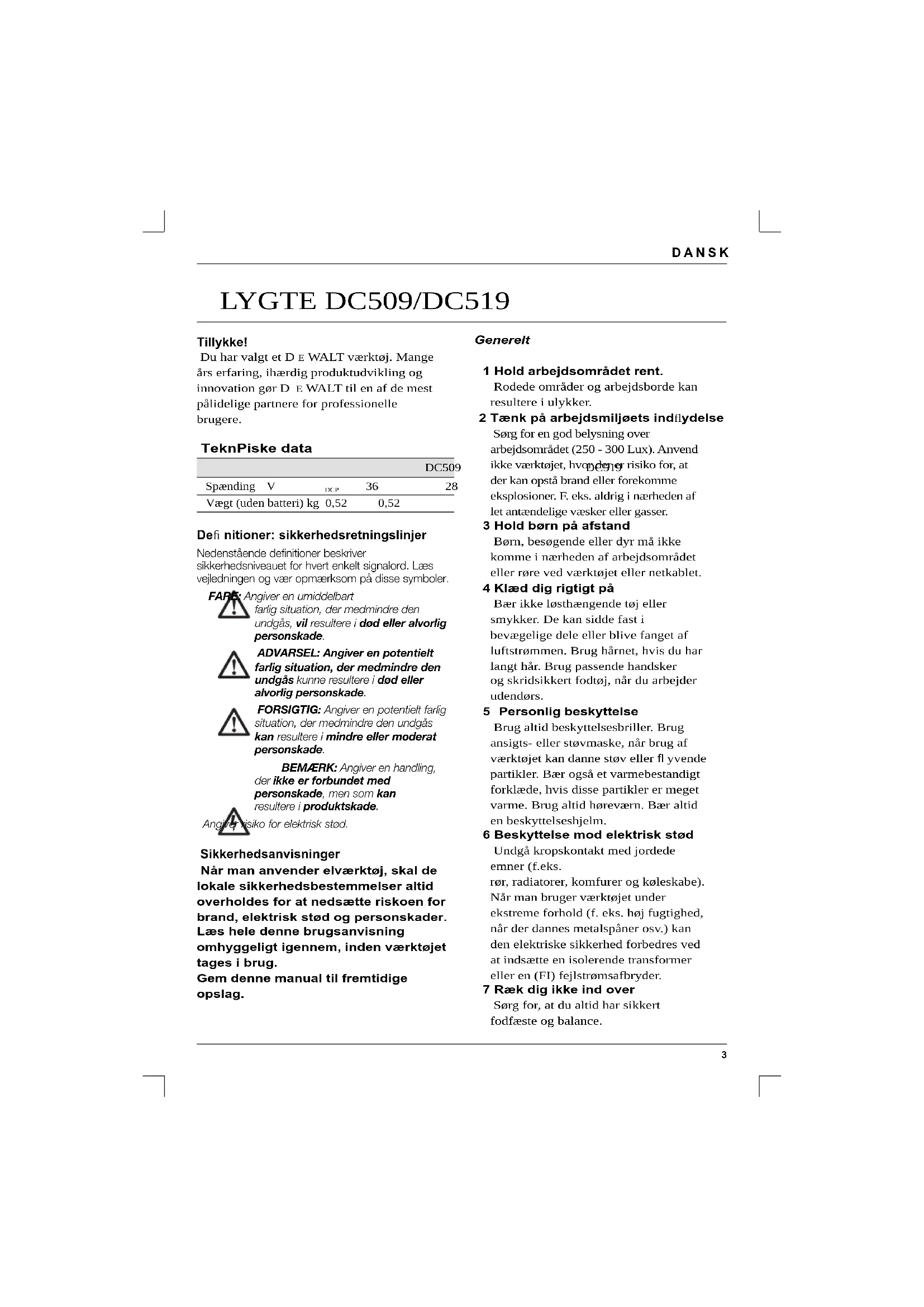 Vægt (uden batteri) kg 0,52 0,52 Defi nitioner: sikkerhedsretningslinjer Nedenstående definitioner beskriver sikkerhedsniveauet for hvert enkelt signalord. Læs vejledningen og vær opmærksom på disse symboler. FARE: Angiver en umiddelbart farlig situation, der medmindre den undgås, vil resultere i død eller alvorlig personskade. ADVARSEL: Angiver en potentielt farlig situation, der medmindre den undgås kunne resultere i død eller alvorlig personskade. FORSIGTIG: Angiver en potentielt farlig situation, der medmindre den undgås kan resultere i mindre eller moderat personskade. BEMÆRK: Angiver en handling, der ikke er forbundet med personskade, men som kan resultere i produktskade. Angiver risiko for elektrisk stød. Sikkerhedsanvisninger Når man anvender elværktøj, skal de lokale sikkerhedsbestemmelser altid overholdes for at nedsætte riskoen for brand, elektrisk stød og personskader. Læs hele denne brugsanvisning omhyggeligt igennem, inden værktøjet tages i brug. Gem denne manual til fremtidige opslag. Generelt 1 Hold arbejdsområdet rent. Rodede områder og arbejdsborde kan resultere i ulykker. 2 Tænk på arbejdsmiljøets indfl ydelse Sørg for en god belysning over arbejdsområdet (250 - 300 Lux). Anvend ikke værktøjet, hvor der er risiko for, at der kan opstå brand eller forekomme eksplosioner. F. eks. aldrig i nærheden af let antændelige væsker eller gasser. 3 Hold børn på afstand Børn, besøgende eller dyr må ikke komme i nærheden af arbejdsområdet eller røre ved værktøjet eller netkablet. 4 Klæd dig rigtigt på Bær ikke løsthængende tøj eller smykker. De kan sidde fast i bevægelige dele eller blive fanget af luftstrømmen. Brug hårnet, hvis du har langt hår. Brug passende handsker og skridsikkert fodtøj, når du arbejder udendørs. 5 Personlig beskyttelse Brug altid beskyttelsesbriller. Brug ansigts- eller støvmaske, når brug af værktøjet kan danne støv eller fl yvende partikler. Bær også et varmebestandigt forklæde, hvis disse partikler er meget varme. Brug altid høreværn. Bær altid en beskyttelseshjelm. 6 Beskyttelse mod elektrisk stød Undgå kropskontakt med jordede emner (f.eks. rør, radiatorer, komfurer og køleskabe). Når man bruger værktøjet under ekstreme forhold (f. eks. høj fugtighed, når der dannes metalspåner osv.) kan den elektriske sikkerhed forbedres ved at indsætte en isolerende transformer eller en (FI) fejlstrømsafbryder. 7 Ræk dig ikke ind over Sørg for, at du altid har sikkert fodfæste og balance.4 DANSK 8 Vær opmærksom Se på det, du foretager dig. Brug din sunde fornuft. Brug ikke værktøjet, når du er træt. 9 Brug egnet værktøj Denne instruktionsbog rummer en beskrivelse af de formål, som dette værktøj er beregnet til. Tving ikke små maskiner eller tilbehør til at udføre et arbejde, som kræver en kraftig maskine. Værktøjet gør arbejdet bedre og sikrere ved den hastighed, som det er beregnet til. Værktøjet må ikke forceres. ADVARSEL! Anvendelse af alt andet tilbehør eller udstyr eller udførelse af andre opgaver med dette værktøj end de, der anbefales i dette manual, kan medføre risiko for personskader. 10 Kontrollér værktøjet for beskadigede dele Kontrollér omhyggeligt værktøjet og netkablet for beskadigelser, før det tages i brug. Check de bevægelige dele for skæv indstilling og sammenbrændinger, brud på dele, skader på skærme og kontakter samt alt andet, der kan påvirke værktøjets funktion. Kontrollér, at værktøjet fungerer rigtigt og kan udføre det arbejde, det er beregnet til. Værktøjet må ikke benyttes, hvis én af delene er beskadiget eller defekt. Brug ikke værktøjet, hvis det ikke kan tændes og slukkes ved afbryderen. Alle skadede eller defekte dele skal repareres eller udskiftes på et autoriseret D E WALT-værksted. Forsøg aldrig selv at reparere værktøjet. 11 Fjern batteriet Tag altid batteriet ud, når det ikke er i brug, og før du udskifter nogen som helst værktøjsdel, noget som helst tilbehør eller udstyr, og før der foretages service. 12 Opbevar værktøjet sikkert, når det ikke bruges Når værktøjet ikke er i brug, skal det opbevares på et tørt, sikkert afl åst sted eller uden for børns rækkevidde. 13 Vedligehold værktøjet omhyggeligt Værktøjet skal holdes rent og i god stand, for at det kan fungere bedst og sikrest. Følg vejledningerne for vedligeholdelse og udskiftning af tilbehør. Hold alle håndtag og kontakter tørre, rene og fri for olie og fedt. 14 Reparationer Dette værktøj opfylder de relevante sikkerhedsbestemmelser. Få dit værktøj repareret på et autoriseret
