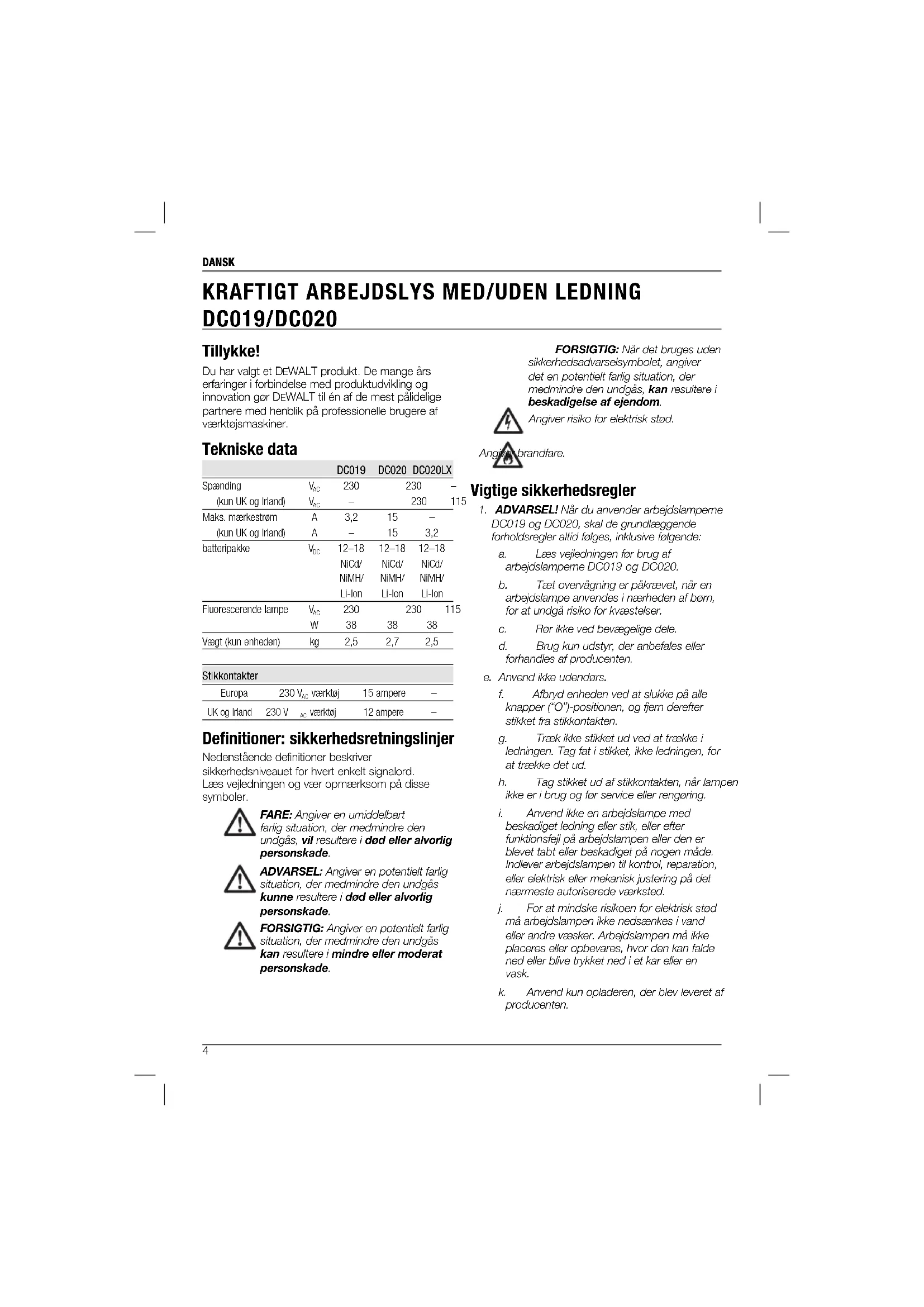 beskadiget ledning eller stik, eller efter funktionsfejl på arbejdslampen eller den er blevet tabt eller beskadiget på nogen måde. Indlever arbejdslampen til kontrol, reparation, eller elektrisk eller mekanisk justering på det nærmeste autoriserede værksted. j. For at mindske risikoen for elektrisk stød må arbejdslampen ikke nedsænkes i vand eller andre væsker. Arbejdslampen må ikke placeres eller opbevares, hvor den kan falde ned eller blive trykket ned i et kar eller en vask. k. Anvend kun opladeren, der blev leveret af producenten. Tillykke! Du har valgt et DEWALT produkt. De mange års erfaringer i forbindelse med produktudvikling og innovation gør D EWALT til én af de mest pålidelige partnere med henblik på professionelle brugere af værktøjsmaskiner. Tekniske data DC019 DC020 DC020LX Spænding V