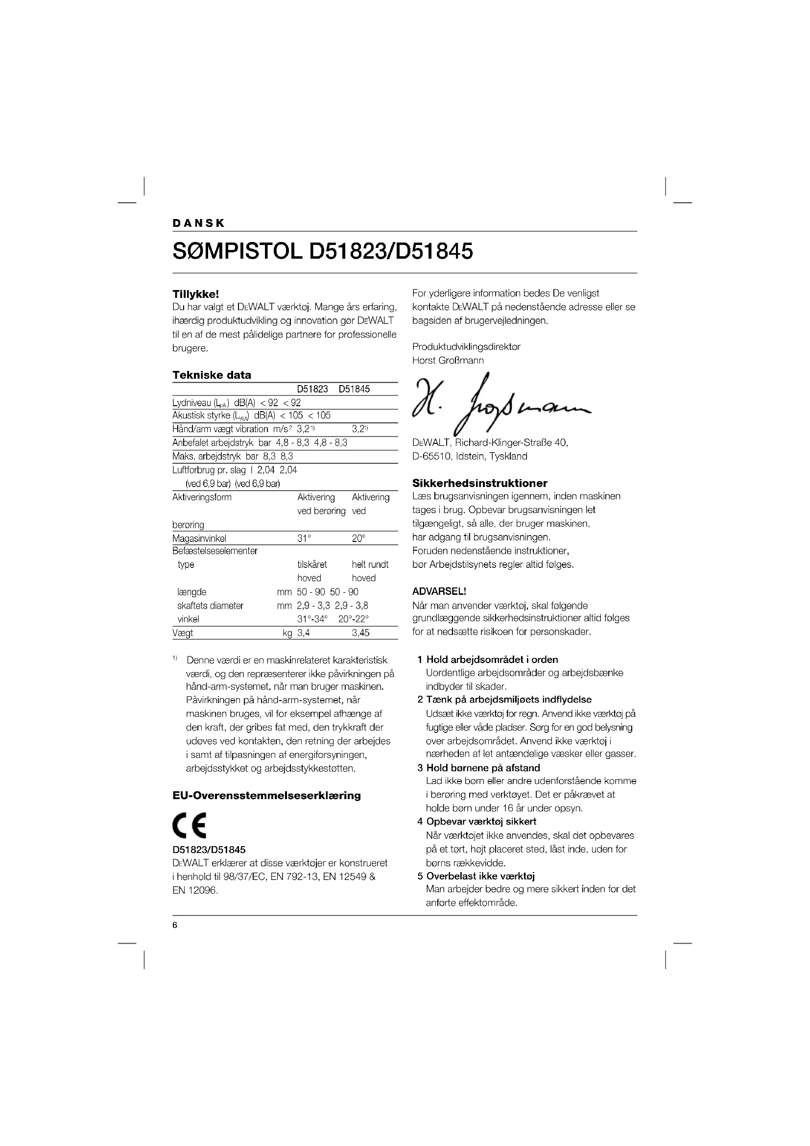 Denne værdi er en maskinrelateret karakteristisk værdi, og den repræsenterer ikke påvirkningen på hånd-arm-systemet, når man bruger maskinen. Påvirkningen på hånd-arm-systemet, når maskinen bruges, vil for eksempel afhænge af den kraft, der gribes fat med, den trykkraft der udøves ved kontakten, den retning der arbejdes i samt af tilpasningen af energiforsyningen, arbejdsstykket og arbejdsstykkestøtten. EU-Overensstemmelseserklæring D51823/D51845