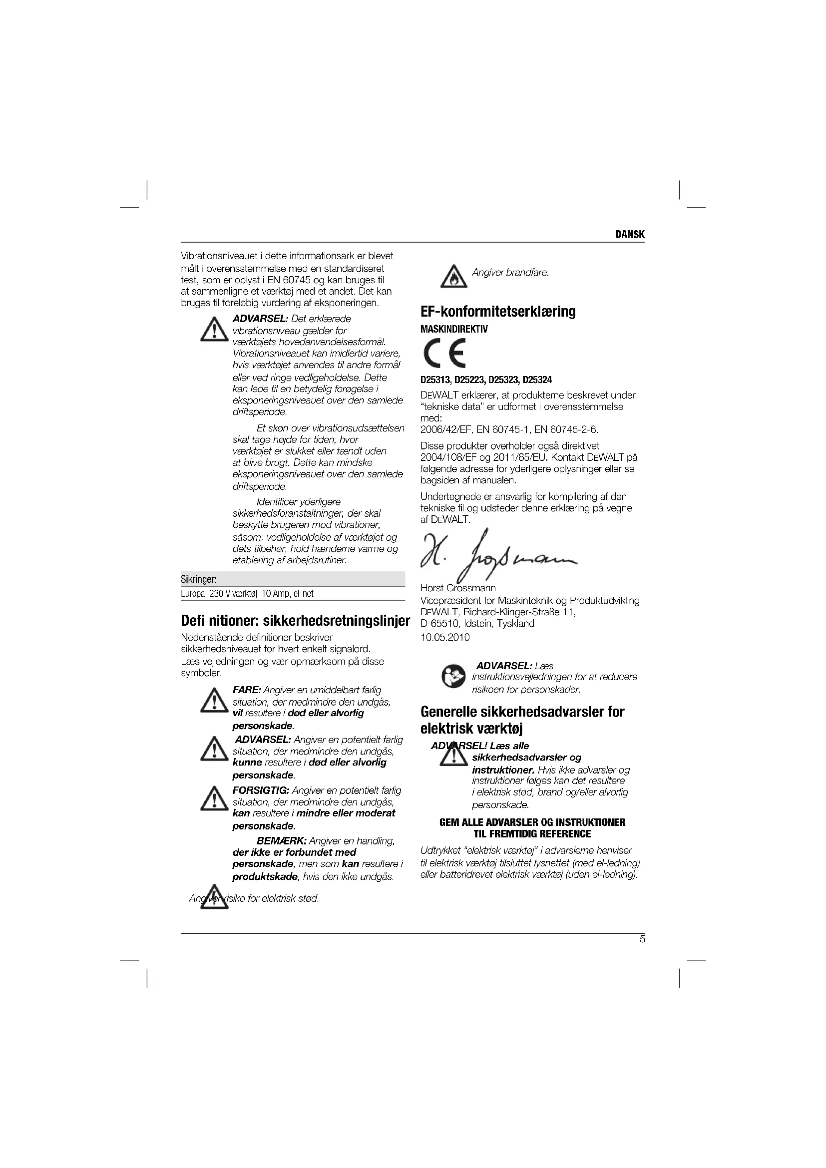Vibrationsniveauet i dette informationsark er blevet målt i overensstemmelse med en standardiseret test, som er oplyst i EN 60745 og kan bruges til at sammenligne et værktøj med et andet. Det kan bruges til foreløbig vurdering af eksponeringen. ADVARSEL: Det erklærede vibrationsniveau gælder for værktøjets hovedanvendelsesformål. Vibrationsniveauet kan imidlertid variere, hvis værktøjet anvendes til andre formål eller ved ringe vedligeholdelse. Dette kan lede til en betydelig forøgelse i eksponeringsniveauet over den samlede driftsperiode. Et skøn over vibrationsudsættelsen skal tage højde for tiden, hvor værktøjet er slukket eller tændt uden at blive brugt. Dette kan mindske eksponeringsniveauet over den samlede driftsperiode. Identificer yderligere sikkerhedsforanstaltninger, der skal beskytte brugeren mod vibrationer, såsom: vedligeholdelse af værktøjet og dets tilbehør, hold hænderne varme og etablering af arbejdsrutiner. Sikringer: Europa 230 V værktøj 10 Amp, el-net Defi nitioner: sikkerhedsretningslinjer Nedenstående definitioner beskriver sikkerhedsniveauet for hvert enkelt signalord. Læs vejledningen og vær opmærksom på disse symboler. FARE: Angiver en umiddelbart farlig situation, der medmindre den undgås, vil resultere i død eller alvorlig personskade. ADVARSEL: Angiver en potentielt farlig situation, der medmindre den undgås, kunne resultere i død eller alvorlig personskade. FORSIGTIG: Angiver en potentielt farlig situation, der medmindre den undgås, kan resultere i mindre eller moderat personskade. BEMÆRK: Angiver en handling, der ikke er forbundet med personskade, men som kan resultere i produktskade, hvis den ikke undgås. Angiver risiko for elektrisk stød. Angiver brandfare. EF-konformitetserklæring MASKINDIREKTIV D25313, D25223, D25323, D25324 DEWALT erklærer, at produkterne beskrevet under “tekniske data” er udformet i overensstemmelse med: 2006/42/EF, EN 60745-1, EN 60745-2-6. Disse produkter overholder også direktivet 2004/108/EF og 2011/65/EU. Kontakt DEWALT på følgende adresse for yderligere oplysninger eller se bagsiden af manualen. Undertegnede er ansvarlig for kompilering af den tekniske fil og udsteder denne erklæring på vegne af DEWALT. Horst Grossmann Vicepræsident for Maskinteknik og Produktudvikling