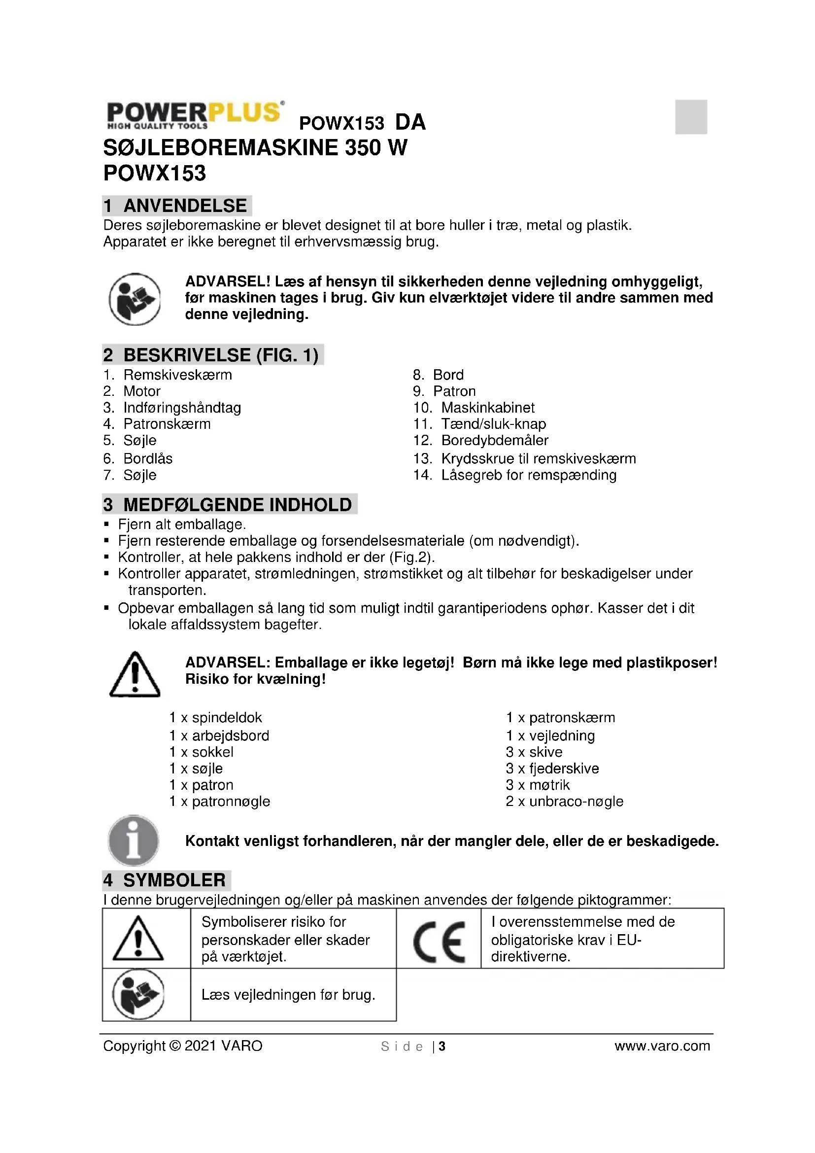 - Det samlede værktøj skal returneres til forhandleren i rimelig ren stand, i den originale blæseformede æske (hvis relevant for enheden) sammen med købsdokumentation. 16 MILJØ Hvis maskinen skal skiftes ud efter lang tids brug, må den ikke bortskaffes som husholdningsaffald, men skal bortskaffes på en miljømæssigt forsvarlig måde. Affald produceret af de elektriske maskiner må ikke behandles som normalt husaffald. Sørg for at genbruge det, hvor der findes egnede anlæg til det. Kontakt den lokale instans eller forhandleren for at få rådgivning om indsamling og bortskaffelse. 17 KONFORMITETSERKLÆRING VARO N.V – Vic. Van Rompuy N.V.- Joseph Van Instraat 9 – BE2500 Lier – Belgien, erklærer hermed, at Apparatbeskrivelse: Søjleboremaskine 350 W Mærke: POWERplus Varenummer: POWX153 er i overensstemmelse med de væsentlige krav og andre relevante bestemmelser i gældende europæiske direktiver, der er baseret på anvendelse af europæiske harmoniserede standarder. Enhver uautoriseret modifikation af apparatet ugyldiggør denne erklæring. EU-direktiver (herunder eventuelle tillæg frem til datoen for undertegnelsen): 2011/65/EU 2006/42/EC 2014/30/EU Harmoniserede europæiske standarder (herunder eventuelle tillæg frem til datoen for undertegnelsen): EN62841-1 : 2015 EN62841-3-13 : 2017 EN55014-1 : 2017 EN55014-2 : 2015 EN61000-3-2 : 2014 EN61000-3-3 : 2013 Indehaver af den tekniske dokumentation: Philippe Vankerkhove, VARO - Vic. Van Rompuy N.V. Undertegnede handler på vegne af selskabets administrerende direktør, Philippe Vankerkhove Regulatory Affairs (afdelingen for juridiske anliggender) – Compliance Manager 21/01/2021, Lier - BelgiumPOWX153 SV Copyright © 2021 VARO S i d a | 1 www.varo.com