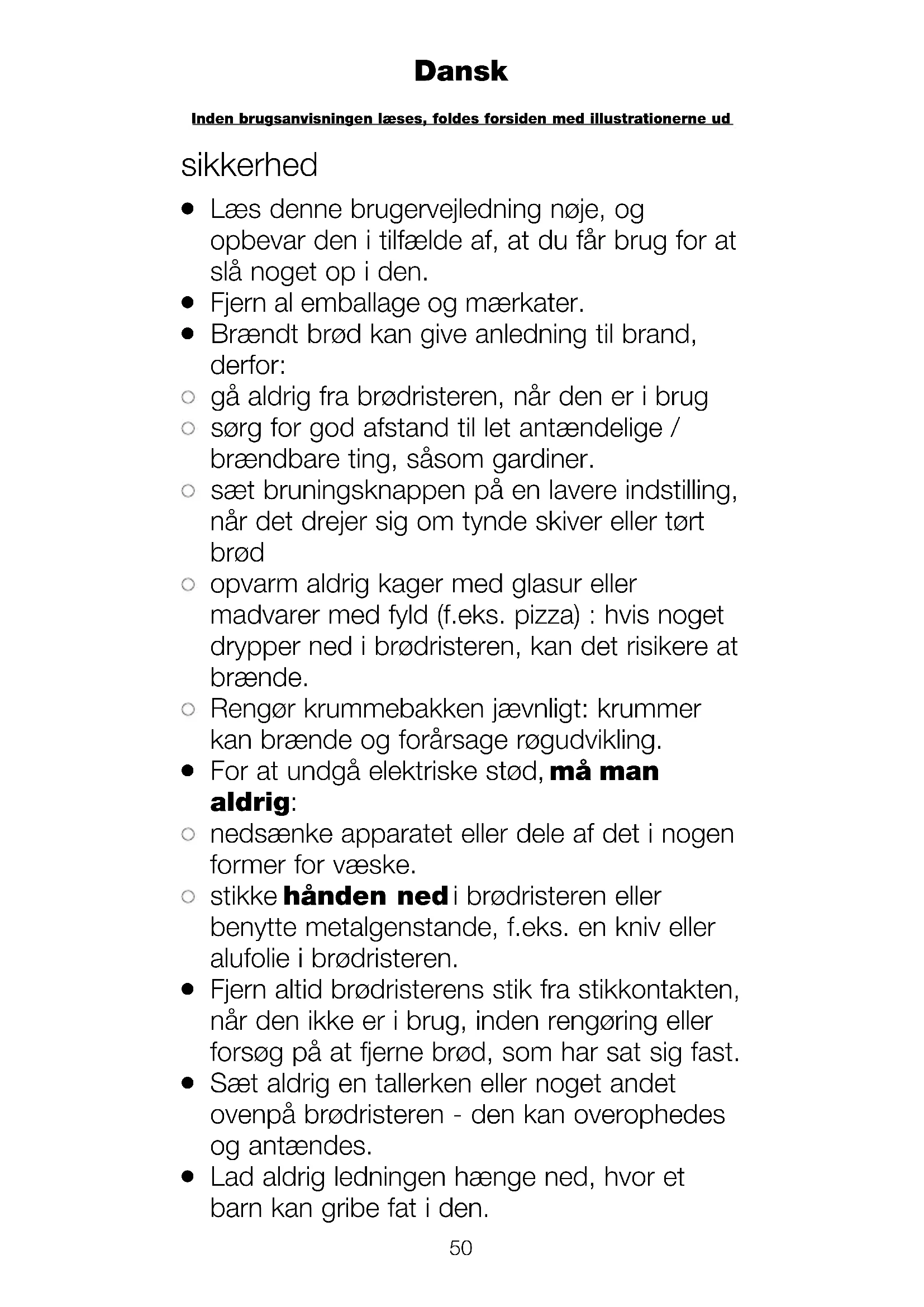 Brændt brød kan give anledning til brand, derfor: gå aldrig fra brødristeren, når den er i brug sørg for god afstand til let antændelige / brændbare ting, såsom gardiner. sæt bruningsknappen på en lavere indstilling, når det drejer sig om tynde skiver eller tørt brød