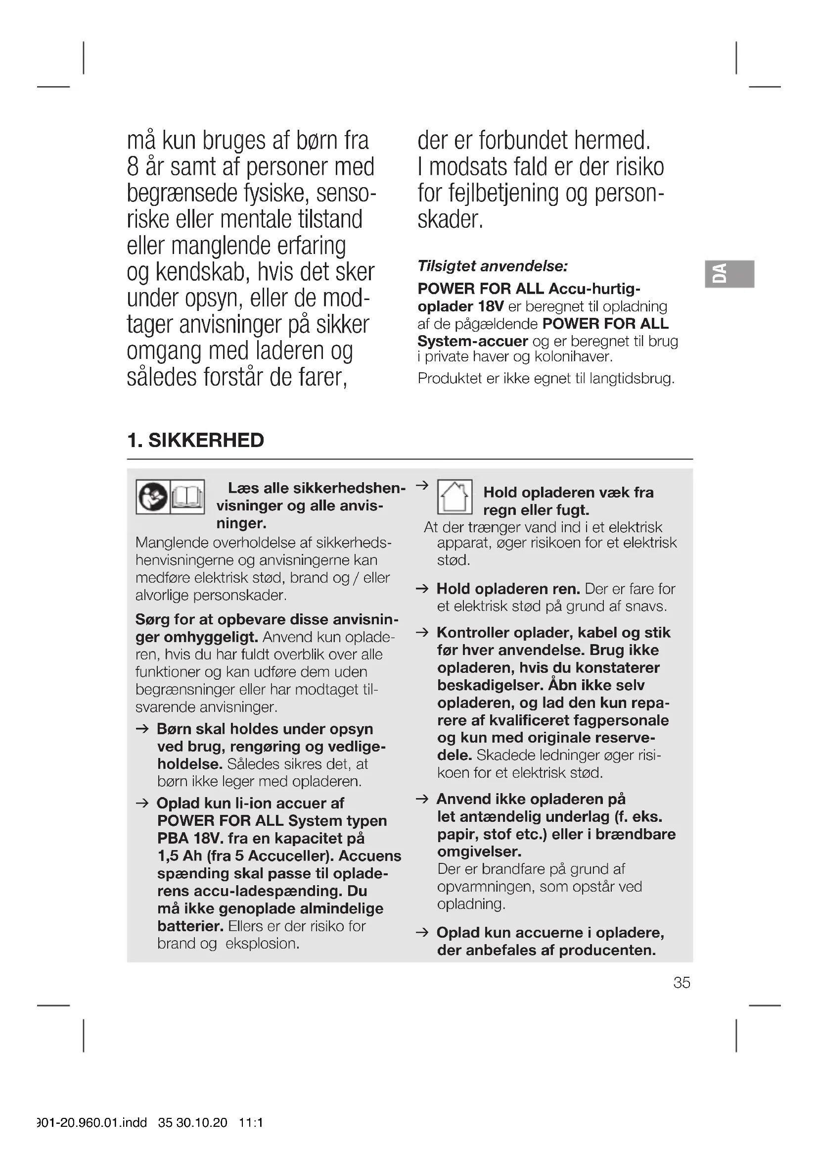 14901-20.960.01.indd 34 30.10.20 11:12må kun bruges af børn fra 8år samt af personer med begrænsede fysiske, senso- riske eller mentale tilstand eller manglende erfaring ogkendskab, hvis det sker under opsyn, eller de mod- tager anvisninger på sikker omgang med laderen og således forstår de farer, derer forbundet hermed. Imodsats fald er der risiko for fejlbetjening og person- skader. Tilsigtet anvendelse: POWER FOR ALL Accu-hurtig- oplader 18V er beregnet til opladning af de pågældende POWER FOR ALL System-accuer og er beregnet til brug i private haver og kolonihaver. Produktet er ikke egnet til langtidsbrug.
