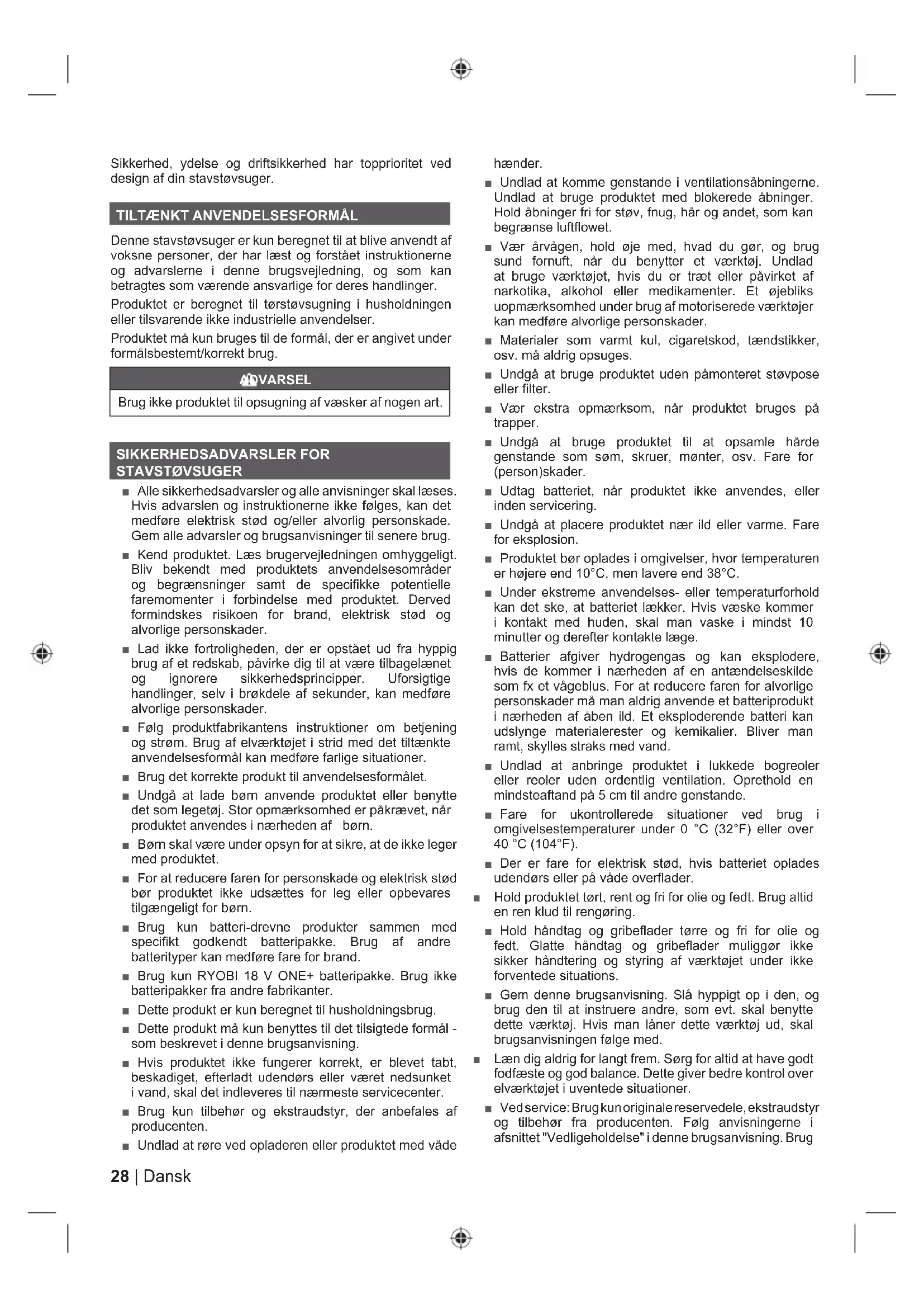Denne stavstøvsuger er kun beregnet til at blive anvendt af voksne personer, der har læst og forstået instruktionerne og advarslerne i denne brugsvejledning, og som kan betragtes som værende ansvarlige for deres handlinger. Produktet er beregnet til tørstøvsugning i husholdningen eller tilsvarende ikke industrielle anvendelser. Produktet må kun bruges til de formål, der er angivet under formålsbestemt/korrekt brug. ADVARSEL Brug ikke produktet til opsugning af væsker af nogen art. SIKKERHEDSADVARSLER FOR STAVSTØVSUGER ■ Alle sikkerhedsadvarsler og alle anvisninger skal læses. Hvis advarslen og instruktionerne ikke følges, kan det medføre elektrisk stød og/eller alvorlig personskade. Gem alle advarsler og brugsanvisninger til senere brug. ■ Kend produktet. Læs brugervejledningen omhyggeligt. Bliv bekendt med produktets anvendelsesområder og begrænsninger samt de specifikke potentielle faremomenter i forbindelse med produktet. Derved formindskes risikoen for brand, elektrisk stød og alvorlige personskader. ■ Lad ikke fortroligheden, der er opstået ud fra hyppig brug af et redskab, påvirke dig til at være tilbagelænet og ignorere sikkerhedsprincipper. Uforsigtige handlinger, selv i brøkdele af sekunder, kan medføre alvorlige personskader. ■ Følg produktfabrikantens instruktioner om betjening og strøm. Brug af elværktøjet i strid med det tiltænkte anvendelsesformål kan medføre farlige situationer. ■ Brug det korrekte produkt til anvendelsesformålet. ■ Undgå at lade børn anvende produktet eller benytte det som legetøj. Stor opmærksomhed er påkrævet, når produktet anvendes i nærheden af børn. ■ Børn skal være under opsyn for at sikre, at de ikke leger med produktet. ■ For at reducere faren for personskade og elektrisk stød bør produktet ikke udsættes for leg eller opbevares tilgængeligt for børn. ■ Brug kun batteri-drevne produkter sammen med specifikt godkendt batteripakke. Brug af andre batterityper kan medføre fare for brand. ■ Brug kun RYOBI 18 V ONE+ batteripakke. Brug ikke batteripakker fra andre fabrikanter. ■ Dette produkt er kun beregnet til husholdningsbrug. ■ Dette produkt må kun benyttes til det tilsigtede formål - som beskrevet i denne brugsanvisning. ■ Hvis produktet ikke fungerer korrekt, er blevet tabt, beskadiget, efterladt udendørs eller været nedsunket i vand, skal det indleveres til nærmeste servicecenter. ■ Brug kun tilbehør og ekstraudstyr, der anbefales af producenten. ■ Undlad at røre ved opladeren eller produktet med våde hænder. ■ Undlad at komme genstande i ventilationsåbningerne. Undlad at bruge produktet med blokerede åbninger. Hold åbninger fri for støv, fnug, hår og andet, som kan begrænse luftflowet. ■ Vær årvågen, hold øje med, hvad du gør, og brug sund fornuft, når du benytter et værktøj. Undlad at bruge værktøjet, hvis du er træt eller påvirket af narkotika, alkohol eller medikamenter. Et øjebliks uopmærksomhed under brug af motoriserede værktøjer kan medføre alvorlige personskader. ■ Materialer som varmt kul, cigaretskod, tændstikker, osv. må aldrig opsuges. ■ Undgå at bruge produktet uden påmonteret støvpose eller filter. ■ Vær ekstra opmærksom, når produktet bruges på trapper. ■ Undgå at bruge produktet til at opsamle hårde genstande som søm, skruer, mønter, osv. Fare for (person)skader. ■ Udtag batteriet, når produktet ikke anvendes, eller inden servicering. ■ Undgå at placere produktet nær ild eller varme. Fare for eksplosion. ■ Produktet bør oplades i omgivelser, hvor temperaturen er højere end 10°C, men lavere end 38°C. ■ Under ekstreme anvendelses- eller temperaturforhold kan det ske, at batteriet lækker. Hvis væske kommer i kontakt med huden, skal man vaske i mindst 10 minutter og derefter kontakte læge. ■ Batterier afgiver hydrogengas og kan eksplodere, hvis de kommer i nærheden af en antændelseskilde som fx et vågeblus. For at reducere faren for alvorlige personskader må man aldrig anvende et batteriprodukt i nærheden af åben ild. Et eksploderende batteri kan udslynge materialerester og kemikalier. Bliver man ramt, skylles straks med vand. ■ Undlad at anbringe produktet i lukkede bogreoler eller reoler uden ordentlig ventilation. Oprethold en mindsteaftand på 5 cm til andre genstande. ■ Fare for ukontrollerede situationer ved brug i omgivelsestemperaturer under 0 °C (32°F) eller over 40 °C (104°F). ■ Der er fare for elektrisk stød, hvis batteriet oplades udendørs eller på våde overflader. ■ Hold produktet tørt, rent og fri for olie og fedt. Brug altid en ren klud til rengøring. ■ Hold håndtag og gribeflader tørre og fri for olie og fedt. Glatte håndtag og gribeflader muliggør ikke sikker håndtering og styring af værktøjet under ikke forventede situations. ■ Gem denne brugsanvisning. Slå hyppigt op i den, og brug den til at instruere andre, som evt. skal benytte dette værktøj. Hvis man låner dette værktøj ud, skal brugsanvisningen følge med. ■ Læn dig aldrig for langt frem. Sørg for altid at have godt fodfæste og god balance. Dette giver bedre kontrol over elværktøjet i uventede situationer. ■ Ved service: Brug kun originale reservedele, ekstraudstyr og tilbehør fra producenten. Følg anvisningerne i afsnittet "Vedligeholdelse" i denne brugsanvisning. Brug29 Dansk |