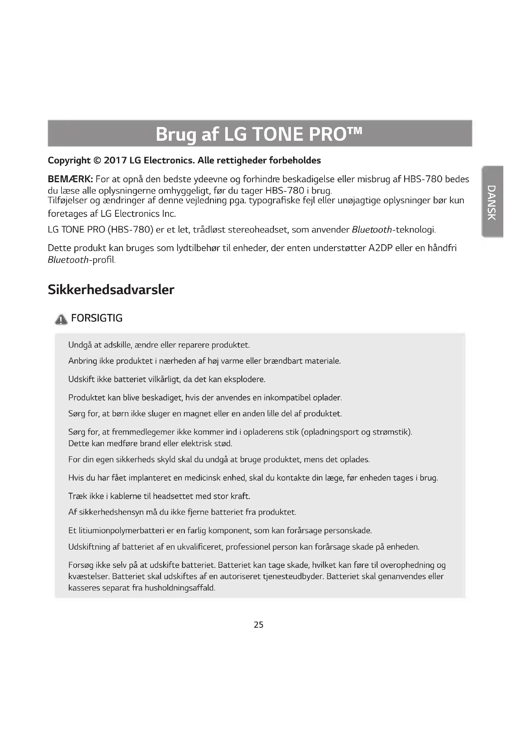 - Doba užívání se může lišit vzávislosti na připojeném mobilním zařízení, používaných funkcích, nastavení, síle signálu, provozní teplotě, frekvenčním pásmu a dalších metodách užívání.25 DANSK Brug af LG TONE PRO™ Copyright © 2017 LG Electronics. Alle rettigheder forbeholdes BEMÆRK: For at opnå den bedste ydeevne og forhindre beskadigelse eller misbrug af HBS-780 bedes du læse alle oplysningerne omhyggeligt, før du tager HBS-780 i brug. Tilføjelser og ændringer af denne vejledning pga. typograske fejl eller unøjagtige oplysninger bør kun foretages af LG Electronics Inc. LG TONE PRO (HBS-780) er et let, trådløst stereoheadset, som anvender Bluetooth-teknologi. Dette produkt kan bruges som lydtilbehør til enheder, der enten understøtter A2DP eller en håndfri Bluetooth-prol. Sikkerhedsadvarsler