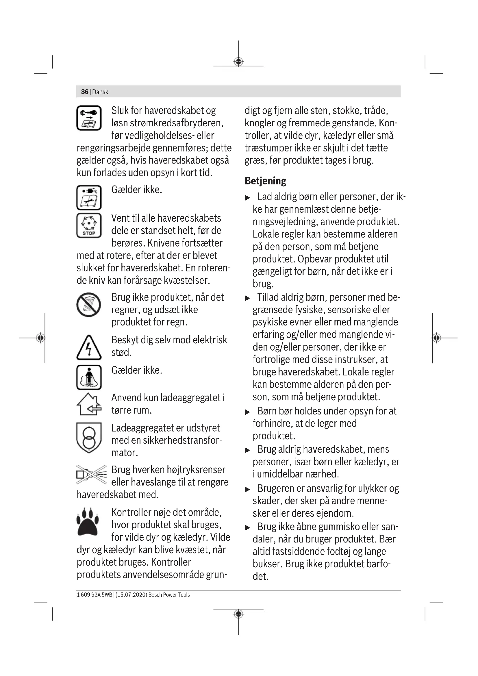 Om de gebruiksduur te verlengen, kunt u via een erkende klantenservice voor Bosch tuingereedschappen een extra accu aanschaffen. Storingen opsporen Symptoom Mogelijke oorzaak Oplossing Motor start niet Interne bekabeling van tuingereedschap defect Neem contact op met de klantenservice van Bosch Accu leeg Laad de accu op Bosch Power Tools 1 609 92A 5WB | (15.07.2020)84 | Nederlands Symptoom Mogelijke oorzaak Oplossing Accu te koud of te heet Accu laten opwarmen of afkoelen Gras te lang Max. toegestane grashoogte is 30cm met de grootste maaihoogte-instelling Motorbeveiliging aangesproken Laat de motor afkoelen en stel een grotere maai- hoogte in Stroomkringonderbreker is niet goed of niet volle- dig ingezet Goed inzetten Tuingereedschap loopt met onderbrekingen Interne bekabeling van tuingereedschap defect Neem contact op met de klantenservice van Bosch Motorbeveiliging aangesproken Laat de motor afkoelen en stel een grotere maai- hoogte in Tuingereedschap laat onregelmatig maai- beeld achter en/of motor werkt moeilijk Maaihoogte te laag Grotere maaihoogte instellen Messen bot Messen vervangen (zie afbeelding K) Verstopping mogelijk Tuingereedschap uitschakelen en stroomkringon- derbreker losmaken Onderzijde van het tuingereedschap controleren en indien nodig vrij maken (draag altijd tuinhand- schoenen) Mes omgekeerd gemonteerd Mes goed monteren Na het inschakelen van het tuingereedschap draait het mes niet Mes wordt gehinderd door gras Tuingereedschap uitschakelen en stroomkringon- derbreker losmaken Verstopping verwijderen (draag altijd tuinhand- schoenen) Moer of schroef van mes los Draai de moer of de schroef van het mes vast (27Nm) Sterke trillingen of ge- luiden Moer of schroef van mes los Draai de moer of de schroef van het mes vast (27Nm) Mes beschadigd Mes vervangen (zie afbeelding K) Accu en oplaadapparaat Symptomen Mogelijke oorzaak Oplossing Rode accuoplaadindi- catie knippert op op- laadapparaat Opladen niet mogelijk Accu niet of niet juist geplaatst Accu juist op oplaadapparaat plaatsen Accucontacten vuil Reinig de accucontacten, bijvoorbeeld door de accu enkele keren te plaatsen en te verwijderen, of vervang de accu indien nodig Accu defect Vervang de accu Accuoplaadindicaties branden niet op het op- laadapparaat Netstekker van het oplaadapparaat niet (of niet goed) vast gestoken Steek de stekker (volledig) in het stopcontact Stopcontact, netsnoer of oplaadapparaat defect Netspanning controleren, oplaadapparaat indien nodig door een erkende klantenservice voor Bosch elektrische gereedschappen laten contro- leren Onderhoud en service Onderhoud van de accu u Let op! Schakel het tuingereedschap uit, maak de stroomkringonderbreker los en verwijder accu en graszak voordat u onderhouds- of reinigingswerk- zaamheden uitvoert. u Draag altijd tuinhandschoenen wanneer u de scherpe messen vastpakt of eraan werkt. Neem de volgende aanwijzingen en maatregelen in acht om een optimaal gebruik van de accu te waarborgen: – Bescherm de accu tegen vocht en water. 1 609 92A 5WB | (15.07.2020) Bosch Power ToolsDansk | 85 – Bewaar het tuingereedschap en de accu alleen in het tem- peratuurbereik tussen –20en 50 °C. Laat de accu bij- voorbeeld in de zomer niet in de auto liggen. – Bewaar de accu apart en niet in het tuingereedschap. – Laat de accu bij fel zonlicht niet in het tuingereedschap zitten. – De optimale temperatuur voor het bewaren van de accu bedraagt 5°C. – Reinig de ventilatieopeningen van de accu af en toe met een zachte, schone en droge kwast. Een duidelijk kortere gebruiksduur na het opladen geeft aan dat de accu versleten is en moet worden vervangen. Klantenservice en gebruiksadvies Onze klantenservice beantwoordt uw vragen over reparatie en onderhoud van uw product en over vervangingsonderde- len. Explosietekeningen en informatie over vervangingson- derdelen vindt u ook op: www.bosch-pt.com Het Bosch-gebruiksadviesteam helpt u graag bij vragen over onze producten en accessoires. Vermeld bij vragen en bestellingen van vervangingsonderde- len altijd het uit tien cijfers bestaande productnummer vol- gens het typeplaatje van het product. Nederland Tel.: (076) 579 54 54 Fax: (076) 579 54 94 E-mail: gereedschappen@nl.bosch.com Meer serviceadressen vindt u onder: www.bosch-pt.com/serviceaddresses Transport Op de meegeleverde Lithium-Ion-accu’s zijn de eisen voor het vervoer van gevaarlijke stoffen van toepassing. De accu’s kunnen door de gebruiker zonder verdere voorwaarden over de weg worden vervoerd. Bij verzending door derden (bijv. luchtvervoer of vervoers- bedrijf) moeten bijzondere eisen ten aanzien van verpakking en markering in acht worden genomen. In deze gevallen moet bij de voorbereiding van de verzending een deskundige voor gevaarlijke goederen worden geraadpleegd. Verzend accu’s alleen als de behuizing onbeschadigd is. Plak blootliggende contacten af en verpak de accu zodanig dat deze niet in de verpakking beweegt. Neem ook eventuele bij- komende nationale voorschriften in acht. Afvalverwijdering Tuingereedschappen, accu’s, toebehoren en verpakkingen moeten op een voor het milieu verantwoorde wijze worden hergebruikt. Gooi tuingereedschappen, accu’s en batterijen niet bij het huisvuil. Alleen voor landen van deEU: Volgens de Europese richtlijn 2012/19/EU moeten niet meer bruikbare elektrische en elektronische apparaten en volgens de Europese richtlijn 2006/66/EG moeten defecte of lege accu’s en batterijen apart worden ingezameld en op een voor het milieu verantwoorde wijze worden hergebruikt. Accu’s en batterijen: Li-ion: Lees de aanwijzingen in het gedeelte Vervoer en neem deze in acht. Dansk Sikkerhedsinstrukser Bemærk! Læs efterfølgende instruk- ser omhyggeligt. Gør dig fortrolig med produktets betjeningsanord- ninger og korrekte anvendelse. Op- bevar betjeningsvejledningen et sik- kert sted til senere brug. Forklaring af symboler på haveredskabet Generel sikkerhedsadvarsel. Læs brugsanvisningen. Pas på, at personer i nærhe- den ikke 