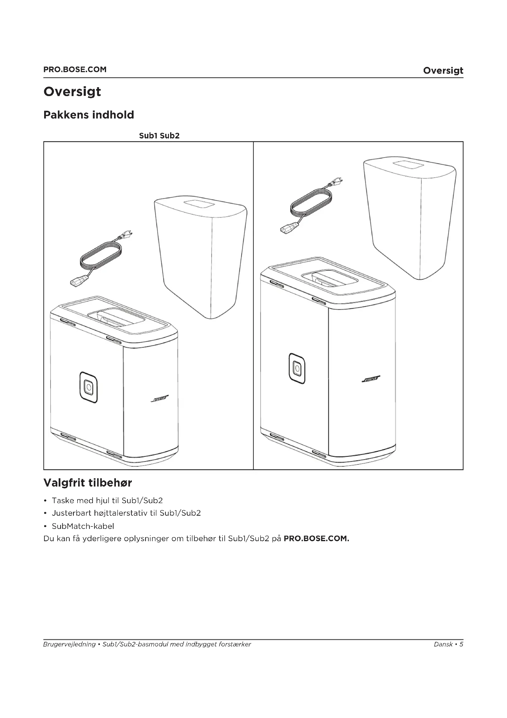 - SubMatch-kabel Du kan få yderligere oplysninger om tilbehør til Sub1/Sub2 på PRO.BOSE.COM.6 • Dansk Sub1/Sub2-basmodul med indbygget forstærker • Brugervejledning