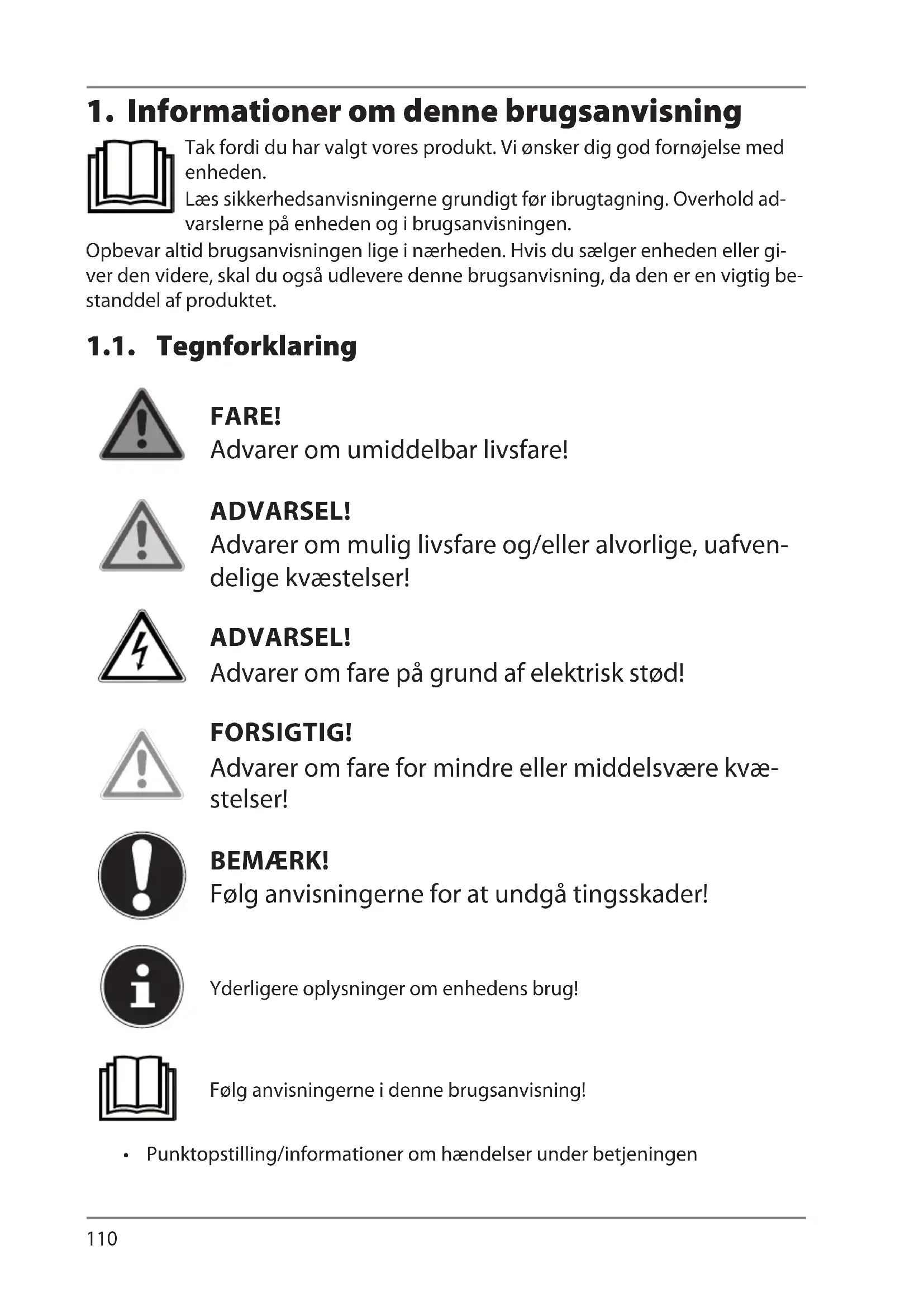Tak fordi du har valgt vores produkt. Vi ønsker dig god fornøjelse med enheden. Læs sikkerhedsanvisningerne grundigt før ibrugtagning. Overhold ad- varslerne på enheden og i brugsanvisningen. Opbevar altid brugsanvisningen lige i nærheden. Hvis du sælger enheden eller gi- ver den videre, skal du også udlevere denne brugsanvisning, da den er en vigtig be- standdel af produktet. 1.1. Tegnforklaring FARE! Advarer om umiddelbar livsfare! ADVARSEL! Advarer om mulig livsfare og/eller alvorlige, uafven- delige kvæstelser! ADVARSEL! Advarer om fare på grund af elektrisk stød! FORSIGTIG! Advarer om fare for mindre eller middelsvære kvæ- stelser! BEMÆRK! Følg anvisningerne for at undgå tingsskader! Yderligere oplysninger om enhedens brug! Følg anvisningerne i denne brugsanvisning!