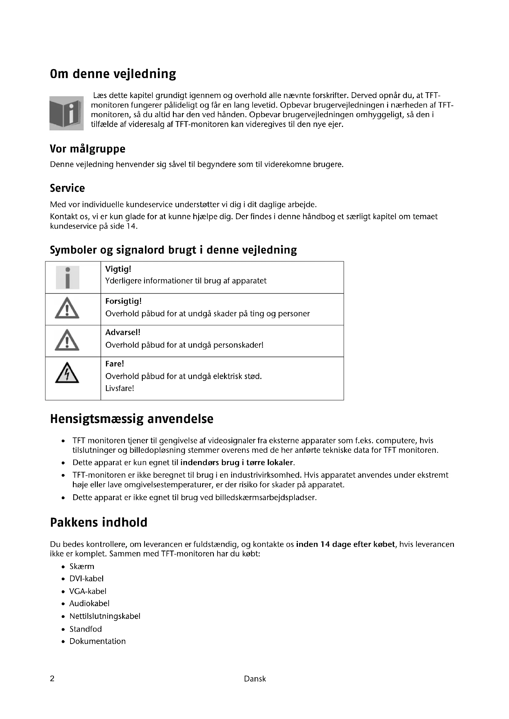 Om denne vejledning Læs dette kapitel grundigt igennem og overhold alle nævnte forskrifter. Derved opnår du, at TFT- monitoren fungerer pålideligt og får en lang levetid. Opbevar brugervejledningen i nærheden af TFT- monitoren, så du altid har den ved hånden. Opbevar brugervejledningen omhyggeligt, så den i tilfælde af videresalg af TFT-monitoren kan videregives til den nye ejer. Vor målgruppe Denne vejledning henvender sig såvel til begyndere som til viderekomne brugere. Service Med vor individuelle kundeservice understøtter vi dig i dit daglige arbejde. Kontakt os, vi er kun glade for at kunne hjælpe dig. Der findes i denne håndbog et særligt kapitel om temaet kundeservice på side 14. Symboler og signalord brugt i denne vejledning Vigtig! Yderligere informationer til brug af apparatet Forsigtig! Overhold påbud for at undgå skader på ting og personer Advarsel! Overhold påbud for at undgå personskader! Fare! Overhold påbud for at undgå elektrisk stød. Livsfare! Hensigtsmæssig anvendelse TFT monitoren tjener til gengivelse af videosignaler fra eksterne apparater som f.eks. computere, hvis tilslutninger og billedopløsning stemmer overens med de her anførte tekniske data for TFT monitoren. Dette apparat er kun egnet til indendørs brug i tørre lokaler. TFT-monitoren er ikke beregnet til brug i en industrivirksomhed. Hvis apparatet anvendes under ekstremt høje eller lave omgivelsestemperaturer, er der risiko for skader på apparatet. Dette apparat er ikke egnet til brug ved billedskærmsarbejdspladser. Pakkens indhold Du bedes kontrollere, om leverancen er fuldstændig, og kontakte os inden 14 dage efter købet, hvis leverancen ikke er komplet. Sammen med TFT-monitoren har du købt: Skærm DVI-kabel VGA-kabel Audiokabel Nettilslutningskabel Standfod DokumentationSikkerhedsanvisninger