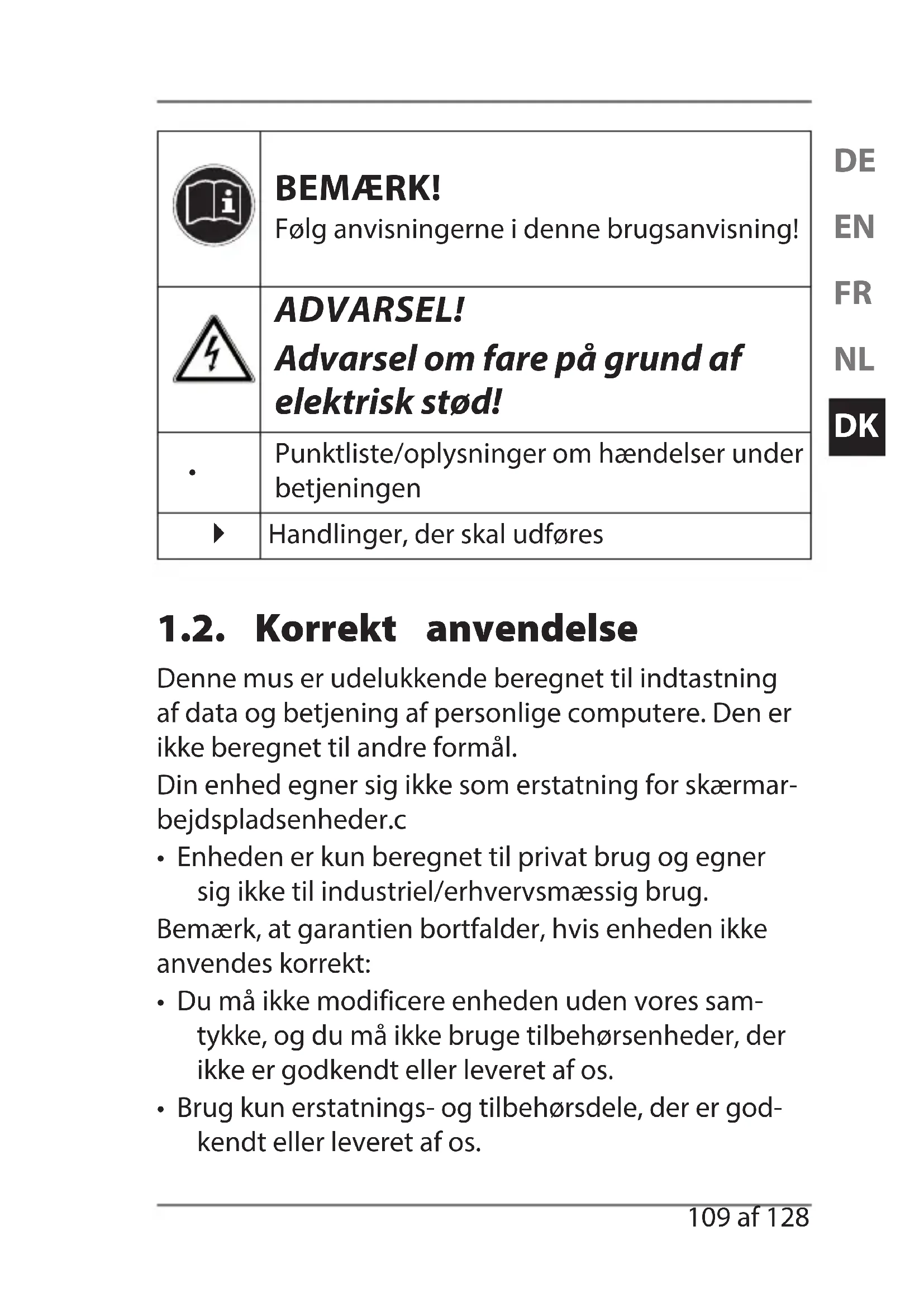 Punktliste/oplysninger om hændelser under betjeningen Handlinger, der skal udføres 1.2. Korrekt anvendelse Denne mus er udelukkende beregnet til indtastning af data og betjening af personlige computere. Den er ikke beregnet til andre formål. Din enhed egner sig ikke som erstatning for skærmar- bejdspladsenheder.c