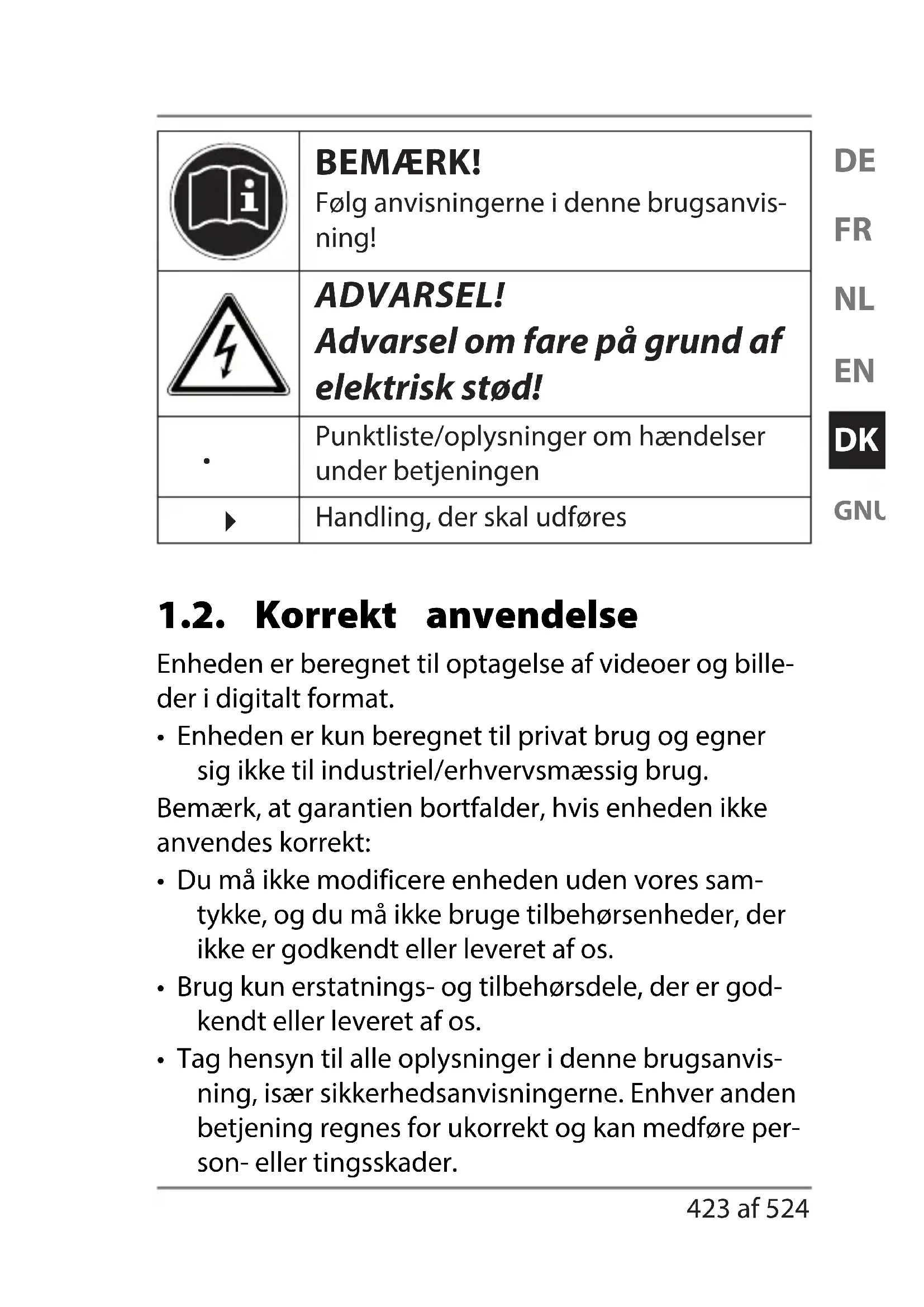 Handling, der skal udføres 1.2. Korrekt anvendelse Enheden er beregnet til optagelse af videoer og bille- der i digitalt format.