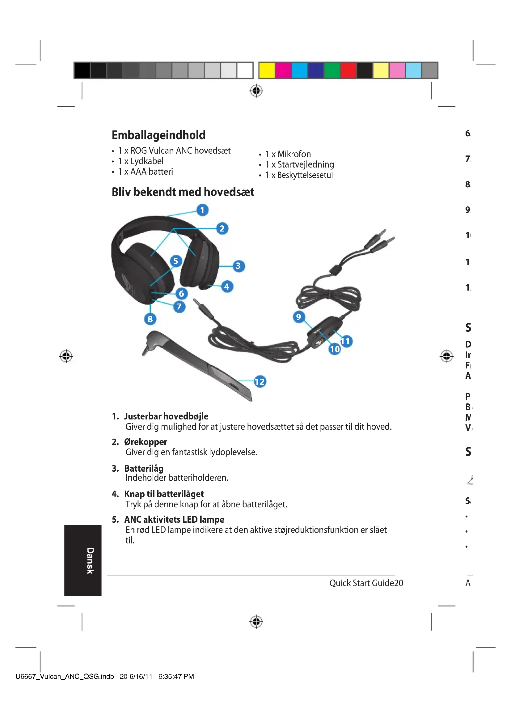 - Flyt på lydstyrkeknappen for at skrue op og ned for lydstyrken. Sådan bæres hovedsæt Øretelefonerne er mærket med hhv. R (højre) og L (venstre). Specikationer Driver: 40mm Impedans: 32 ohm Frekvensområde: 10~20 Khz Aktiv støjreduktion: Maksimal >15dB Eektiv båndbredde >600MHz Passiv støjreduktion: Maksimal >30dB Batteriets levetid: Op til 40 timer (med et AAA batteri) Mål (mm): 206mm x 196mm x 80mm (L x B x H) Vægt: 325g U6667_Vulcan_ANC_QSG.indb 20 6/16/11 6:35:47 PMQuick Start Guide ASUS ROG Vulcan ANC 21 Dansk Bliv bekendt med hovedsæt