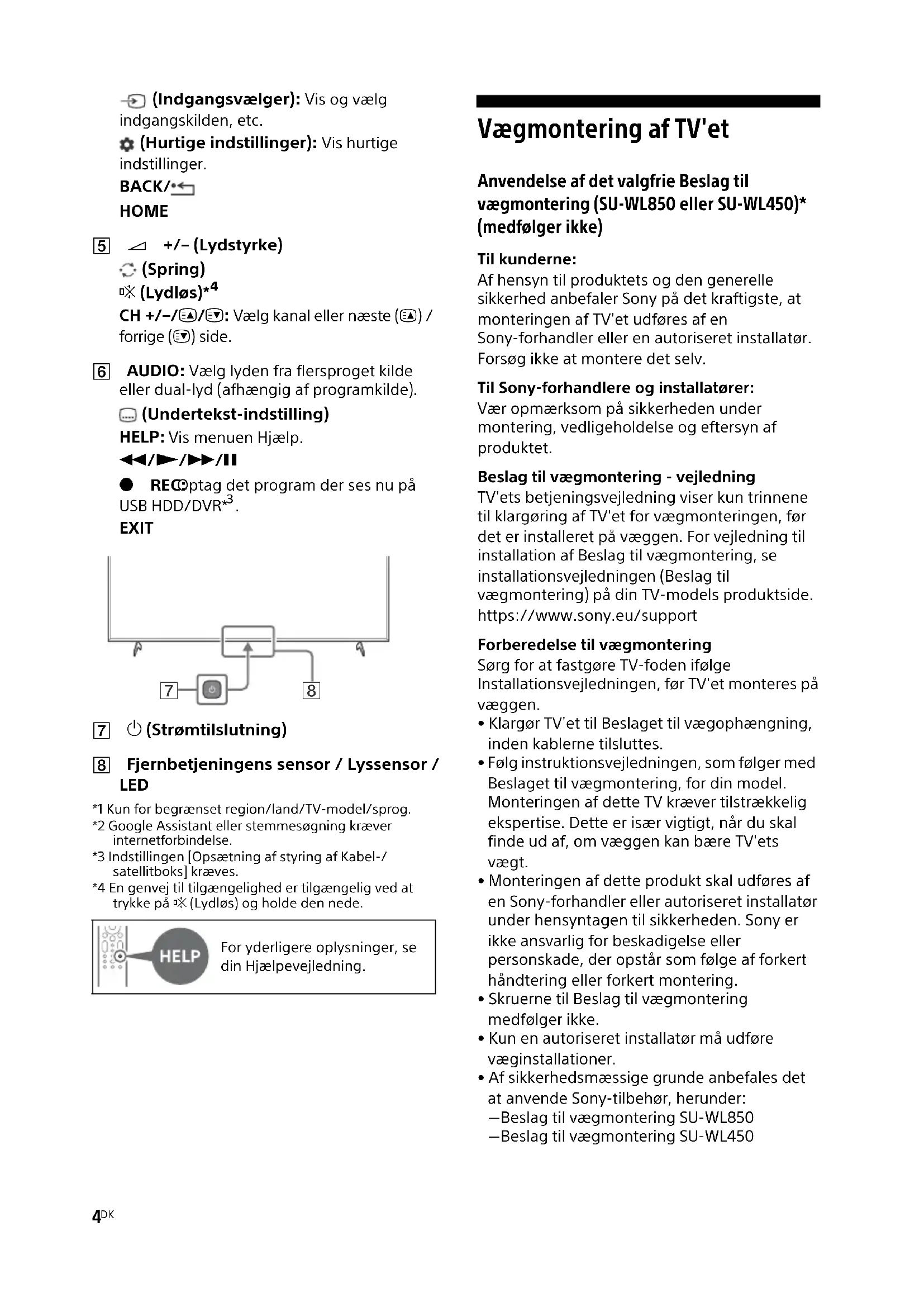 EXIT (Strømtilslutning) Fjernbetjeningens sensor / Lyssensor / LED *1 Kun for begrænset region/land/TV-model/sprog.*2 Google Assistant eller stemmesøgning kræver internetforbindelse.*3 Indstillingen [Opsætning af styring af Kabel-/satellitboks] kræves.*4 En genvej til tilgængelighed er tilgængelig ved at trykke på (Lydløs) og holde den nede. Vægmontering af TV'et Anvendelse af det valgfrie Beslag til vægmontering (SU-WL850 eller SU-WL450)* (medfølger ikke) Til kunderne: Af hensyn til produktets og den generelle sikkerhed anbefaler Sony på det kraftigste, at monteringen af TV'et udføres af en Sony-forhandler eller en autoriseret installatør. Forsøg ikke at montere det selv. Til Sony-forhandlere og installatører: Vær opmærksom på sikkerheden under montering, vedligeholdelse og eftersyn af produktet. Beslag til vægmontering - vejledning TV'ets betjeningsvejledning viser kun trinnene til klargøring af TV'et for vægmonteringen, før det er installeret på væggen. For vejledning til installation af Beslag til vægmontering, se installationsvejledningen (Beslag til vægmontering) på din TV-models produktside. https://www.sony.eu/support Forberedelse til vægmontering Sørg for at fastgøre TV-foden ifølge Installationsvejledningen, før TV'et monteres på væggen.