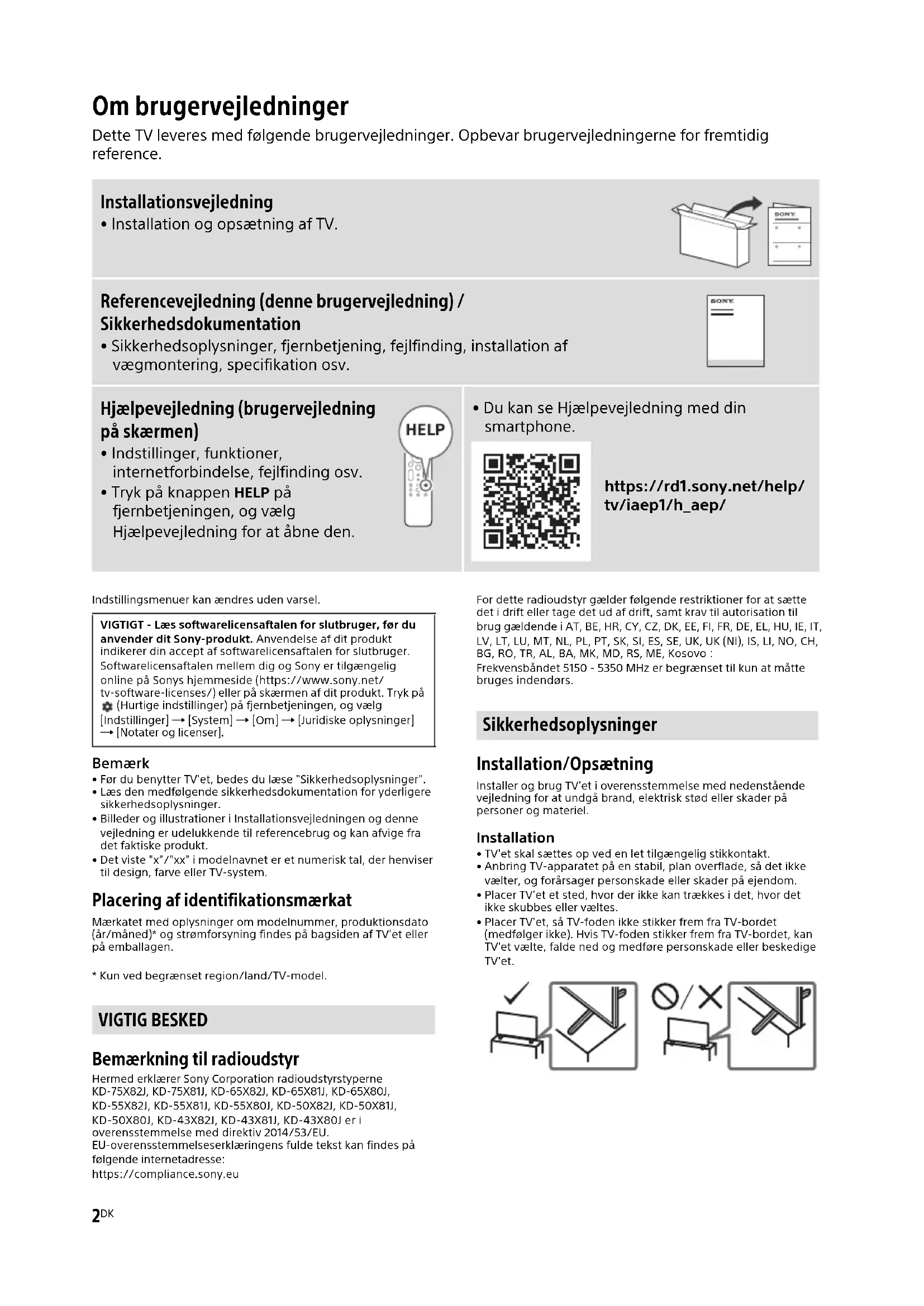 - Kun ved begrænset region/land/TV-model. Bemærkning til radioudstyr Hermed erklærer Sony Corporation radioudstyrstyperne KD-75X82J, KD-75X81J, KD-65X82J, KD-65X81J, KD-65X80J, KD-55X82J, KD-55X81J, KD-55X80J, KD-50X82J, KD-50X81J, KD-50X80J, KD-43X82J, KD-43X81J, KD-43X80J er i overensstemmelse med direktiv 2014/53/EU. EU-overensstemmelseserklæringens fulde tekst kan findes på følgende internetadresse: https://compliance.sony.eu For dette radioudstyr gælder følgende restriktioner for at sætte det i drift eller tage det ud af drift, samt krav til autorisation til brug gældende i AT, BE, HR, CY, CZ, DK, EE, FI, FR, DE, EL, HU, IE, IT, LV, LT, LU, MT, NL, PL, PT, SK, SI, ES, SE, UK, UK (NI), IS, LI, NO, CH, BG, RO, TR, AL, BA, MK, MD, RS, ME, Kosovo : Frekvensbåndet 5150 - 5350 MHz er begrænset til kun at måtte bruges indendørs. Installation/Opsætning Installer og brug TV'et i overensstemmelse med nedenstående vejledning for at undgå brand, elektrisk stød eller skader på personer og materiel. Installation