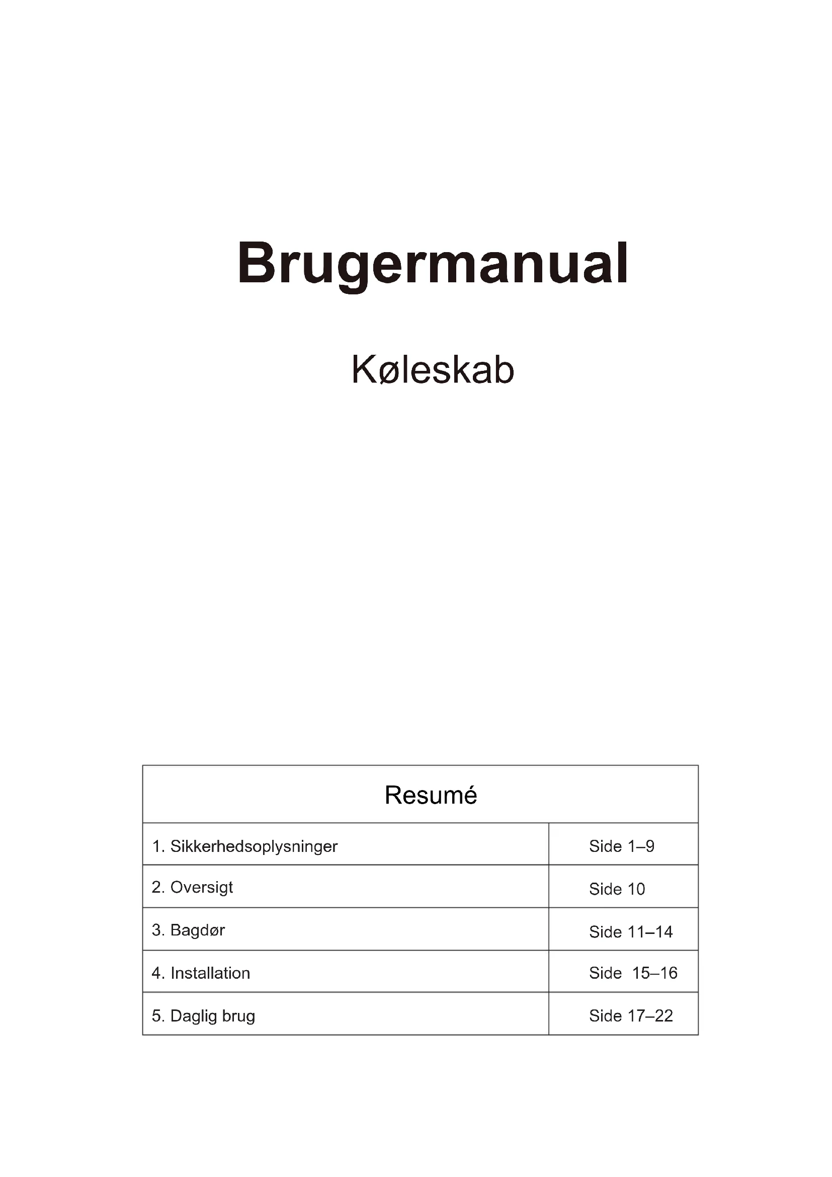 Side 17–22Tak, fordi du købte dette produkt. Inden du bruger dit køleskab, skal du omhyggeligt læse denne vejledning for at maksimere produktets ydelse. Opbevar alle dokumenter til fremtidig brug, eller til fremtidige ejere. Dette produkt er udelukkende beregnet til husholdningsbrug eller tilsvarende anvendelse så som: - i køkkenet til personale i butikker på kontorer samt i andre arbejdsmiljøer - på gårde, i kundeområder på hoteller, moteller og andre miljøer af en boligmæssig art - på bed and breakfasts (B & B) - til catering-servicer og tilsvarende anvendelser, dog ikke detailhandel-salg. Denne enh ed må kun anvendes til det formål at opbevare madvarer, og alt andet brug anses for farligt og producenten er ikke ansvarlig for nogen udeladelser. Det anbefales endvidere, at man bemærker alle garanti-betingelserne SIKKERHEDSOPLYSNINGER Læs betjenings- og installationsvejledningen omhyggeligt! De indeholder vigtige oplysning om installation, brug og vedligeholdelse af apparatet. Producenten er ikke ansvarlig, hvis du ikke overholder vejledningerne og advarslerne. Behold alle dokumenter til efterfølgende brug for den næste ejer.
