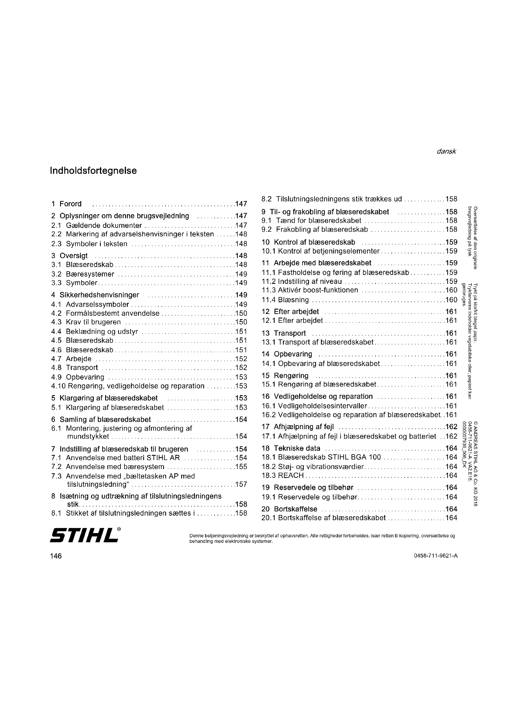 blæseredskabet Brugeren kan ikke selv vedligeholde og reparere blæseredskabet. ► Hvis blæseredskabet skal vedligeholdes eller er defekt eller beskadiget: Kontakt en STIHL-forhandler. 12 Efter arbejdet 13 Transport 14 Opbevaring 15 Rengøring 16 Vedligeholdelse og reparation0458-711-9621-A