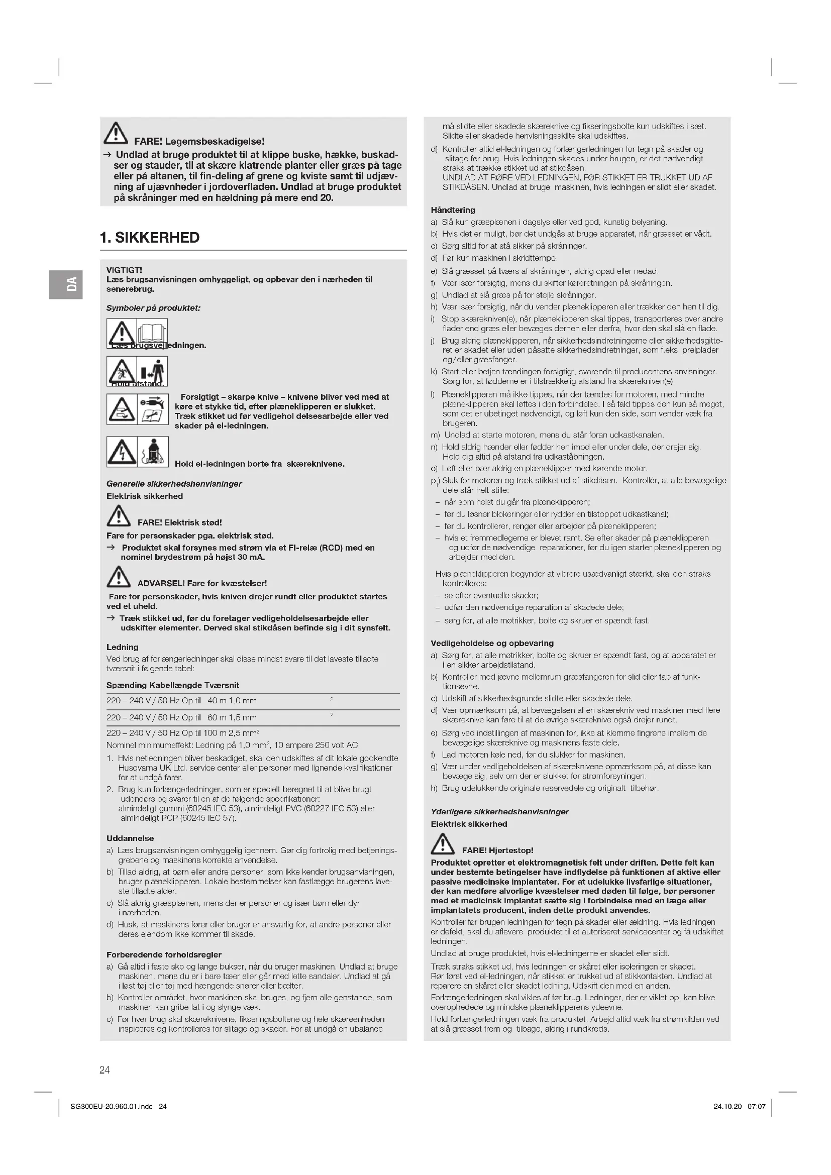 VIGTIGT! Læs brugsanvisningen omhyggeligt, og opbevar den i nærheden til senere brug. Symboler på produktet: Læs brugsvejledningen. Hold afstand. Forsigtigt – skarpe knive – knivene bliver ved med at køre et stykke tid, efter plæneklipperen er slukket. Træk stikket ud før vedligehol delsesarbejde eller ved skader på el-ledningen.