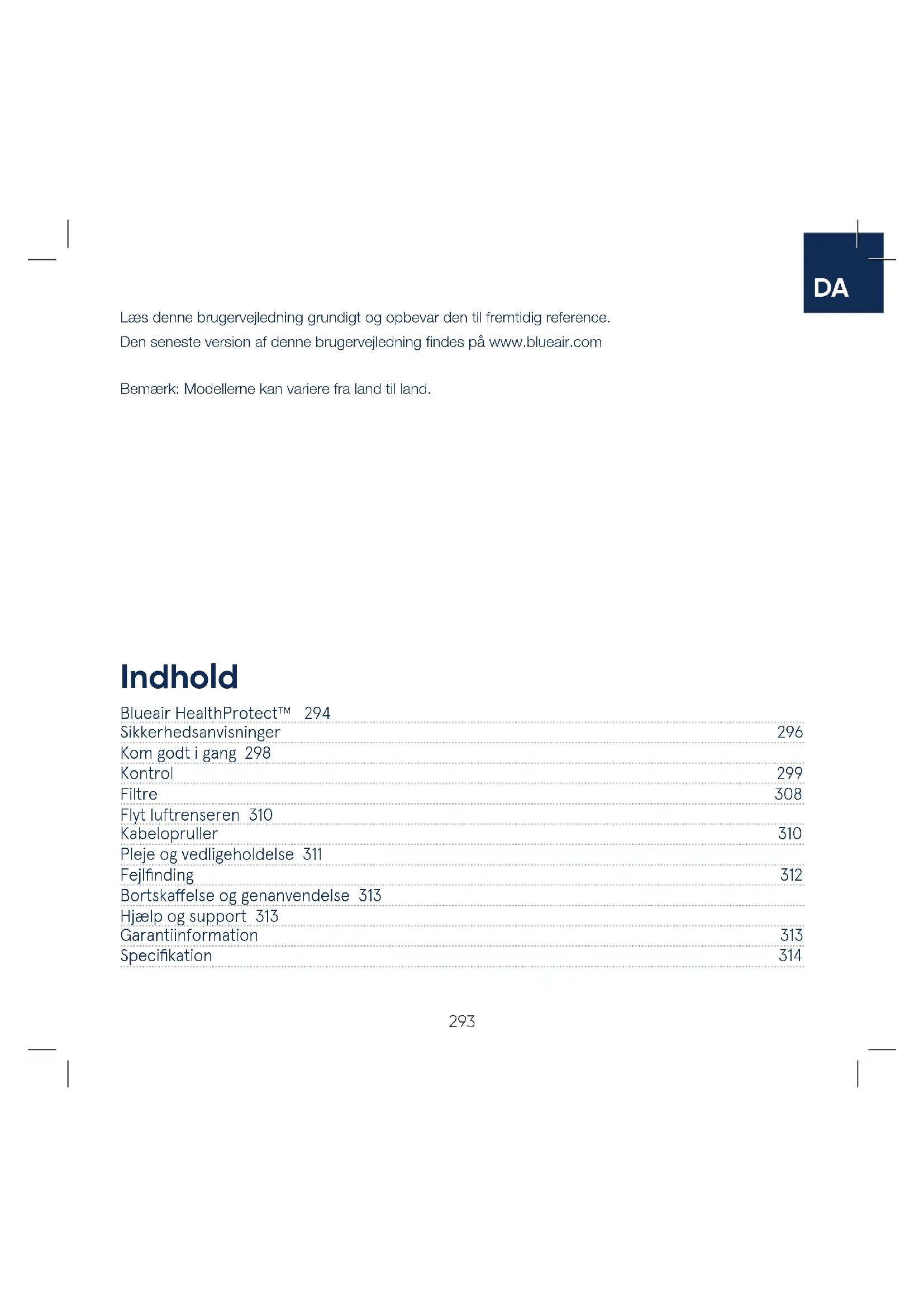 Blueair HealthProtect™ 294 Sikkerhedsanvisninger 296 Kom godt i gang 298 Kontrol 299 Filtre 308 Flyt luftrenseren 310 Kabelopruller 310 Pleje og vedligeholdelse 311 Fejlfinding 312 Bortskaelse og genanvendelse 313 Hjælp og support 313 Garantiinformation 313 Specifikation 314 Indhold Læs denne brugervejledning grundigt og opbevar den til fremtidig reference. Den seneste version af denne brugervejledning findes på www.blueair.com Bemærk: Modellerne kan variere fra land til land.294 Blueair HealthProtect™ Blueair HealthProtect™-luftrensere fås i tre modeller: 10-modellerne, 40-modellerne og 70-modellerne. Alle modeller er Wi-Fi aktiveret, har en GermShield
