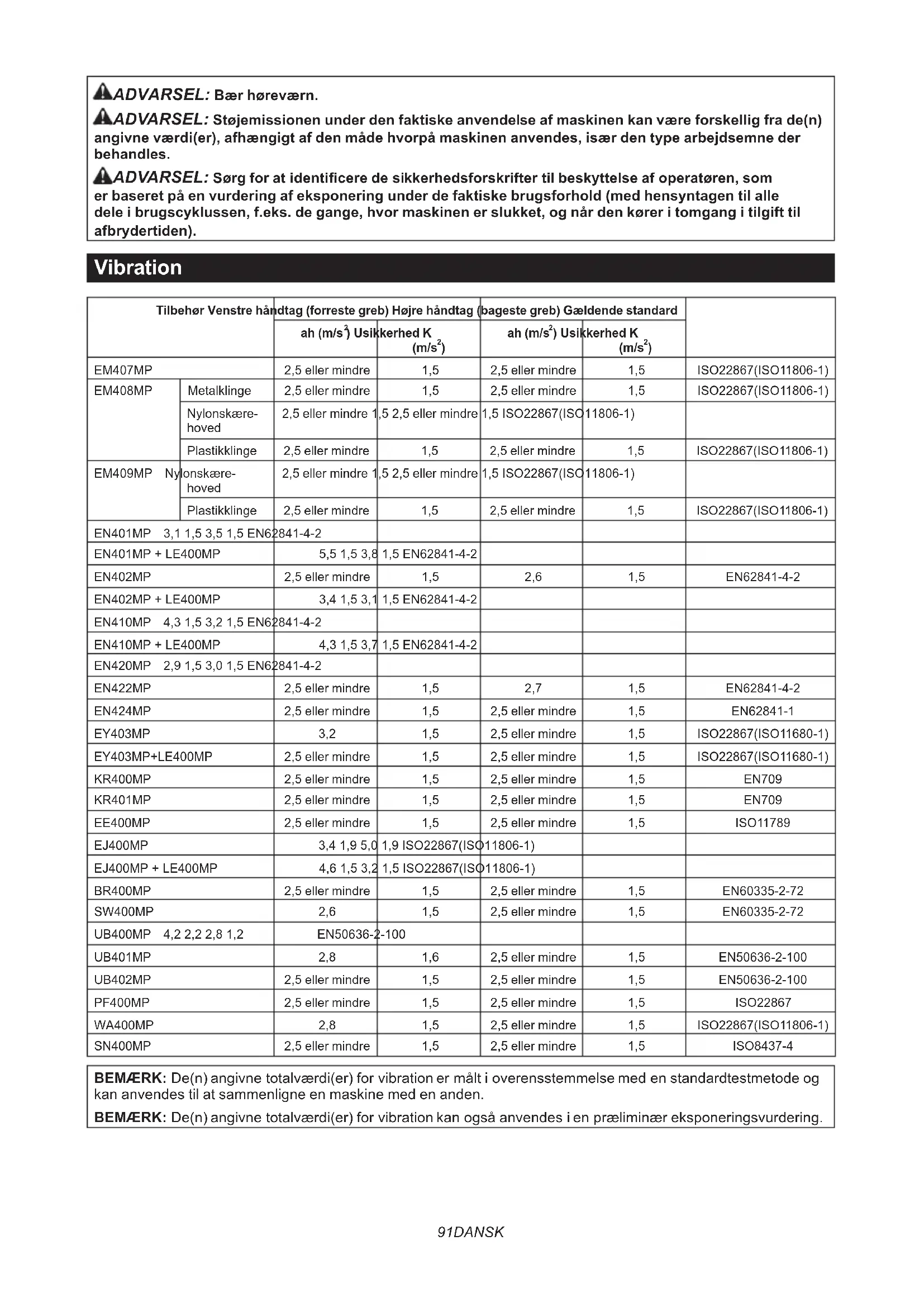 | EN401MP / EN402MP / EN410MP / EN420MP / EN422MP / EN424MP (Antal slag pr. minut) | 0 - 2.800 min-1 | 0 - 4.000 min-1 | |