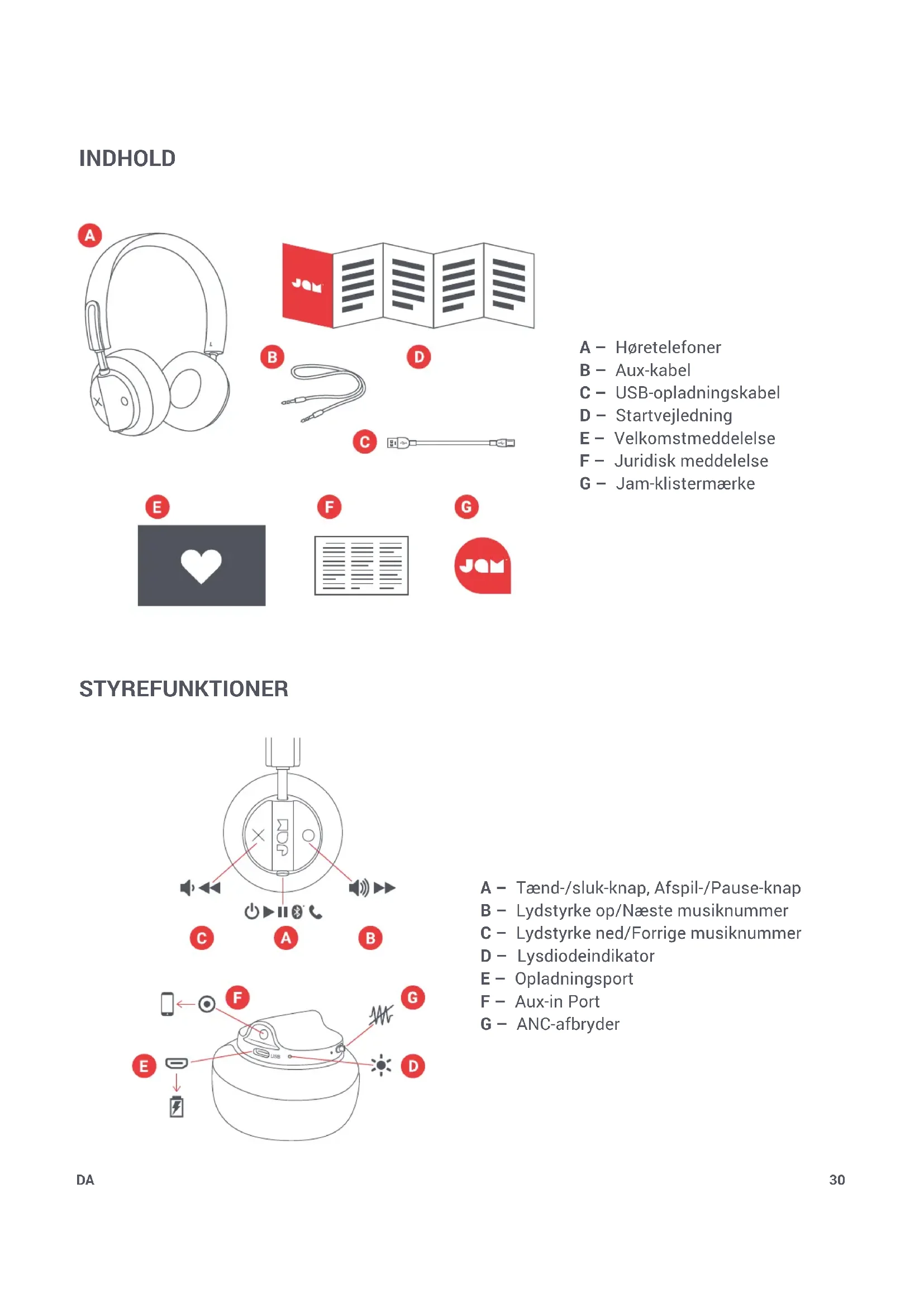 All rechten voorbehouden. IB-HXHP303EN 29 “Out There” HX-HP303 Instruktionsbog30 INDHOLD A – Høretelefoner B – Aux-kabel C – USB-opladningskabel D – Startvejledning E – Velkomstmeddelelse F – Juridisk meddelelse G – Jam-klistermærke STYREFUNKTIONER A – Tænd-/sluk-knap, Afspil-/Pause-knap B – Lydstyrke op/Næste musiknummer C – Lydstyrke ned/Forrige musiknummer D – Lysdiodeindikator E – Opladningsport F – Aux-in Port G – ANC-afbryder DA31 INSTALLATION ANVENDELSE