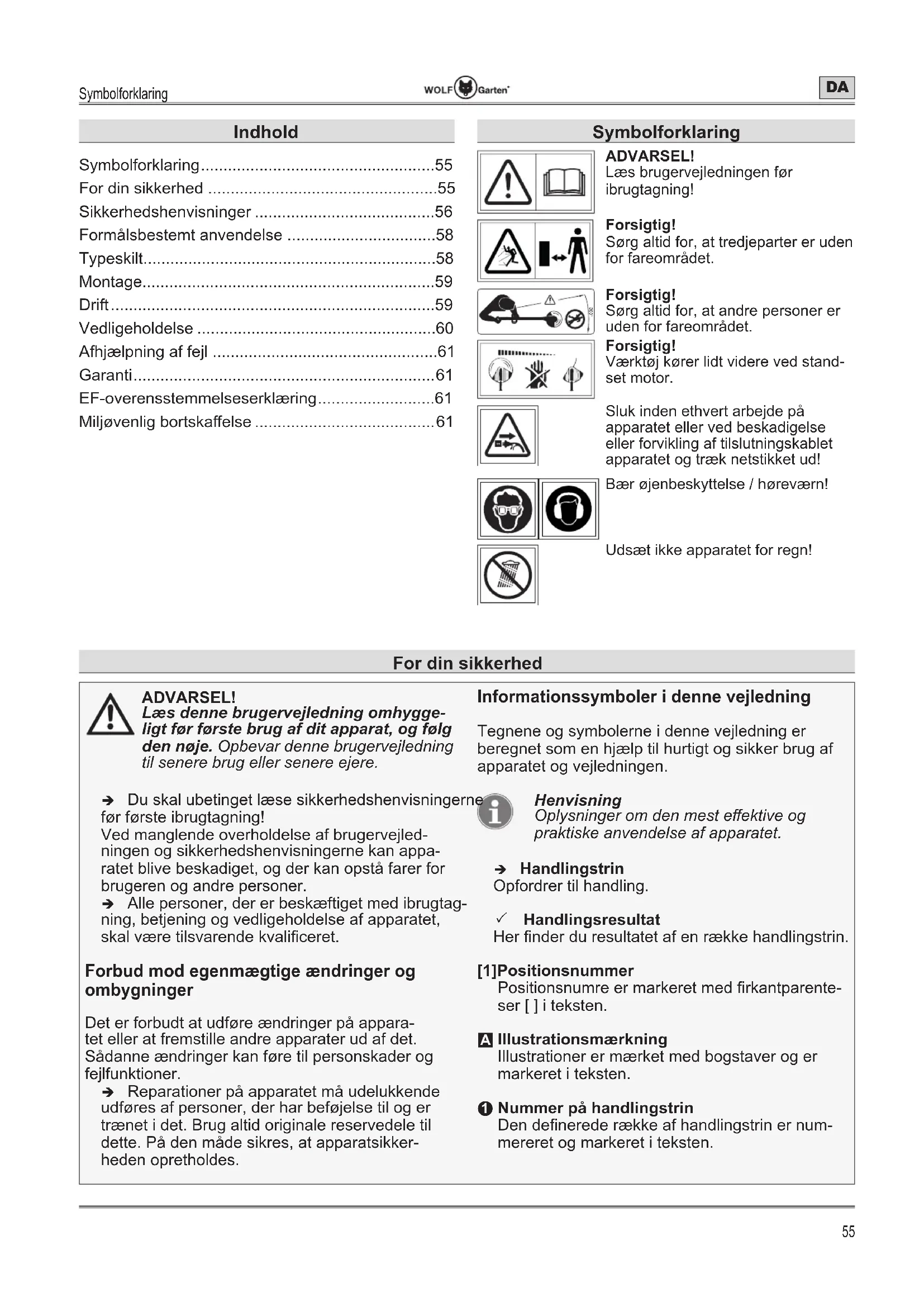 - Nummer på handlingstrin Den de¿nerede række af handlingstrin er num- mereret og markeret i teksten. For din sikkerhed Symbolforklaring ADVARSEL! Læs brugervejledningen før ibrugtagning! Forsigtig! Sørg altid for, at tredjeparter er uden for fareområdet. 360° Forsigtig! Sørg altid for, at andre personer er uden for fareområdet. Forsigtig! Værktøj kører lidt videre ved stand- set motor. Sluk inden ethvert arbejde på apparatet eller ved beskadigelse eller forvikling af tilslutningskablet apparatet og træk netstikket ud! Bær øjenbeskyttelse / høreværn! Udsæt ikke apparatet for regn! Indhold Symbolforklaring p. 55