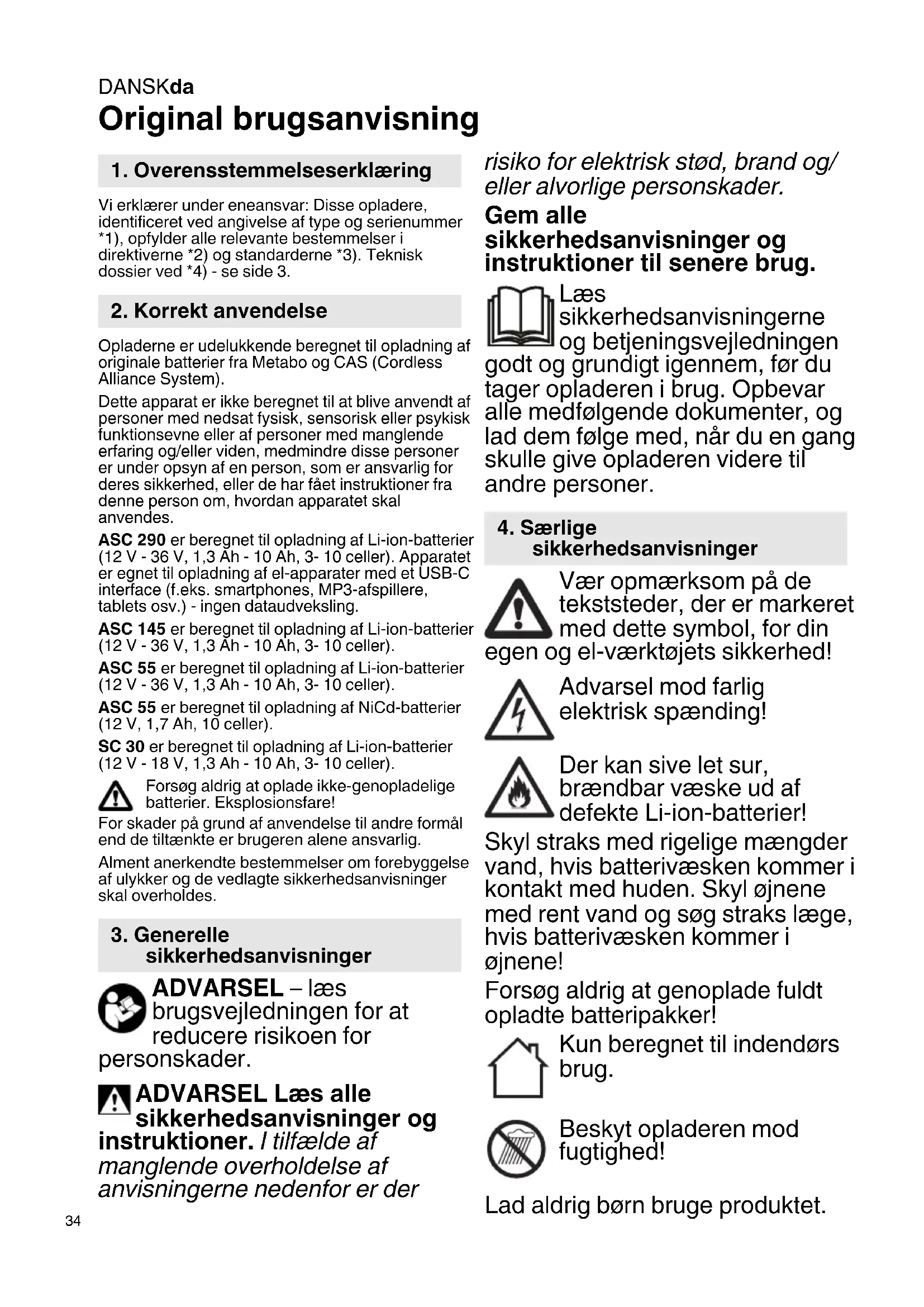 Original brugsanvisning Vi erklærer under eneansvar: Disse opladere, identificeret ved angivelse af type og serienummer *1), opfylder alle relevante bestemmelser i direktiverne *2) og standarderne *3). Teknisk dossier ved *4) - se side 3. Opladerne er udelukkende beregnet til opladning af originale batterier fra Metabo og CAS (Cordless Alliance System). Dette apparat er ikke beregnet til at blive anvendt af personer med nedsat fysisk, sensorisk eller psykisk funktionsevne eller af personer med manglende erfaring og/eller viden, medmindre disse personer er under opsyn af en person, som er ansvarlig for deres sikkerhed, eller de har fået instruktioner fra denne person om, hvordan apparatet skal anvendes. ASC 290 er beregnet til opladning af Li-ion-batterier (12 V - 36 V, 1,3 Ah - 10 Ah, 3- 10 celler). Apparatet er egnet til opladning af el-apparater med et USB-C interface (f.eks. smartphones, MP3-afspillere, tablets osv.) - ingen dataudveksling. ASC 145 er beregnet til opladning af Li-ion-batterier (12 V - 36 V, 1,3 Ah - 10 Ah, 3- 10 celler). ASC 55 er beregnet til opladning af Li-ion-batterier (12 V - 36 V, 1,3 Ah - 10 Ah, 3- 10 celler). ASC 55 er beregnet til opladning af NiCd-batterier (12 V, 1,7 Ah, 10 celler). SC 30 er beregnet til opladning af Li-ion-batterier (12 V - 18 V, 1,3 Ah - 10 Ah, 3- 10 celler). Forsøg aldrig at oplade ikke-genopladelige batterier. Eksplosionsfare! For skader på grund af anvendelse til andre formål end de tiltænkte er brugeren alene ansvarlig. Alment anerkendte bestemmelser om forebyggelse af ulykker og de vedlagte sikkerhedsanvisninger skal overholdes. ADVARSEL – læs brugsvejledningen for at reducere risikoen for personskader. ADVARSEL Læs alle sikkerhedsanvisninger og instruktioner. I tilfælde af manglende overholdelse af anvisningerne nedenfor er der risiko for elektrisk stød, brand og/ eller alvorlige personskader. Gem alle sikkerhedsanvisninger og instruktioner til senere brug. Læs sikkerhedsanvisningerne og betjeningsvejledningen godt og grundigt igennem, før du tager opladeren i brug. Opbevar alle medfølgende dokumenter, og lad dem følge med, når du en gang skulle give opladeren videre til andre personer. Vær opmærksom på de tekststeder, der er markeret med dette symbol, for din egen og el-værktøjets sikkerhed! Advarsel mod farlig elektrisk spænding! Der kan sive let sur, brændbar væske ud af defekte Li-ion-batterier! Skyl straks med rigelige mængder vand, hvis batterivæsken kommer i kontakt med huden. Skyl øjnene med rent vand og søg straks læge, hvis batterivæsken kommer i øjnene! Forsøg aldrig at genoplade fuldt opladte batteripakker! Kun beregnet til indendørs brug. Beskyt opladeren mod fugtighed! Lad aldrig børn bruge produktet.