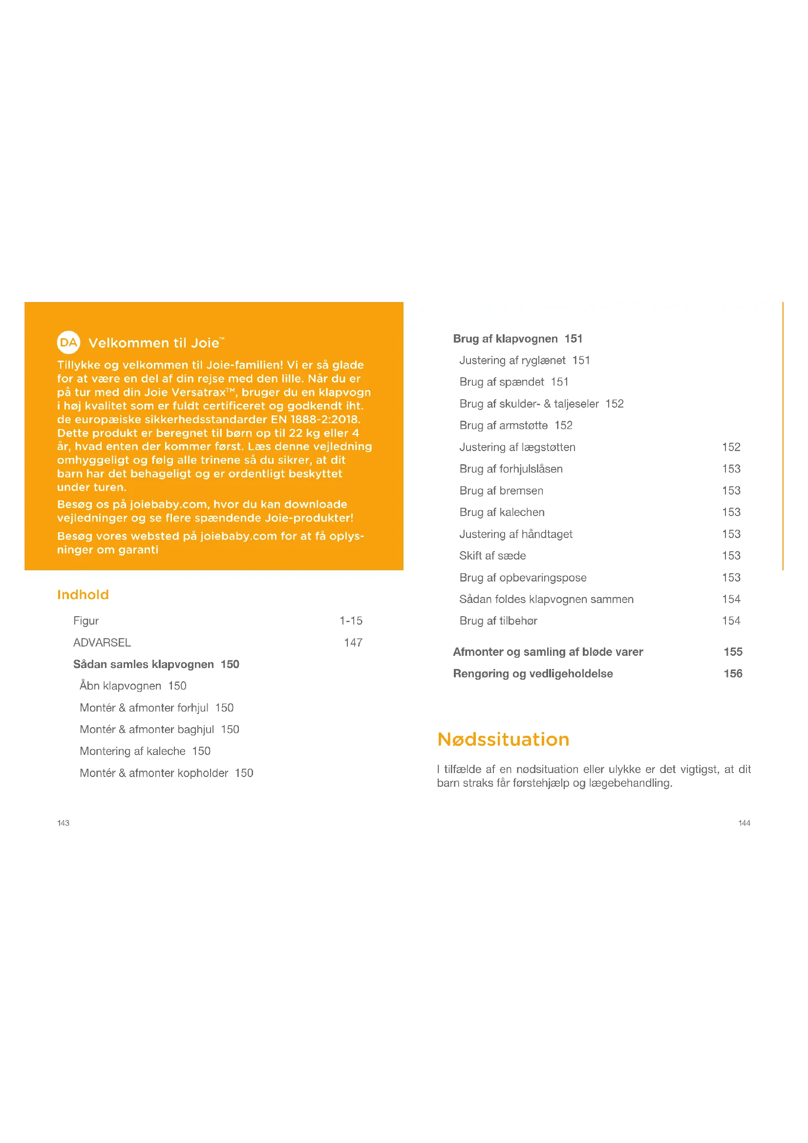 , bruger du en klapvogn i høj kvalitet som er fuldt certificeret og godkendt iht. de europæiske sikkerhedsstandarder EN 1888-2:2018. Dette produkt er beregnet til børn op til 22 kg eller 4 år, hvad enten der kommer først. Læs denne vejledning omhyggeligt og følg alle trinene så du sikrer, at dit barn har det behageligt og er ordentligt beskyttet under turen. Besøg os på joiebaby.com, hvor du kan downloade vejledninger og se flere spændende Joie-produkter! Besøg vores websted på joiebaby.com for at få oplys- ninger om garanti Indhold Figur 1-15 ADVARSEL 147 Sådan samles klapvognen 150 Åbn klapvognen 150 Montér & afmonter forhjul 150 Montér & afmonter baghjul 150 Montering af kaleche 150 Montér & afmonter kopholder 150 Brug af klapvognen 151 Justering af ryglænet 151 Brug af spændet 151 Brug af skulder- & taljeseler 152 Brug af armstøtte 152 Justering af lægstøtten 152 Brug af forhjulslåsen 153 Brug af bremsen 153 Brug af kalechen 153 Justering af håndtaget 153 Skift af sæde 153 Brug af opbevaringspose 153 Sådan foldes klapvognen sammen 154 Brug af tilbehør 154 Afmonter og samling af bløde varer 155 Rengøring og vedligeholdelse 156 Nødssituation I tilfælde af en nødsituation eller ulykke er det vigtigst, at dit barn straks får førstehjælp og lægebehandling.145