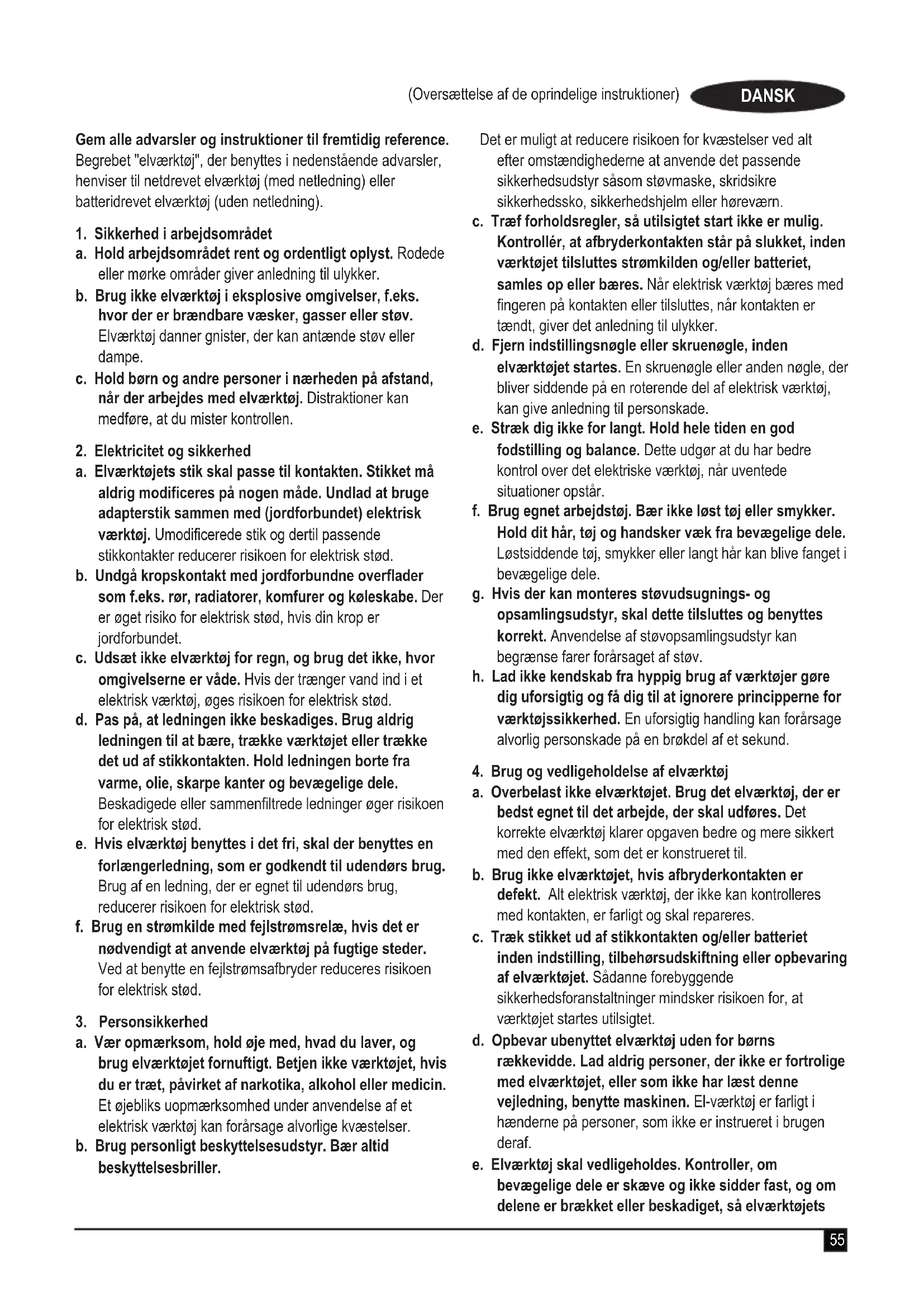 a. Overbelast ikke elværktøjet. Brug det elværktøj, der er bedst egnet til det arbejde, der skal udføres. Det korrekte elværktøj klarer opgaven bedre og mere sikkert med den effekt, som det er konstrueret til. b. Brug ikke elværktøjet, hvis afbryderkontakten er defekt. Alt elektrisk værktøj, der ikke kan kontrolleres med kontakten, er farligt og skal repareres. c. Træk stikket ud af stikkontakten og/eller batteriet inden indstilling, tilbehørsudskiftning eller opbevaring af elværktøjet. Sådanne forebyggende sikkerhedsforanstaltninger mindsker risikoen for, at værktøjet startes utilsigtet. d. Opbevar ubenyttet elværktøj uden for børns rækkevidde. Lad aldrig personer, der ikke er fortrolige med elværktøjet, eller som ikke har læst denne vejledning, benytte maskinen. El-værktøj er farligt i hænderne på personer, som ikke er instrueret i brugen deraf. e. Elværktøj skal vedligeholdes. Kontroller, om bevægelige dele er skæve og ikke sidder fast, og om delene er brækket eller beskadiget, så elværktøjets56 (Oversættelse af de oprindelige instruktioner) DANSK funktion påvirkes. Hvis det elektriske værktøj er beskadiget, skal det repareres før brug. Mange ulykker er forårsaget af dårligt vedligeholdt værktøj. f. Hold skæreværktøj skarpt og rent. Ordentligt vedligeholdt skæreværktøj med skarpe skærekanter har mindre tilbøjelighed til at binde og er lettere at styre. g. Brug elværktøjet, tilbehøret, værktøjsindsatser osv. i overensstemmelse med disse instruktioner under hensyntagen til arbejdsforholdene og arbejdet, der skal udføres med værktøjet. Brug af elektrisk værktøj til andre opgaver end dem, det er beregnet til, kan resultere i en farlig situation. h. Hold håndtagene og håndtagsaderne tørre, rene og fri for olie og fedt. Glatte håndtag og håndtagsader giver ikke en sikker håndtering og kontrol af værktøjet i uventede situationer.