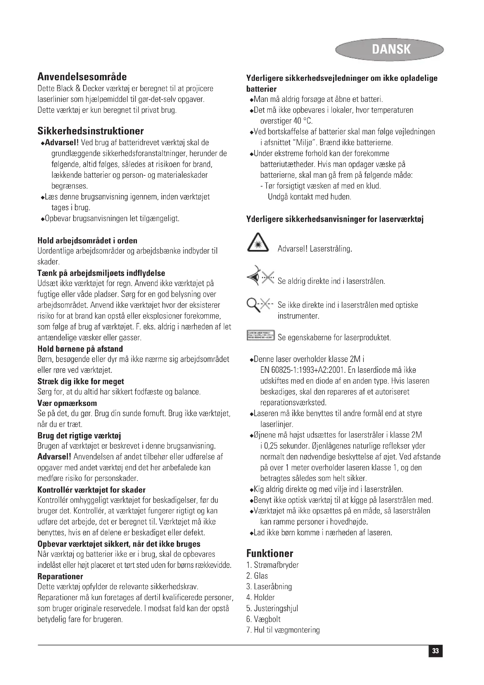 Kevin Hewitt Director of Consumer Engineering Spennymoor, County Durham DL16 6JG, United Kingdom 1-12-2004 Reservdeler / reparasjoner Reservdeler kan kjøpes hos autoriserte Black & Decker serviceverksteder, som også gir kostnadsoverslag og reparerer våre produkter. Oversikt over våre autoriserte serviceverksteder finnes på Internet, vår hjemmeside www.blackanddecker.no samt www.2helpU.com Garanti Black & Decker garanterer at produktet ikke har material- og/eller fabrikasjonsfeil ved levering til kunde. Garantien er i tillegg til kundens lovlige rettigheter og påvirker ikke disse. Garantien gjelder innen medlemsstatene i den Europeiske Unionen og i det Europeiske Frihandelsområdet. Hvis et Black & Decker produkt går i stykker på grunn av material- og/eller fabrikasjonsfeil eller har mangler i forhold til spesifikasjonene, innen 24 måneder fra kjøpet, påtar Black & Decker seg å reparere eller bytte ut produktet med minst mulig vanskelighet for kunden. Garantien gjelder ikke for feil som kommer av: ◆ normal slittasje ◆ feilaktig bruk eller vedlikehold (mislighold) ◆ at produktet har blitt skadet av fremmede gjenstander, emner eller ved et uhell Det gjøres oppmerksom på at produktet ikke er beregnet på industriell/profesjonell/yrkesmessig bruk, men til hus- og hjemmebruk. Garantien gjelder ikke om reparasjoner har blitt utført av noen andre enn et autorisert Black & Decker serviceverksted. For å ta garantien i bruk skal produktet og kjøpekvittering leveres til forhandleren eller til et autorisert serviceverksted senest 2 måneder etter at feilen har blitt oppdaget. For informasjon om nærmeste autoriserte serviceverksted; kontakt det lokale Black & Decker kontoret på den adressen som er angitt i bruksanvisningen. En oversikt over alle autoriserte serviceverksteder samt servicevilkår finnes også tilgjengelig på Internet, adresse: www.2helpU.com Vennligst stikk innom våre nettsider på www.blackanddecker.no for å registrere ditt nye Black & Decker-produkt og for å holde deg oppdatert om nye produkter og spesialtilbud. Du finner mer informasjon om Black & Decker og produktutvalget vårt på www.blackanddecker.no33 DANSK Anvendelsesområde Dette Black & Decker værktøj er beregnet til at projicere laserlinier som hjælpemiddel til gør-det-selv opgaver. Dette værktøj er kun beregnet til privat brug. Sikkerhedsinstruktioner ◆ Advarsel! Ved brug af batteridrevet værktøj skal de grundlæggende sikkerhedsforanstaltninger, herunder de følgende, altid følges, således at risikoen for brand, lækkende batterier og person- og materialeskader begrænses. ◆ Læs denne brugsanvisning igennem, inden værktøjet tages i brug. ◆ Opbevar brugsanvisningen let tilgængeligt. Hold arbejdsområdet i orden Uordentlige arbejdsområder og arbejdsbænke indbyder til skader. Tænk på arbejdsmiljøets indflydelse Udsæt ikke værktøjet for regn. Anvend ikke værktøjet på fugtige eller våde pladser. Sørg for en god belysning over arbejdsområdet. Anvend ikke værktøjet hvor der eksisterer risiko for at brand kan opstå eller eksplosioner forekomme, som følge af brug af værktøjet. F. eks. aldrig i nærheden af let antændelige væsker eller gasser. Hold børnene på afstand Børn, besøgende eller dyr må ikke nærme sig arbejdsområdet eller røre ved værktøjet. Stræk dig ikke for meget Sørg for, at du altid har sikkert fodfæste og balance. Vær opmærksom Se på det, du gør. Brug din sunde fornuft. Brug ikke værktøjet, når du er træt. Brug det rigtige værktøj Brugen af værktøjet er beskrevet i denne brugsanvisning. Advarsel! Anvendelsen af andet tilbehør eller udførelse af opgaver med andet værktøj end det her anbefalede kan medføre risiko for personskader. Kontrollér værktøjet for skader Kontrollér omhyggeligt værktøjet for beskadigelser, før du bruger det. Kontrollér, at værktøjet fungerer rigtigt og kan udføre det arbejde, det er beregnet til. Værktøjet må ikke benyttes, hvis en af delene er beskadiget eller defekt. Opbevar værktøjet sikkert, når det ikke bruges Når værktøj og batterier ikke er i brug, skal de opbevares indelåst eller højt placeret et tørt sted uden for børns rækkevidde. Reparationer Dette værktøj opfylder de relevante sikkerhedskrav. Reparationer må kun foretages af dertil kvalificerede personer, som bruger originale reservedele. I modsat fald kan der opstå betydelig fare for brugeren. Yderligere sikkerhedsvejledninger om ikke opladelige batterier ◆ Man må aldrig forsøge at åbne et batteri. ◆ Det må ikke opbevares i lokaler, hvor temperaturen overstiger 40 °C. ◆ Ved bortskaffelse af batterier skal man følge vejledningen i afsnittet “Miljø”. Brænd ikke batterierne. ◆ Under ekstreme forhold kan der forekomme batteriutætheder. Hvis man opdager væske på batterierne, skal man gå frem på følgende måde: - Tør forsigtigt væsken af med en klud. Undgå kontakt med huden. Yderligere sikkerhedsanvisninger for laserværktøj Advarsel! Laserstråling. Se aldrig direkte ind i laserstrålen. Se ikke direkte ind i laserstrålen med optiske instrumenter. Se egenskaberne for laserproduktet. ◆ Denne laser overholder klasse 2M i EN 60825-1:1993+A2:2001. En laserdiode må ikke udskiftes med en diode af en anden type. Hvis laseren beskadiges, skal den repareres af et autoriseret reparationsværksted. ◆ Laseren må ikke benyttes til andre formål end at styre laserlinjer. ◆ Øjnene må højst udsættes for laserstråler i klasse 2M i 0,25 sekunder. Øjenlågenes naturlige reflekser yder normalt den nødvendige beskyttelse af øjet. Ved afstande på over 1 meter overholder laseren klasse 1, og den betragtes således som helt sikker. ◆ Kig aldrig direkte og med vilje ind i laserstrålen. ◆ Benyt ikke optisk værktøj til at kigge på laserstrålen med. ◆ Værktøjet må ikke opsættes på en måde, så laserstrålen kan ramme personer i hovedhøjde. ◆ Lad ikke børn komme i nærhe