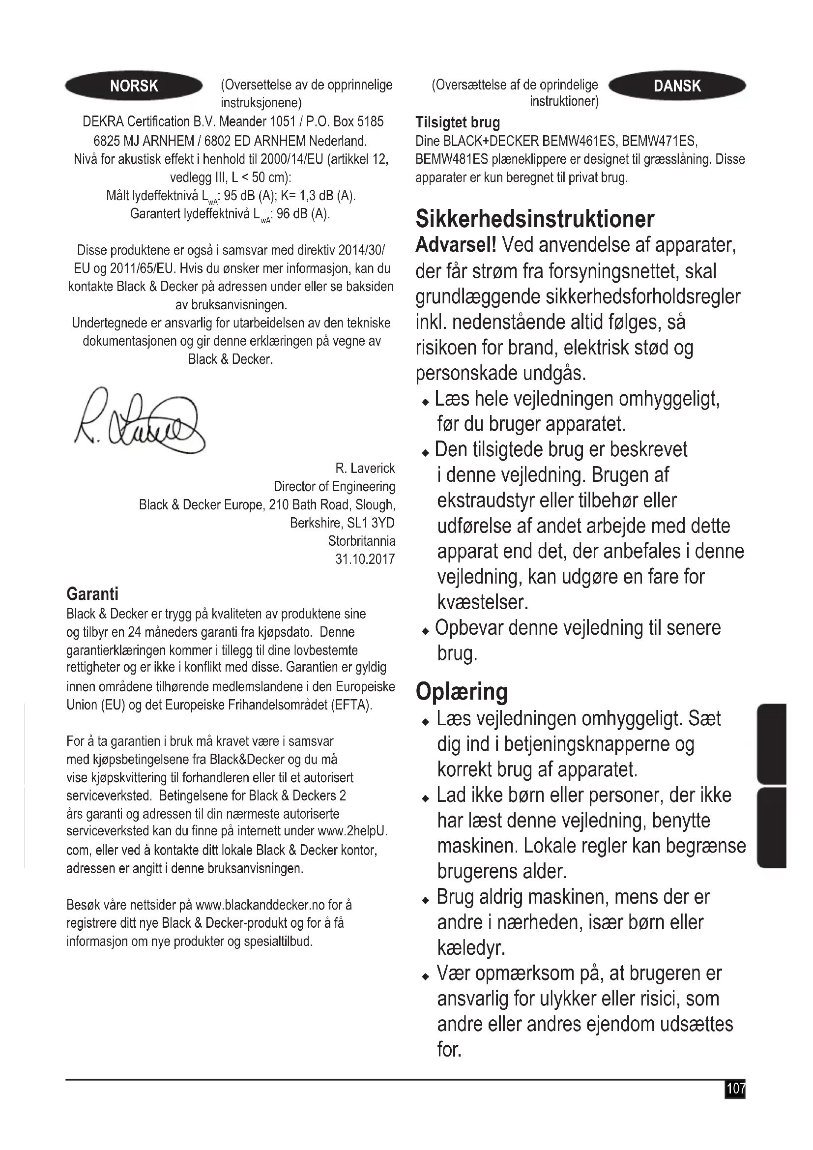 Garanti Black & Decker er trygg på kvaliteten av produktene sine og tilbyr en 24 måneders garanti fra kjøpsdato. Denne garantierklæringen kommer i tillegg til dine lovbestemte rettigheter og er ikke i konikt med disse. Garantien er gyldig innen områdene tilhørende medlemslandene i den Europeiske Union (EU) og det Europeiske Frihandelsområdet (EFTA). For å ta garantien i bruk må kravet være i samsvar med kjøpsbetingelsene fra Black&Decker og du må vise kjøpskvittering til forhandleren eller til et autorisert serviceverksted. Betingelsene for Black & Deckers 2 års garanti og adressen til din nærmeste autoriserte serviceverksted kan du nne på internett under www.2helpU. com, eller ved å kontakte ditt lokale Black & Decker kontor, adressen er angitt i denne bruksanvisningen. Besøk våre nettsider på www.blackanddecker.no for å registrere ditt nye Black & Decker-produkt og for å få informasjon om nye produkter og spesialtilbud. Tilsigtet brug Dine BLACK+DECKER BEMW461ES, BEMW471ES, BEMW481ES plæneklippere er designet til græsslåning. Disse apparater er kun beregnet til privat brug. Sikkerhedsinstruktioner Advarsel! Ved anvendelse af apparater, der får strøm fra forsyningsnettet, skal grundlæggende sikkerhedsforholdsregler inkl. nedenstående altid følges, så risikoen for brand, elektrisk stød og personskade undgås. u Læs hele vejledningen omhyggeligt, før du bruger apparatet. u Den tilsigtede brug er beskrevet i denne vejledning. Brugen af ekstraudstyr eller tilbehør eller udførelse af andet arbejde med dette apparat end det, der anbefales i denne vejledning, kan udgøre en fare for kvæstelser. u Opbevar denne vejledning til senere brug. Oplæring u Læs vejledningen omhyggeligt. Sæt dig ind i betjeningsknapperne og korrekt brug af apparatet. u Lad ikke børn eller personer, der ikke har læst denne vejledning, benytte maskinen. Lokale regler kan begrænse brugerens alder. u Brug aldrig maskinen, mens der er andre i nærheden, især børn eller kæledyr. u Vær opmærksom på, at brugeren er ansvarlig for ulykker eller risici, som andre eller andres ejendom udsættes for.108 (Oversættelse af de oprindelige instruktioner) DANSK Klargøring u Brug altid kraftigt fodtøj og lange bukser under anvendelse af maskinen. Betjen ikke maskinen uden sko eller iført sandaler. Undgå at bære løstsiddende tøj eller tøj med hængende snore eller bånd. u Inspicer grundigt det område, hvor maskinen skal bruges, og fjern alle objekter, som maskinen kan kaste ud. u Inspicer altid visuelt, at kniven, knivbolten og knivsamlingen ikke er slidt eller beskadiget, før du bruger maskinen. Udskift slidte eller beskadigede komponenter i sæt for at bevare balancen. Udskift beskadigede eller ulæsbare etiketter. u Kontroller før brug strømforsyningsledningen og forlængerledningen for tegn på beskadigelse eller ælde. Hvis ledningen bliver beskadiget under brug, skal du omgående tage den ud af stikkontakten. RØR IKKE VED