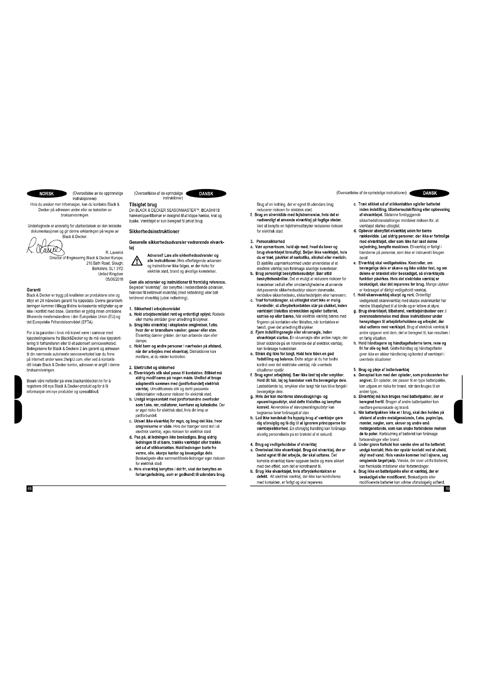 Hækkeklippertilbehør Black & Decker erklærer, at produkterne beskrevet under “Tekniske data” er i overensstemmelse med: EN 60745-1:2009+A11:2010, EN 60745-2-15:2009+A1:2010, Disse produkter er endvidere i overensstemmelse med direktiv 2006/42/EF, 2014/30/EU og 2011/65/EU. hækkeklipper, 2000/14/EC, Bilag V Målt lydeffektniveau (LwA) 95 dB(A) Usikkerhed (K) = 1,5 dB(A) Garanteret lydeffekt (LwA) 101 dB(A) Kontakt Black & Decker på nedenstående adresse eller se vejledningens bagside for at få yderligere oplysninger. Undertegnede er ansvarlig for udarbejdelsen af de tekniske data og fremsætter denne erklæring på vegne af Black & Decker. R. Laverick Director of Engineering Black & Decker Europe , 210 Bath Road, Slough, Berkshire, SL1 3YD Storbritannien 06/06/2018 Garanti Black & Decker er overbevist om den gode kvalitet af sine produkter og giver forbrugerne en garanti på 24 måneder fra købsdatoen. Garantien er et tillæg til forbrugerens lovmæs- sige rettigheder og påvirker ikke disse. Garantien er gyldig inden for medlemsstaterne af Den Europæiske Union og Det Europæiske Frihandelsområde. Når du gør krav på garantien, skal kravet være i overens- stemmelse med Black & Decker vilkår og betingelser, og du skal indsende dokumentation for købet til sælgeren eller til en autoriseret reparatør. Vilkår og betingelser for Black & Decker 2 års garanti og placeringen af dit nærmeste autoriserede serviceværksted kan fås på internettet på www.2helpU.com, eller ved at kontakte dit lokale Black & Decker kontor på den adresse, der er angivet i denne vejledning. Besøg venligst vores websted www.blackanddecker.co.uk for at registrere dit nye Black & Decker produkt og modtage opdateringer om nye produkter og specielle tilbud. Käyttötarkoitus Your BLACK+DECKER SEASONMASTER™, BCASH81B- pensasleikkurin lisäosa on tarkoitettu pensaiden ja pensasaitojen leikkaamiseen. Tämä työkalu on tarkoitettu vain yksityiskäyttöön. Turvallisuusohjeet Sähkötyökalujen yleiset turvavaroitukset