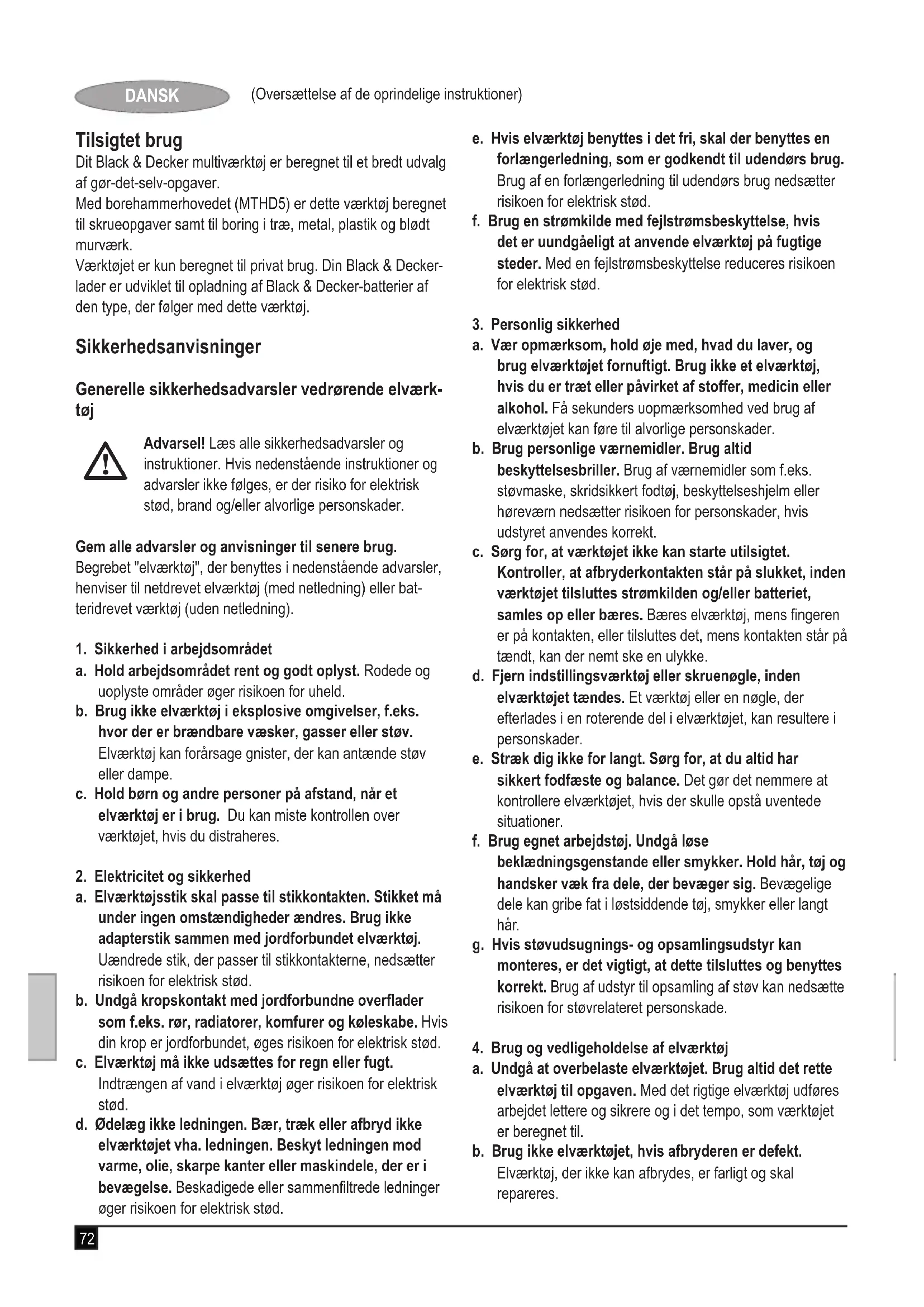 Kevin Hewitt Vice-President Global Engineering Black & Decker Europe, 210 Bath Road, Slough, Berkshire, SL1 3YD Storbritannien 06/06/2013 Garanti Black & Decker garanterer, at produktet er fri for skader og fejl og tilbyder en fremragende garanti. Garantien er et tillæg til forbrugerens lovsikrede rettigheder og påvirker ikke disse. Ga- rantien gælder inden for medlemsstaterne af den Europæiske Union og i det Europæiske Frihandelsområde. Hvis et Black & Decker-produkt går i stykker på grund af materiel skade og/eller fabrikationsfejl eller på anden måde ikke fungerer i overensstemmelse med specikationen inden for 24 måneder fra købsdatoen, påtager Black & Decker sig at reparere eller ombytte produktet med mindst mulig ulempe for kunden. Garantien gælder ikke for fejl og mangler, der er sket i forbindelse med: u Produktet har været anvendt erhvervsmæssigt eller til udlejning. u Produktet har været anvendt forkert eller er ikke vedlige- holdt. u Produktet er beskadiget af fremmedlegemer, substanser eller pga. uheld. u Garantien gælder ikke, hvis reparationer er udført af andre end et autoriseret Black & Decker-værksted. For at udnytte garantien skal produktet og købskvitteringen indleveres til forhandleren eller til et autoriseret værksted. Kontakt det lokale Black & Decker-kontor på den adresse, der er opgivet i denne vejledning, for at få oplysninger om nærmeste autoriserede værksted. En liste over alle autoris- erede Black & Decker-serviceværksteder samt servicevilkår og kontaktpersoner er tilgængelig på internettet på adressen: www.2helpU.com Gå venligst ind på vores website www.blackanddecker.dk for at registrere dit nye produkt og for at blive holdt ajour om nye produkter og specialtilbud. Der ndes yderligere oplysninger om mærket Black & Decker og vores produktsortiment på adressen www.blackanddecker.dk79 (Alkuperäisten ohjeiden käännös) SUOMI Käyttötarkoitus Black & Decker -monitoimityökalu on tarkoitettu käytettäväksi kodin nikkarointitöihin. Vasaraporapäällä (MTHD5) varustettuna työkalu soveltuu ruu- vien kiinnittämiseen sekä puun, metallin, muovin ja pehmeän betonin poraamiseen. Tämä työkalu on tarkoitettu vain yksityiskäyttöön. Black & Decker -laturi on tarkoitettu tämän työkalun mukana toimitet- tujen akkujen kaltaisten Black & Decker -akkujen lataamiseen. Turvallisuusohjeet Sähkötyökalujen yleiset turvavaroitukset