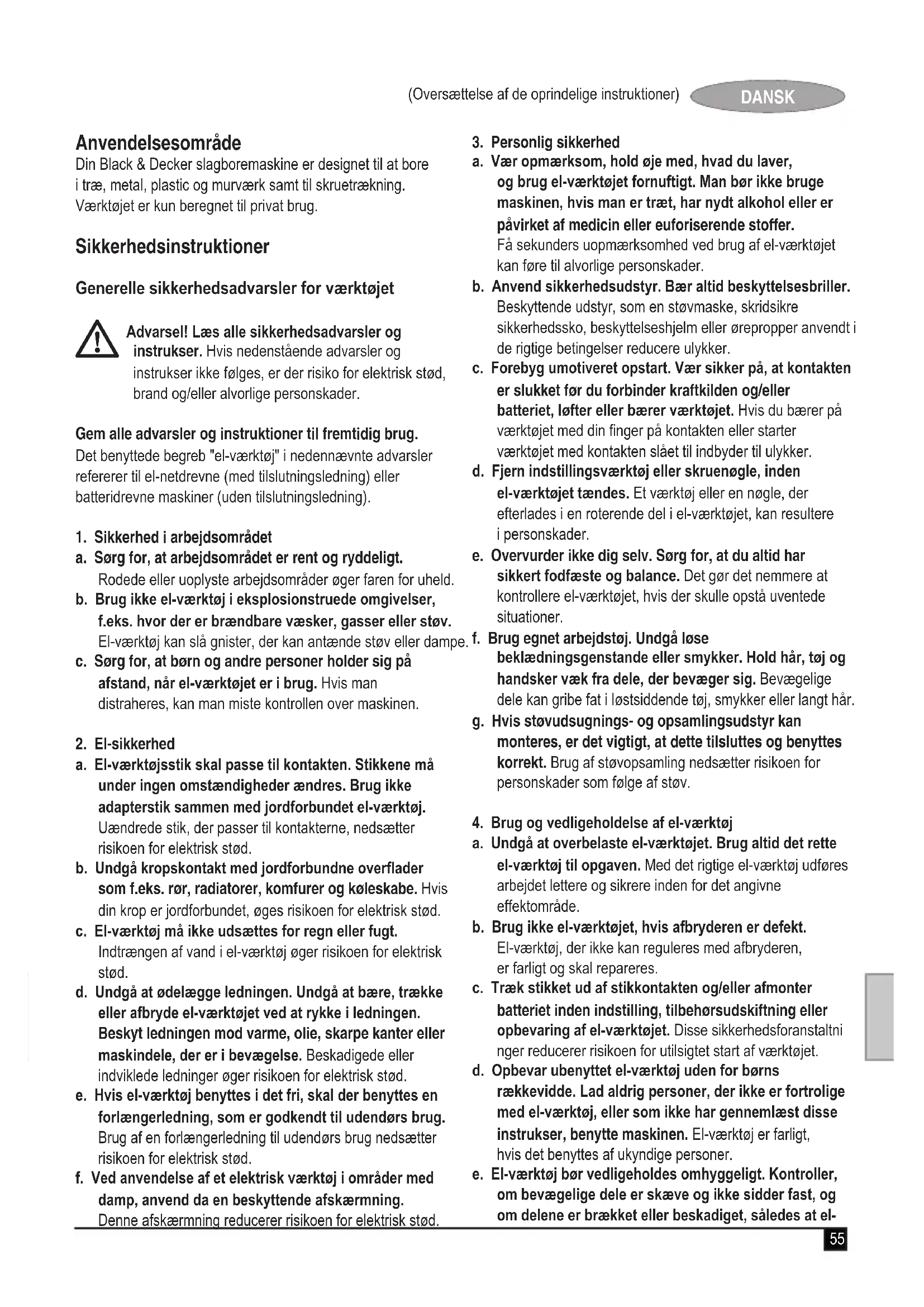 Vælger med to gear (g. G) u Sæt to-gearsvælgeren (5) i positionen 1 ved at rette tallet58 (Oversættelse af de oprindelige instruktioner) DANSK ind med indskæringen (17) (1. gear) for at bore i stål og for at skrue skruer i. u Sæt to-gearsvælgeren (5) i positionen 2 ved at rette tallet ind med indskæringen (17) (2. gear) for at bore i andre materialer end stål. Indstil boredybden (g. H) u Løsn sidehåndtaget (9) ved at dreje håndtaget mod uret.u Indstil dybdestoppet (8) til den ønskede position. Den maksimale boredybde er lig med afstanden mellem borebittens spids og dybdestoppets forende. u Stram sidehåndtaget ved at dreje håndtaget med uret. Start og stop u Tænd værktøjet ved at trykke på kontakten til variabel hastighed (1). Værktøjets hastighed afhænger af, hvor langt ind man trykker afbryderen. Hvis værktøjet har en betjeningsknap til variabel hastighed (3), sættes denne på det nødvendige hastighedsområde. Brug som en generel regel lave hastigheder til borebits med stor diameter og høje hastigheder til borebits med mindre diameter. u Værktøjet sættes til vedvarende drift ved at trykke på låseknappen (2) og slippe kontakten til variabel hastighed. Denne funktion kan kun bruges ved fuld hastighed eller ved enhver hastighed, der er forudindstillet med hastighedskontrolknappen (3). Denne funktion fungerer ikke i bagudrotation. u Sluk værktøjet ved at slippe kontakten til variabel hastighed. Sluk for værktøjet, mens det arbejder i vedvarende drift ved at trykke kontakten til variabel hastighed ind én gang til og derefter slippe den. Tilbehør Værktøjets ydeevne afhænger af, hvilket tilbehør der bruges. Black & Decker og Piranha tilbehør er konstrueret, så det opfylder høje kvalitetsstandarder, og det er beregnet til at forbedre værktøjets ydeevne. Bruger du dette tilbehør, vil du få det allerbedste ud af værktøjet. Vedligeholdelse Værktøjet er beregnet til at være i drift gennem en længere periode med minimal vedligeholdelse. Fortsat tilfredsstillende drift afhænger af korrekt behandling af værktøjet samt regelmæssig rengøring. Advarsel! Før udførelse af vedligeholdelsesarbejde skal værktøjet slukkes og tages ud af stikkontakten. u Man skal regelmæssigt rengøre værktøjets ventilationshuller med en blød børste eller en tør klud. u Man skal regelmæssigt gøre motorhuset rent med en fugtig klud. Man må ikke bruge slibemidler eller opløsningsmidler. Beskyttelse af miljøet