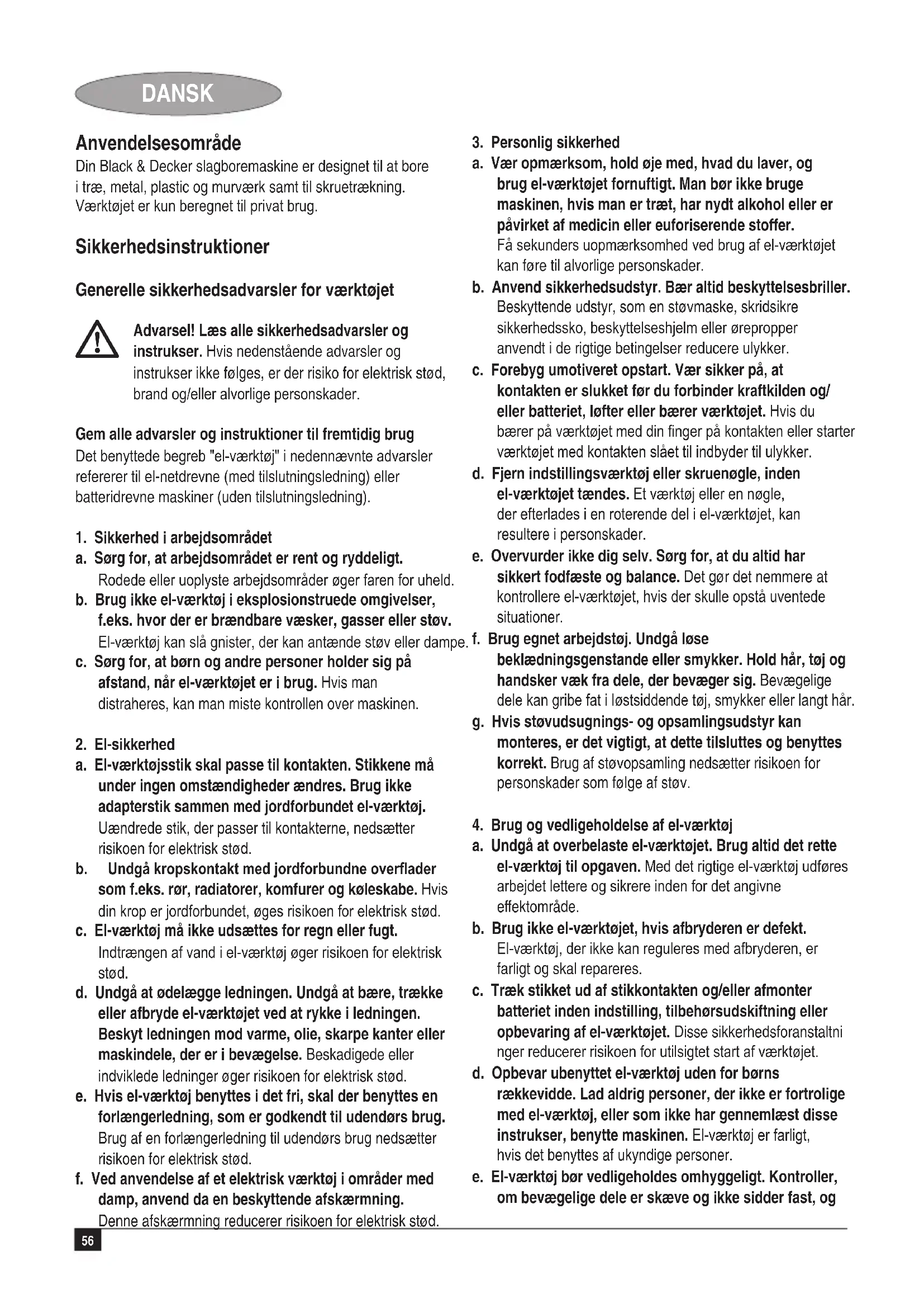 Kevin Hewitt Vice-President Global Engineering Black & Decker Europe, 210 Bath Road, Slough, Berkshire, SL1 3YD Storbritannien 30/03/2010 Reservedele / reparationer Reservedele kan købes hos autoriserede Black & Decker serviceværksteder, som giver forslag til omkostninger og reparerer vore produkter. Oversigt over vore autoriserede værksteder ndes på internettet på vor hjemmeside www.blackanddecker.dk samt www.2helpU.com Garanti Black & Decker garanterer, at produktet er fri for materielle skader og/eller fabrikationsfejl ved levering til kunden. Garantien er et tillæg til konsumentens lovlige rettigheder og påvirker ikke disse. Garantien gælder indenfor medlemsstaterne af den Europæiske Union og i det Europæiske Frihandelsområde. Hvis et Black & Decker produkt går i stykker på grund af materiel skade og/eller fabrikationsfejl eller på anden måde ikke fungerer i overensstemmelse med specikationen, inden for 24 måneder fra købsdatoen, påtager Black & Decker sig at reparere eller ombytte produktet med mindst muligt besvær for kunden. Garantien gælder ikke for fejl og mangler, der er sket i forbindelse med: u normal slitageu uheldige følger efter unormal anvendelse af værktøjetu overbelastning, hærværk eller overdrevent intensivt brug af værktøjet u ulykkeshændelse Garantien gælder ikke hvis reparationer er udført af nogen anden end et autoriseret Black & Decker værksted. For at udnytte garantien skal produktet og købskvitteringen indleveres til forhandleren eller til et autoriseret værksted, senest 2 måneder efter at fejlen opdages. For information om nærmeste autoriserede værksted: kontakt det lokale Black & Decker kontor på den adresse som er opgivet i brugsanvisningen. Liste over alle autoriserede Black & Decker serviceværksteder samt servicevilkår er tilgængelig på internettet, på adressen www.2helpU.com Gå venligst ind på vores website www.blackanddecker.dk for at registrere dit nye produkt og for at blive holdt ajour om nye produkter og specialtilbud. Der ndes yderligere oplysninger om mærket Black & Decker og vores produktsortiment på adressen www.blackanddecker.dk61 SUOMI Käyttötarkoitus Black & Deckerin iskuporakone on tarkoitettu ruuvaamiseen sekä puun, metallin, muovin ja betonin poraamiseen. Kone on tarkoitettu kotikäyttöön. Turvaohjeet Yleiset sähkötyökalujen turvallisuusohjeet