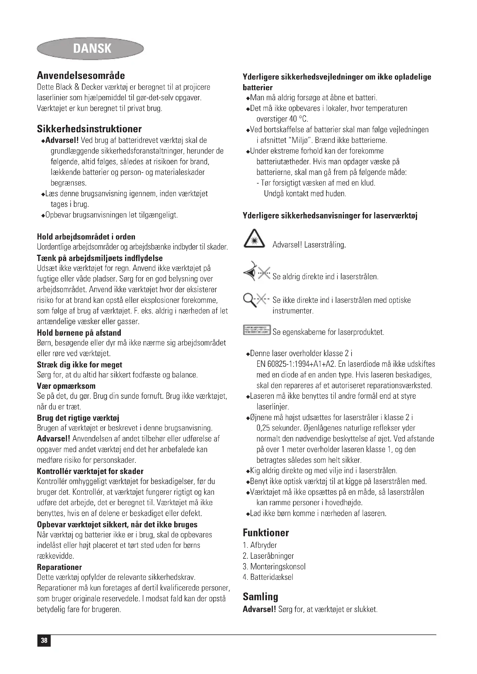 Kevin Hewitt Director of Consumer Engineering Spennymoor, County Durham DL16 6JG, United Kingdom 1-12-2004 Reservdeler / reparasjoner Reservdeler kan kjøpes hos autoriserte Black & Decker serviceverksteder, som også gir kostnadsoverslag og reparerer våre produkter. Oversikt over våre autoriserte serviceverksteder finnes på Internet, vår hjemmeside www.blackanddecker.no samt www.2helpU.com Garanti Black & Decker garanterer at produktet ikke har material- og/eller fabrikasjonsfeil ved levering til kunde. Garantien er i tillegg til kundens lovlige rettigheter og påvirker ikke disse. Garantien gjelder innen medlemsstatene i den Europeiske Unionen og i det Europeiske Frihandelsområdet. Hvis et Black & Decker produkt går i stykker på grunn av material- og/eller fabrikasjonsfeil eller har mangler i forhold til spesifikasjonene, innen 24 måneder fra kjøpet, påtar Black & Decker seg å reparere eller bytte ut produktet med minst mulig vanskelighet for kunden. Garantien gjelder ikke for feil som kommer av: ◆ normal slittasje ◆ feilaktig bruk eller vedlikehold (mislighold) ◆ at produktet har blitt skadet av fremmede gjenstander, emner eller ved et uhell Det gjøres oppmerksom på at produktet ikke er beregnet på industriell/profesjonell/yrkesmessig bruk, men til hus- og hjemmebruk. Garantien gjelder ikke om reparasjoner har blitt utført av noen andre enn et autorisert Black & Decker serviceverksted. For å ta garantien i bruk skal produktet og kjøpekvittering leveres til forhandleren eller til et autorisert serviceverksted senest 2 måneder etter at feilen har blitt oppdaget.37 NORSK For informasjon om nærmeste autoriserte serviceverksted; kontakt det lokale Black & Decker kontoret på den adressen som er angitt i bruksanvisningen. En oversikt over alle autoriserte serviceverksteder samt servicevilkår finnes også tilgjengelig på Internet, adresse: www.2helpU.com Vennligst stikk innom våre nettsider på www.blackanddecker.no for å registrere ditt nye Black & Decker-produkt og for å holde deg oppdatert om nye produkter og spesialtilbud. Du finner mer informasjon om Black & Decker og produktutvalget vårt på www.blackanddecker.no38 DANSK Anvendelsesområde Dette Black & Decker værktøj er beregnet til at projicere laserlinier som hjælpemiddel til gør-det-selv opgaver. Værktøjet er kun beregnet til privat brug. Sikkerhedsinstruktioner ◆ Advarsel! Ved brug af batteridrevet værktøj skal de grundlæggende sikkerhedsforanstaltninger, herunder de følgende, altid følges, således at risikoen for brand, lækkende batterier og person- og materialeskader begrænses. ◆ Læs denne brugsanvisning igennem, inden værktøjet tages i brug. ◆ Opbevar brugsanvisningen let tilgængeligt. Hold arbejdsområdet i orden Uordentlige arbejdsområder og arbejdsbænke indbyder til skader. Tænk på arbejdsmiljøets indflydelse Udsæt ikke værktøjet for regn. Anvend ikke værktøjet på fugtige eller våde pladser. Sørg for en god belysning over arbejdsområdet. Anvend ikke værktøjet hvor der eksisterer risiko for at brand kan opstå eller eksplosioner forekomme, som følge af brug af værktøjet. F. eks. aldrig i nærheden af let antændelige væsker eller gasser. Hold børnene på afstand Børn, besøgende eller dyr må ikke nærme sig arbejdsområdet eller røre ved værktøjet. Stræk dig ikke for meget Sørg for, at du altid har sikkert fodfæste og balance. Vær opmærksom Se på det, du gør. Brug din sunde fornuft. Brug ikke værktøjet, når du er træt. Brug det rigtige værktøj Brugen af værktøjet er beskrevet i denne brugsanvisning. Advarsel! Anvendelsen af andet tilbehør eller udførelse af opgaver med andet værktøj end det her anbefalede kan medføre risiko for personskader. Kontrollér værktøjet for skader Kontrollér omhyggeligt værktøjet for beskadigelser, før du bruger det. Kontrollér, at værktøjet fungerer rigtigt og kan udføre det arbejde, det er beregnet til. Værktøjet må ikke benyttes, hvis en af delene er beskadiget eller defekt. Opbevar værktøjet sikkert, når det ikke bruges Når værktøj og batterier ikke er i brug, skal de opbevares indelåst eller højt placeret et tørt sted uden for børns rækkevidde. Reparationer Dette værktøj opfylder de relevante sikkerhedskrav. Reparationer må kun foretages af dertil kvalificerede personer, som bruger originale reservedele. I modsat fald kan der opstå betydelig fare for brugeren. Yderligere sikkerhedsvejledninger om ikke opladelige batterier ◆ Man må aldrig forsøge at åbne et batteri. ◆ Det må ikke opbevares i lokaler, hvor temperaturen overstiger 40 °C. ◆ Ved bortskaffelse af batterier skal man følge vejledningen i afsnittet “Miljø”. Brænd ikke batterierne. ◆ Under ekstreme forhold kan der forekomme batteriutætheder. Hvis man opdager væske på batterierne, skal man gå frem på følgende måde: - Tør forsigtigt væsken af med en klud. Undgå kontakt med huden. Yderligere sikkerhedsanvisninger for laserværktøj Advarsel! Laserstråling. Se aldrig direkte ind i laserstrålen. Se ikke direkte ind i laserstrålen med optiske instrumenter. Se egenskaberne for laserproduktet. ◆ Denne laser overholder klasse 2 i EN 60825-1:1994+A1+A2. En laserdiode må ikke udskiftes med en diode af en anden type. Hvis laseren beskadiges, skal den repareres af et autoriseret reparationsværksted. ◆ Laseren må ikke benyttes til andre formål end at styre laserlinjer. ◆ Øjnene må højst udsættes for laserstråler i klasse 2 i 0,25 sekunder. Øjenlågenes naturlige reflekser yder normalt den nødvendige beskyttelse af øjet. Ved afstande på over 1 meter overholder laseren klasse 1, og den betragtes således som helt sikker. ◆ Kig aldrig direkte og med vilje ind i laserstrålen. ◆ Benyt ikke optisk værktøj til at kigge på laserstrålen med. ◆ Værktøjet må ikke opsættes på en måde, så laserstrålen kan ramme personer i hovedhøjde. ◆ Lad ikke børn komme i nærhe