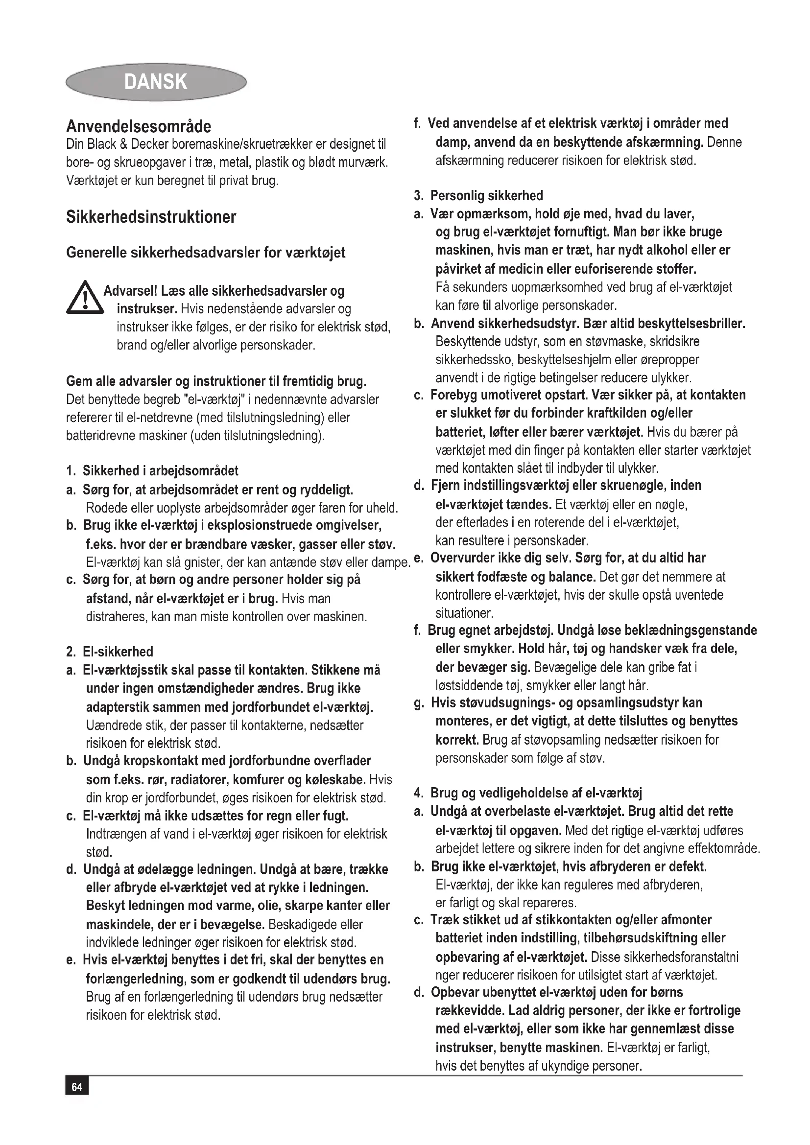 Kevin Hewitt Director of Consumer Engineering Spennymoor, County Durham DL16 6JG, Storbritannien 1-9-2007 Reservedele / reparationer Reservedele kan købes hos autoriserede Black & Decker serviceværksteder, som giver forslag til omkostninger og reparerer vore produkter. Oversigt over vore autoriserede værksteder findes på internettet på vor hjemmeside www.blackanddecker.dk samt www.2helpU.com Garanti Black & Decker garanterer, at produktet er fri for materielle skader og/eller fabrikationsfejl ved levering til kunden. Garantien er et tillæg til konsumentens lovlige rettigheder og påvirker ikke disse. Garantien gælder indenfor medlemsstaterne af den Europæiske Union og i det Europæiske Frihandelsområde. Hvis et Black & Decker produkt går i stykker på grund af materiel skade og/eller fabrikationsfejl eller på anden måde ikke fungerer i overensstemmelse med specifikationen, inden for 24 måneder fra købsdatoen, påtager Black & Decker sig at reparere eller ombytte produktet med mindst muligt besvær for kunden. Garantien gælder ikke for fejl og mangler, der er sket i forbindelse med: normal slitage uheldige følger efter unormal anvendelse af værktøjet overbelastning, hærværk eller overdrevent intensivt brug af værktøjet ulykkeshændelse Garantien gælder ikke hvis reparationer er udført af nogen anden end et autoriseret Black & Decker værksted. For at udnytte garantien skal produktet og købskvitteringen indleveres til forhandleren eller til et autoriseret værksted, senest 2 måneder efter at fejlen opdages. For information om nærmeste autoriserede værksted: kontakt det lokale Black & Decker kontor på den adresse som er opgivet i brugsanvisningen. Liste over alle autoriserede Black & Decker serviceværksteder samt servicevilkår er tilgængelig på internettet, på adressen www.2helpU.com Gå venligst ind på vores website www.blackanddecker.dk for at registrere dit nye produkt og for at blive holdt ajour om nye produkter og specialtilbud. Der findes yderligere oplysninger om mærket Black & Decker og vores produktsortiment på adressen www.blackanddecker.dk70 SUOMI Käyttötarkoitus Black & Deckerin porakone/ruuvinväännin on suunniteltu ruuvaamiseen sekä puun, metallin, muovien ja betonin poraamiseen. Kone on tarkoitettu kotikäyttöön. Turvaohjeet Yleiset sähkötyökalujen turvallisuusohjeet