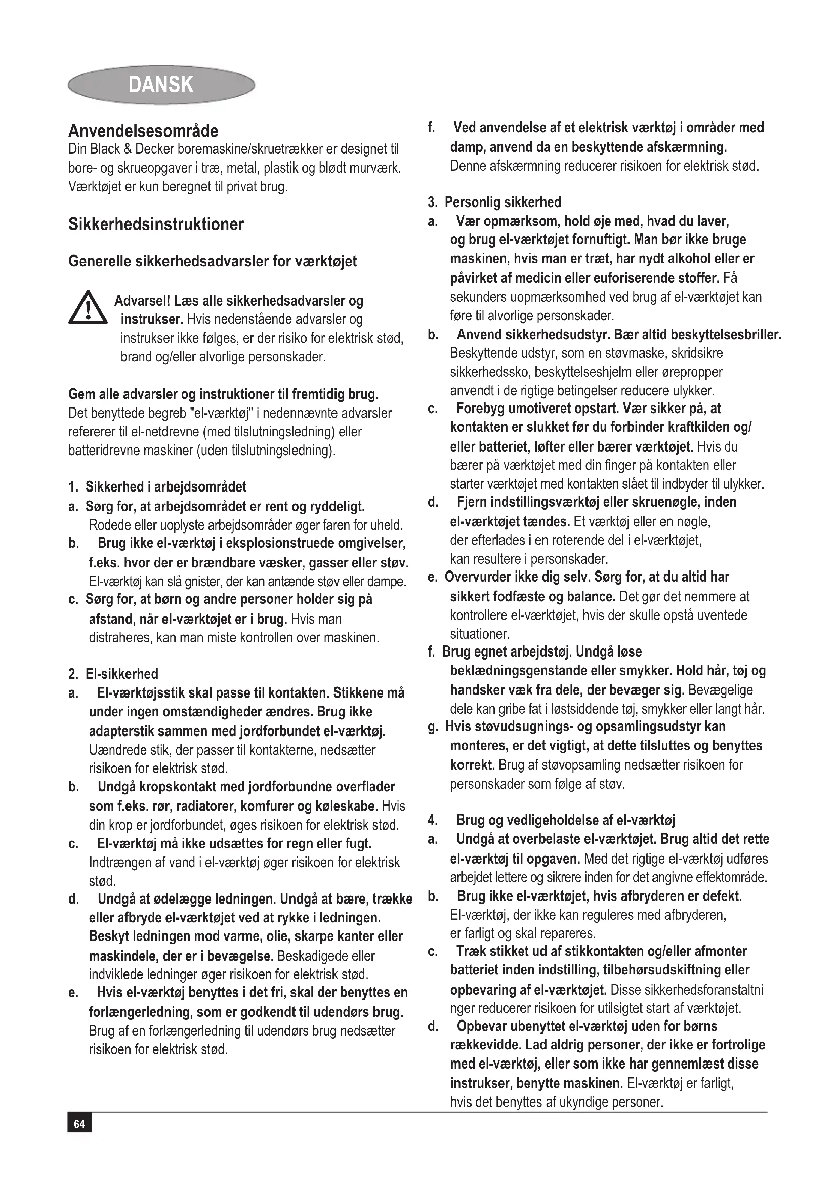 Kevin Hewitt Director of Consumer Engineering Spennymoor, County Durham DL16 6JG, Storbritannien 02-6-2009 Reservedele / reparationer Reservedele kan købes hos autoriserede Black & Decker serviceværksteder, som giver forslag til omkostninger og reparerer vore produkter. Oversigt over vore autoriserede værksteder ndes på internettet på vor hjemmeside www.blackanddecker.dk samt www.2helpU.com Garanti Black & Decker garanterer, at produktet er fri for materielle skader og/eller fabrikationsfejl ved levering til kunden. Garantien er et tillæg til konsumentens lovlige rettigheder og påvirker ikke disse. Garantien gælder indenfor medlemsstaterne af den Europæiske Union og i det Europæiske Frihandelsområde. Hvis et Black & Decker produkt går i stykker på grund af materiel skade og/eller fabrikationsfejl eller på anden måde ikke fungerer i overensstemmelse med specikationen, inden for 24 måneder fra købsdatoen, påtager Black & Decker sig at reparere eller ombytte produktet med mindst muligt besvær for kunden. Garantien gælder ikke for fejl og mangler, der er sket i forbindelse med: u normal slitageu uheldige følger efter unormal anvendelse af værktøjetu overbelastning, hærværk eller overdrevent intensivt brug af værktøjet u ulykkeshændelse Garantien gælder ikke hvis reparationer er udført af nogen anden end et autoriseret Black & Decker værksted. For at udnytte garantien skal produktet og købskvitteringen indleveres til forhandleren eller til et autoriseret værksted, senest 2 måneder efter at fejlen opdages. For information om nærmeste autoriserede værksted: kontakt det lokale Black & Decker kontor på den adresse som er opgivet i brugsanvisningen. Liste over alle autoriserede Black & Decker serviceværksteder samt servicevilkår er tilgængelig på internettet, på adressen www.2helpU.com Gå venligst ind på vores website www.blackanddecker.dk for at registrere dit nye produkt og for at blive holdt ajour om nye produkter og specialtilbud. Der ndes yderligere oplysninger om mærket Black & Decker og vores produktsortiment på adressen www.blackanddecker.dk70 SUOMI Käyttötarkoitus Black & Deckerin porakone/ruuvinväännin on suunniteltu ruuvaamiseen sekä puun, metallin, muovien ja betonin poraamiseen. Kone on tarkoitettu kotikäyttöön. Turvaohjeet Yleiset sähkötyökalujen turvallisuusohjeet