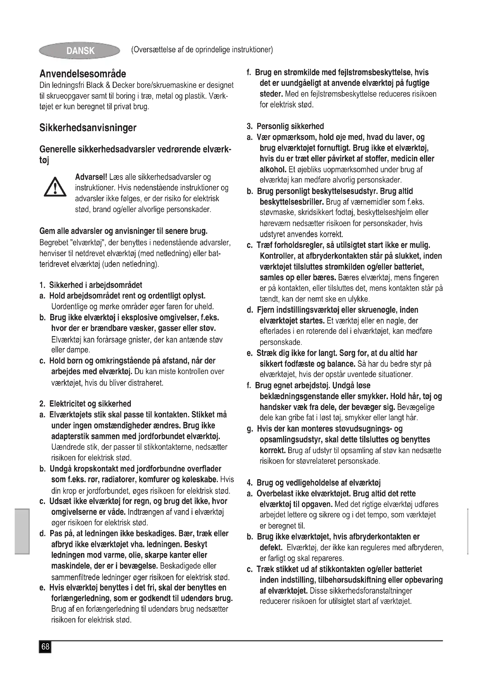 Kevin Hewitt Vice-President Global Engineering Black & Decker Europe, 210 Bath Road, Slough, Berkshire, SL1 3YD Storbritannien 16/11/201074 (Oversættelse af de oprindelige instruktioner) DANSK Garanti Black & Decker garanterer, at produktet er fri for skader og fejl og tilbyder en fremragende garanti. Garantien er et tillæg til forbrugerens lovsikrede rettigheder og påvirker ikke disse. Ga- rantien gælder inden for medlemsstaterne af den Europæiske Union og i det Europæiske Frihandelsområde. Hvis et Black & Decker-produkt går i stykker på grund af materiel skade og/eller fabrikationsfejl eller på anden måde ikke fungerer i overensstemmelse med specikationen inden for 24 måneder fra købsdatoen, påtager Black & Decker sig at reparere eller ombytte produktet med mindst mulig ulempe for kunden. Garantien gælder ikke for fejl og mangler, der er sket i forbindelse med: u Produktet har været anvendt erhvervsmæssigt eller til udlejning. u Produktet har været anvendt forkert eller er ikke vedlige- holdt. u Produktet er beskadiget af fremmedlegemer, substanser eller pga. uheld. u Garantien gælder ikke, hvis reparationer er udført af andre end et autoriseret Black & Decker-værksted. For at udnytte garantien skal produktet og købskvitteringen indleveres til forhandleren eller til et autoriseret værksted. Kontakt det lokale Black & Decker-kontor på den adresse, der er opgivet i denne vejledning, for at få oplysninger om nærmeste autoriserede værksted. En liste over alle autoris- erede Black & Decker-serviceværksteder samt servicevilkår og kontaktpersoner er tilgængelig på internettet på adressen: www.2helpU.com Gå venligst ind på vores website www.blackanddecker.dk for at registrere dit nye produkt og for at blive holdt ajour om nye produkter og specialtilbud. Der ndes yderligere oplysninger om mærket Black & Decker og vores produktsortiment på adressen www.blackanddecker.dk75 (Alkuperäisten ohjeiden käännös) SUOMI Käyttötarkoitus Tämä Black & Deckerin pora/ruuvinväännin on tarkoitettu ruuvien kiinnittämiseen sekä puun, metallin ja muovin poraam- iseen. Tämä työkalu on tarkoitettu vain yksityiskäyttöön. Turvallisuusohjeet Sähkötyökalujen yleiset turvavaroitukset