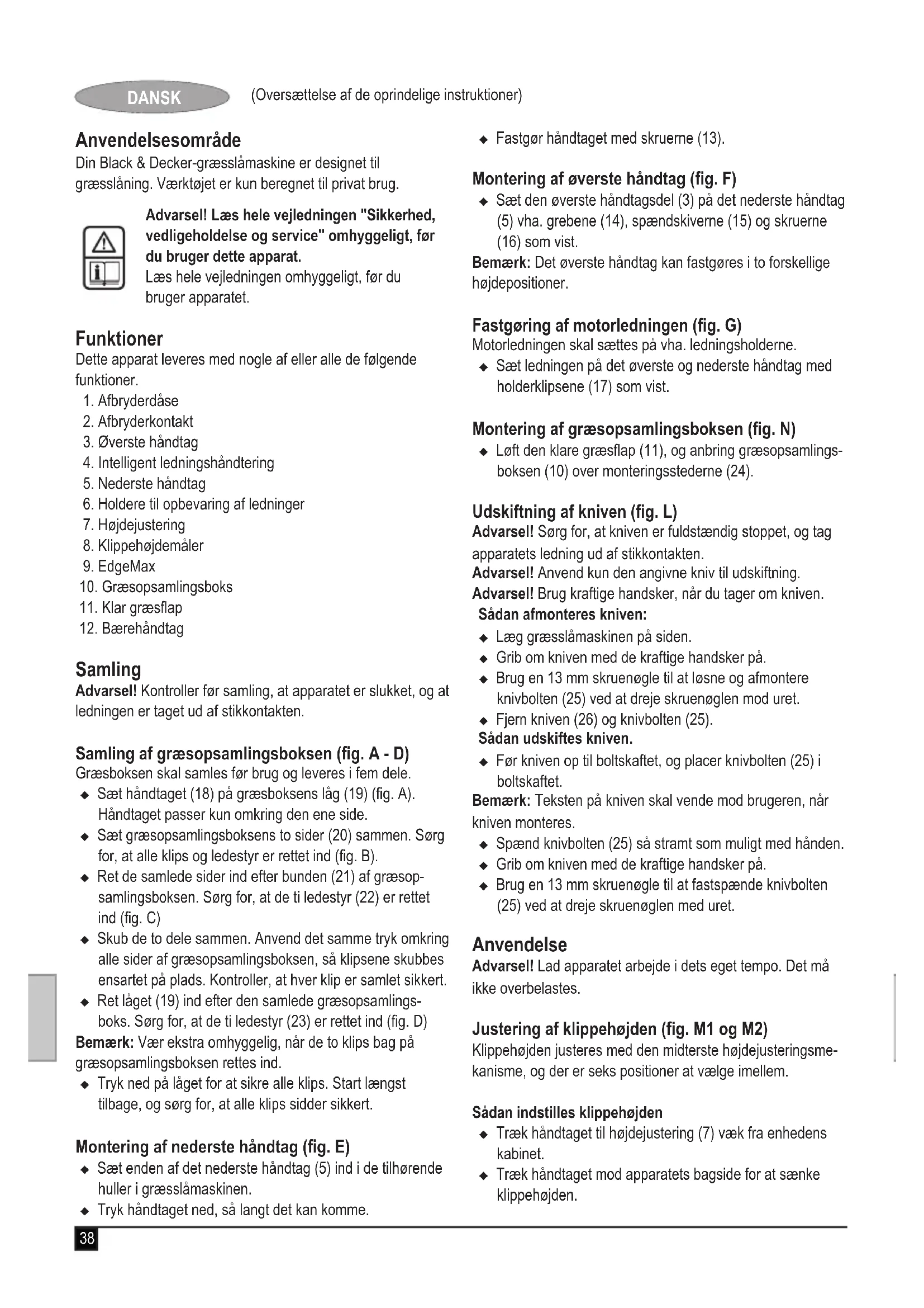 (Oversættelse af de oprindelige instruktioner) DANSK Anvendelsesområde Din Black & Decker-græsslåmaskine er designet til græsslåning. Værktøjet er kun beregnet til privat brug. Advarsel! Læs hele vejledningen "Sikkerhed, vedligeholdelse og service" omhyggeligt, før du bruger dette apparat. Læs hele vejledningen omhyggeligt, før du bruger apparatet. Funktioner Dette apparat leveres med nogle af eller alle de følgende funktioner.