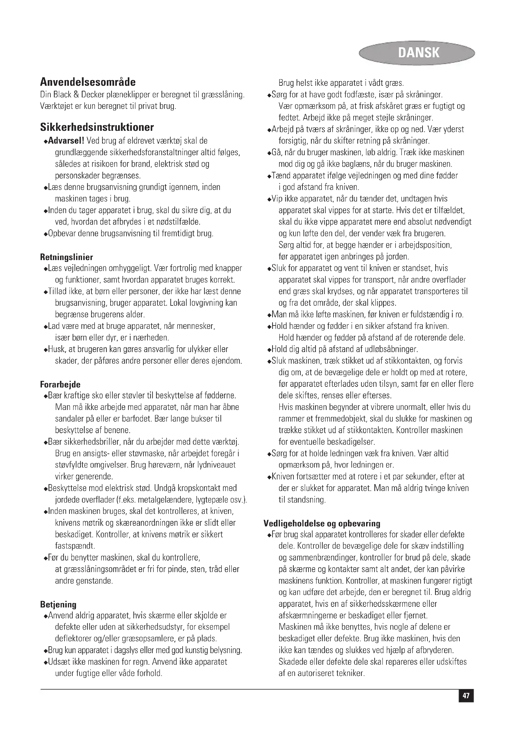Kevin Hewitt Director of Consumer Engineering Spennymoor, County Durham DL16 6JG, United Kingdom 1-10-2003 Reservdeler / reparasjoner Reservdeler kan kjøpes hos autoriserte Black & Decker serviceverksteder, som også gir kostnadsoverslag og reparerer våre produkter. Oversikt over våre autoriserte serviceverksteder finnes på Internet, vår hjemmeside www.blackdecker.no samt www.2helpU.com. Garanti Black & Decker garanterer at produktet ikke har material- og/ eller fabrikasjonsfeil ved levering til kunde. Garantien er i tillegg til kundens lovlige rettigheter og påvirker ikke disse. Garantien gjelder innen medlemsstatene i den Europeiske Unionen og i det Europeiske Frihandelsområdet. Hvis et Black & Decker produkt går i stykker på grunn av material- og/eller fabrikasjonsfeil eller har mangler i forhold til spesifikasjonene, innen 24 måneder fra kjøpet, påtar Black & Decker seg å reparere eller bytte ut produktet med minst mulig vanskelighet for kunden. Garantien gjelder ikke for feil som kommer av: ◆ normal slittasje ◆ feilaktig bruk eller vedlikehold (mislighold) ◆ at produktet har blitt skadet av fremmede gjenstander, emner eller ved et uhell Det gjøres oppmerksom på at produktet ikke er beregnet på industriell/profesjonell/yrkesmessig bruk, men til hus- og hjemmebruk. Garantien gjelder ikke om reparasjoner har blitt utført av noen andre enn et autorisert Black & Decker serviceverksted. For å ta garantien i bruk skal produktet og kjøpekvittering leveres til forhandleren eller til et autorisert serviceverksted senest 2 måneder etter at feilen har blitt oppdaget. For informasjon om nærmeste autoriserte serviceverksted; kontakt det lokale Black & Decker kontoret på den adressen som er angitt i bruksanvisningen. En oversikt over alle autoriserte serviceverksteder samt servicevilkår finnes også tilgjengelig på Internet, adresse: www.2helpU.com. Vennligst stikk innom våre nettsider på www.blackanddecker.com for å registrere ditt nye Black & Decker-produkt og for å holde deg oppdatert om nye produkter og spesialtilbud. Du finner mer informasjon om Black & Decker og produktutvalget vårt på www.blackanddecker.com.47 DANSK Anvendelsesområde Din Black & Decker plæneklipper er beregnet til græsslåning. Værktøjet er kun beregnet til privat brug. Sikkerhedsinstruktioner ◆ Advarsel! Ved brug af eldrevet værktøj skal de grundlæggende sikkerhedsforanstaltninger altid følges, således at risikoen for brand, elektrisk stød og personskader begrænses. ◆ Læs denne brugsanvisning grundigt igennem, inden maskinen tages i brug. ◆ Inden du tager apparatet i brug, skal du sikre dig, at du ved, hvordan det afbrydes i et nødstilfælde. ◆ Opbevar denne brugsanvisning til fremtidigt brug. Retningslinier ◆ Læs vejledningen omhyggeligt. Vær fortrolig med knapper og funktioner, samt hvordan apparatet bruges korrekt. ◆ Tillad ikke, at børn eller personer, der ikke har læst denne brugsanvisning, bruger apparatet. Lokal lovgivning kan begrænse brugerens alder. ◆ Lad være med at bruge apparatet, når mennesker, især børn eller dyr, er i nærheden. ◆ Husk, at brugeren kan gøres ansvarlig for ulykker eller skader, der påføres andre personer eller deres ejendom. Forarbejde ◆ Bær kraftige sko eller støvler til beskyttelse af fødderne. Man må ikke arbejde med apparatet, når man har åbne sandaler på eller er barfodet. Bær lange bukser til beskyttelse af benene. ◆ Bær sikkerhedsbriller, når du arbejder med dette værktøj. Brug en ansigts- eller støvmaske, når arbejdet foregår i støvfyldte omgivelser. Brug høreværn, når lydniveauet virker generende. ◆ Beskyttelse mod elektrisk stød. Undgå kropskontakt med jordede overflader (f.eks. metalgelændere, lygtepæle osv.). ◆ Inden maskinen bruges, skal det kontrolleres, at kniven, knivens møtrik og skæreanordningen ikke er slidt eller beskadiget. Kontroller, at knivens møtrik er sikkert fastspændt. ◆ Før du benytter maskinen, skal du kontrollere, at græsslåningsområdet er fri for pinde, sten, tråd eller andre genstande. Betjening ◆ Anvend aldrig apparatet, hvis skærme eller skjolde er defekte eller uden at sikkerhedsudstyr, for eksempel deflektorer og/eller græsopsamlere, er på plads. ◆ Brug kun apparatet i dagslys eller med god kunstig belysning. ◆ Udsæt ikke maskinen for regn. Anvend ikke apparatet under fugtige eller våde forhold. Brug helst ikke apparatet i vådt græs. ◆ Sørg for at have godt fodfæste, især på skråninger. Vær opmærksom på, at frisk afskåret græs er fugtigt og fedtet. Arbejd ikke på meget stejle skråninger. ◆ Arbejd på tværs af skråninger, ikke op og ned. Vær yderst forsigtig, når du skifter retning på skråninger. ◆ Gå, når du bruger maskinen, løb aldrig. Træk ikke maskinen mod dig og gå ikke baglæns, når du bruger maskinen. ◆ Tænd apparatet ifølge vejledningen og med dine fødder i god afstand fra kniven. ◆ Vip ikke apparatet, når du tænder det, undtagen hvis apparatet skal vippes for at starte. Hvis det er tilfældet, skal du ikke vippe apparatet mere end absolut nødvendigt og kun løfte den del, der vender væk fra brugeren. Sørg altid for, at begge hænder er i arbejdsposition, før apparatet igen anbringes på jorden. ◆ Sluk for apparatet og vent til kniven er standset, hvis apparatet skal vippes for transport, når andre overflader end græs skal krydses, og når apparatet transporteres til og fra det område, der skal klippes. ◆ Man må ikke løfte maskinen, før kniven er fuldstændig i ro. ◆ Hold hænder og fødder i en sikker afstand fra kniven. Hold hænder og fødder på afstand af de roterende dele. ◆ Hold dig altid på afstand af udløbsåbninger. ◆ Sluk maskinen, træk stikket ud af stikkontakten, og forvis dig om, at de bevægelige dele er holdt op med at rotere, før apparatet efterlades uden tilsyn, samt før en eller flere dele skiftes, renses eller efterses. Hvis maskinen b