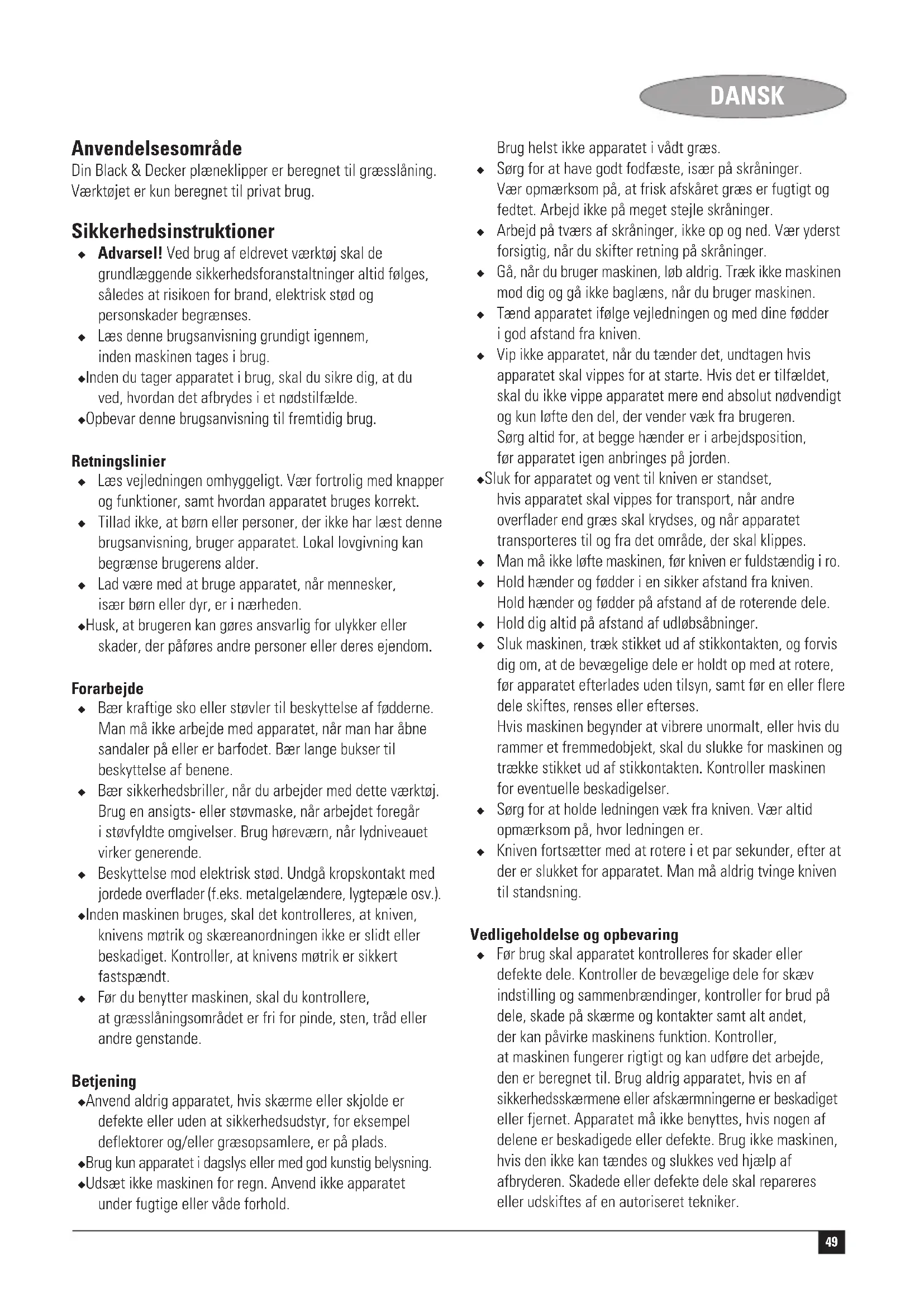 Kevin Hewitt Adm. dir. for forbrukerteknikk Spennymoor, County Durham DL16 6JG, Storbritannia 1-8-2004 Reservdeler / reparasjoner Reservdeler kan kjøpes hos autoriserte Black & Decker serviceverksteder, som også gir kostnadsoverslag og reparerer våre produkter. Oversikt over våre autoriserte serviceverksteder finnes på Internet, vår hjemmeside www.blackanddecker.no samt www.2helpU.com Garanti Black & Decker garanterer at produktet ikke har material- og/eller fabrikasjonsfeil ved levering til kunde. Garantien er i tillegg til kundens lovlige rettigheter og påvirker ikke disse. Garantien gjelder innen medlemsstatene i den Europeiske Unionen og i det Europeiske Frihandelsområdet. Hvis et Black & Decker produkt går i stykker på grunn av material- og/eller fabrikasjonsfeil eller har mangler i forhold til spesifikasjonene, innen 24 måneder fra kjøpet, påtar Black & Decker seg å reparere eller bytte ut produktet med minst mulig vanskelighet for kunden. Garantien gjelder ikke for feil som kommer av: ◆ normal slittasje ◆ feilaktig bruk eller vedlikehold (mislighold) ◆ at produktet har blitt skadet av fremmede gjenstander, emner eller ved et uhell Det gjøres oppmerksom på at produktet ikke er beregnet på industriell/profesjonell/yrkesmessig bruk, men til hus- og hjemmebruk. Garantien gjelder ikke om reparasjoner har blitt utført av noen andre enn et autorisert Black & Decker serviceverksted.48 NORSK For å ta garantien i bruk skal produktet og kjøpekvittering leveres til forhandleren eller til et autorisert serviceverksted senest 2 måneder etter at feilen har blitt oppdaget. For informasjon om nærmeste autoriserte serviceverksted; kontakt det lokale Black & Decker kontoret på den adressen som er angitt i bruksanvisningen. En oversikt over alle autoriserte serviceverksteder samt servicevilkår finnes også tilgjengelig på Internet, adresse: www.2helpU.com Vennligst stikk innom våre nettsider på www.blackanddecker.no for å registrere ditt nye Black & Decker-produkt og for å holde deg oppdatert om nye produkter og spesialtilbud. Du finner mer informasjon om Black & Decker og produktutvalget vårt på www.blackanddecker.no49 DANSK Anvendelsesområde Din Black & Decker plæneklipper er beregnet til græsslåning. Værktøjet er kun beregnet til privat brug. Sikkerhedsinstruktioner ◆ Advarsel! Ved brug af eldrevet værktøj skal de grundlæggende sikkerhedsforanstaltninger altid følges, således at risikoen for brand, elektrisk stød og personskader begrænses. ◆ Læs denne brugsanvisning grundigt igennem, inden maskinen tages i brug. ◆ Inden du tager apparatet i brug, skal du sikre dig, at du ved, hvordan det afbrydes i et nødstilfælde. ◆ Opbevar denne brugsanvisning til fremtidig brug. Retningslinier ◆ Læs vejledningen omhyggeligt. Vær fortrolig med knapper og funktioner, samt hvordan apparatet bruges korrekt. ◆ Tillad ikke, at børn eller personer, der ikke har læst denne brugsanvisning, bruger apparatet. Lokal lovgivning kan begrænse brugerens alder. ◆ Lad være med at bruge apparatet, når mennesker, især børn eller dyr, er i nærheden. ◆ Husk, at brugeren kan gøres ansvarlig for ulykker eller skader, der påføres andre personer eller deres ejendom. Forarbejde ◆ Bær kraftige sko eller støvler til beskyttelse af fødderne. Man må ikke arbejde med apparatet, når man har åbne sandaler på eller er barfodet. Bær lange bukser til beskyttelse af benene. ◆ Bær sikkerhedsbriller, når du arbejder med dette værktøj. Brug en ansigts- eller støvmaske, når arbejdet foregår i støvfyldte omgivelser. Brug høreværn, når lydniveauet virker generende. ◆ Beskyttelse mod elektrisk stød. Undgå kropskontakt med jordede overflader (f.eks. metalgelændere, lygtepæle osv.). ◆ Inden maskinen bruges, skal det kontrolleres, at kniven, knivens møtrik og skæreanordningen ikke er slidt eller beskadiget. Kontroller, at knivens møtrik er sikkert fastspændt. ◆ Før du benytter maskinen, skal du kontrollere, at græsslåningsområdet er fri for pinde, sten, tråd eller andre genstande. Betjening ◆ Anvend aldrig apparatet, hvis skærme eller skjolde er defekte eller uden at sikkerhedsudstyr, for eksempel deflektorer og/eller græsopsamlere, er på plads. ◆ Brug kun apparatet i dagslys eller med god kunstig belysning. ◆ Udsæt ikke maskinen for regn. Anvend ikke apparatet under fugtige eller våde forhold. Brug helst ikke apparatet i vådt græs. ◆ Sørg for at have godt fodfæste, især på skråninger. Vær opmærksom på, at frisk afskåret græs er fugtigt og fedtet. Arbejd ikke på meget stejle skråninger. ◆ Arbejd på tværs af skråninger, ikke op og ned. Vær yderst forsigtig, når du skifter retning på skråninger. ◆ Gå, når du bruger maskinen, løb aldrig. Træk ikke maskinen mod dig og gå ikke baglæns, når du bruger maskinen. ◆ Tænd apparatet ifølge vejledningen og med dine fødder i god afstand fra kniven. ◆ Vip ikke apparatet, når du tænder det, undtagen hvis apparatet skal vippes for at starte. Hvis det er tilfældet, skal du ikke vippe apparatet mere end absolut nødvendigt og kun løfte den del, der vender væk fra brugeren. Sørg altid for, at begge hænder er i arbejdsposition, før apparatet igen anbringes på jorden. ◆ Sluk for apparatet og vent til kniven er standset, hvis apparatet skal vippes for transport, når andre overflader end græs skal krydses, og når apparatet transporteres til og fra det område, der skal klippes. ◆ Man må ikke løfte maskinen, før kniven er fuldstændig i ro. ◆ Hold hænder og fødder i en sikker afstand fra kniven. Hold hænder og fødder på afstand af de roterende dele. ◆ Hold dig altid på afstand af udløbsåbninger. ◆ Sluk maskinen, træk stikket ud af stikkontakten, og forvis dig om, at de bevægelige dele er holdt op med at rotere, før apparatet efterlades uden tilsyn, samt før en eller flere dele skiftes, renses eller efterses. Hvis maskinen b