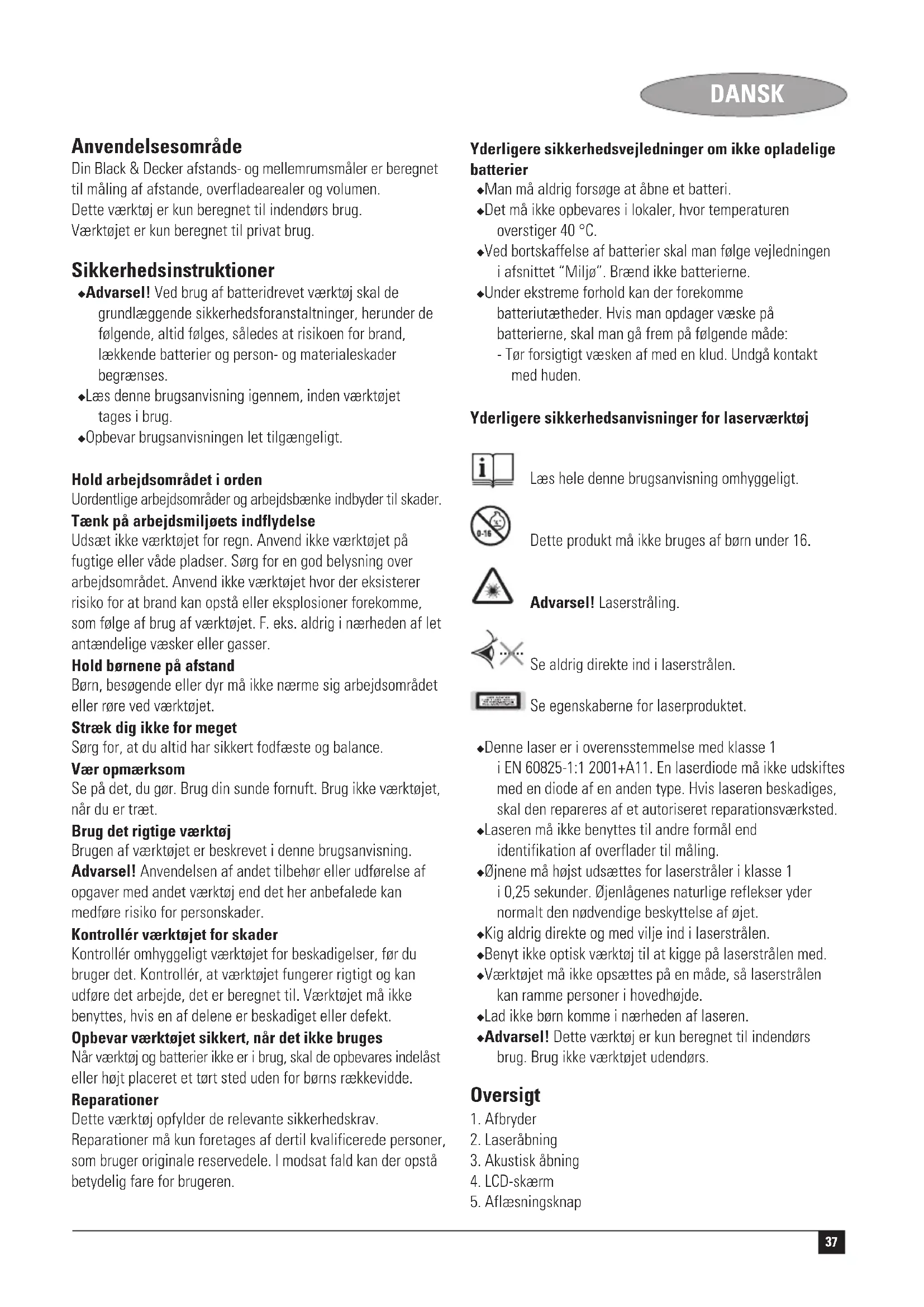 Samling Isætning af batteriet (fig. B) ◆ Tag batteridækslet (7) af værktøjet. ◆ Slut batteriet til konnektoren. Den store batteripol skal sluttes til den lille konnektorpol. ◆ Sæt dækslet på igen, og lad det klikke på plads. Anvendelse Indstilling af værktøjet (fig. A, C & E) Dette værktøj kan vise resultaterne enten fra forenden (18) eller bagenden (19). ◆ Tryk på tast (8) for at skifte fra den ene målemetode til den anden. Indstilling af målehovedet (fig. E) ◆ Drej målehovedet. Sæt ikke hovedet i mellemliggende vinkler, da dette vil føre til unøjagtige resultater. Valg af målesystem (fig. A & D) Apparatet kan vise resultaterne i både metrisk (16) og britisk standard (17). ◆ Tryk på tast (9) for at skifte fra det ene målesystem til det andet. Hukommelsesfunktion (fig. A & D) Brugen af hukommelsesfunktionen (20) er angivet på displayet. ◆ Tryk på tasten (14) for at gemme skærmværdien i hukommelsen. Værdien bliver i hukommelsen, så længe apparatet er tændt. ◆ Tryk igen på tasten (14) for at rydde hukommelsen. Tænding og slukning (fig. B) ◆ For at tænde værktøjet, sættes tænd/sluk knappen (1) på I position. ◆ For at slukke værktøjet, sættes tænd/sluk knappen på O position. Måling (fig. A) ◆ Hold værktøjet i den nødvendige position med målehovedet rettet mod den modsatte overflade. ◆ Tryk på tasten (5). Resultatet vises på displayet (4). Bemærk: - Under en måling hjælper laserpletten til at identificere den modsatte overflade. - Efter 15 sekunder uden aktivitet bliver LCD-skærmen blank. De sidste måledata kan ikke hentes, hvis de ikke er blevet gemt i hukommelsen. Måle afstande (fig. A) ◆ Mål den første afstand. ◆ Tryk på tasten (12). ◆ Mål den næste afstand. ◆ Gentag dette det nødvendige antal gange på de resterende afstande. ◆ Tryk på tasten (15). Resultatet vises på displayet (4). Måle arealer (fig. A) ◆ Mål længden. ◆ Tryk på tasten (11). ◆ Mål bredden. ◆ Tryk på tasten (15). Resultatet vises på displayet (4) i kvadratenheder. Måle volumen (fig. A) ◆ Mål længden. ◆ Tryk på tasten (11). ◆ Mål bredden. ◆ Tryk på tasten (11). ◆ Mål højden. ◆ Tryk på tasten (15). Resultatet vises på displayet (4) i kubikenheder. Gode råd til optimalt brug ◆ Værktøjet må kun bruges i et åbent rum, uden forhindringer på målestien. ◆ Undgå at bevæge værktøjet under målingen, indtil afstanden vises. ◆ For at sørge for korrekt aflæsning gentages målingen, indtil der er mindst 2 ens udlæsninger i 3 forsøg. ◆ Tag højde for følgende for at opnå gode måleresultater: - Overfladen på den målte genstand skal være plan og hård. - Afstandsmåling gennem glas er ikke mulig. - Når afstanden ligger uden for arbejdsområdet, bipper værktøjet og registrerer en fejl.39 DANSK Indikator for lavt batteri (fig. D) LCD-skærmen viser et symbol for lavt batteri (21), når batteriet er næsten tomt. ◆ Udskift batteriet i tide. Rengøring og vedligeholdelse Black & Decker værktøjet er blevet designet til at være i drift gennem en længer e periode med en minimal vedligeholdelse. Man skal regelmæssigt rengøre motorhuset med en fugtig klud. Der må ikke bruges skuremidler eller opløsningsmidler. Opbevaring Når værktøj og batterier ikke er i brug, skal de opbevares indelåst eller højt placeret et tørt sted uden for børns rækkevidde. Miljø Værktøj Når dit værktøj er udtjent, beskyt da naturen ved ikke at smide det ud sammen med det almindelige affald. Aflevér det til de opsamlingssteder, der findes i din kommune eller der hvor du købte værktøjet. Batterier Hvis du selv ønsker at bortskaffe værktøjet, skal batterierne afmonteres som beskrevet ovenfor og bortskaffes i overensstemmelse med gældende miljøbestemmelser. ◆ Læg batterierne i en dertil egnet emballage for at undgå, at polerne kortsluttes. Bring batterierne til en lokal genbrugscentral. Tekniske data BDM100 Spænding V 9 Arbejdsafstand m 0,61 - 12 Præcision (ved 3 m) relativt +/- 0,5 % antal cifre +/- 1 Omgivelsestemperatur °C 5 - 40 Bølgelængde nm 630-675 Laserklasse 1 Laserkraft mW < 1 Vægt kg 0,18 EU-overensstemmelseserklæring BDM100 Black & Decker erklærer, at disse værktøjer er konstrueret i henhold til: 98/37/EØF, 89/336/EØF, 73/23/EØF, EN 50144, EN 55014 Kevin Hewitt Director of Consumer Engineering Spennymoor, County Durham DL16 6JG, United Kingdom 1-11-2004 Reservedele / reparationer Reservedele kan købes hos autoriserede Black & Decker serviceværksteder, som giver forslag til omkostninger og reparerer vore produkter. Oversigt over vore autoriserede værksteder findes på internettet på vor hjemmeside www.blackanddecker.dk samt www.2helpU.com Garanti Black & Decker garanterer, at produktet er fri for materielle skader og/eller fabrikationsfejl ved levering til kunden. Garantien er et tillæg til konsumentens lovlige rettigheder og påvirker ikke disse. Garantien gælder indenfor medlemsstaterne af den Europæiske Union og i det Europæiske Frihandelsområde. Hvis et Black & Decker produkt går i stykker på grund af materiel skade og/eller fabrikationsfejl eller på anden måde ikke fungerer i overensstemmelse med specifikationen, inden for 24 måneder fra købsdatoen, påtager Black & Decker sig at reparere eller ombytte produktet med mindst muligt besvær for kunden. Garantien gælder ikke for fejl og mangler, der er sket i forbindelse med: ◆ normal slitage ◆ uheldige følger efter unormal anvendelse af værktøjet ◆ overbelastning, hærværk eller overdrevent intensivt brug af værktøjet ◆ ulykkeshændelse Garantien gælder ikke hvis reparationer er udført af nogen anden end et autoriseret Black & Decker værksted.40 DANSK For at udnytte garantien skal produktet og købskvitteringen indleveres til forhandleren eller til et autoriseret værksted, senest 2 måneder efter at fejlen opdages. For information om nærmeste autoriserede værksted: k