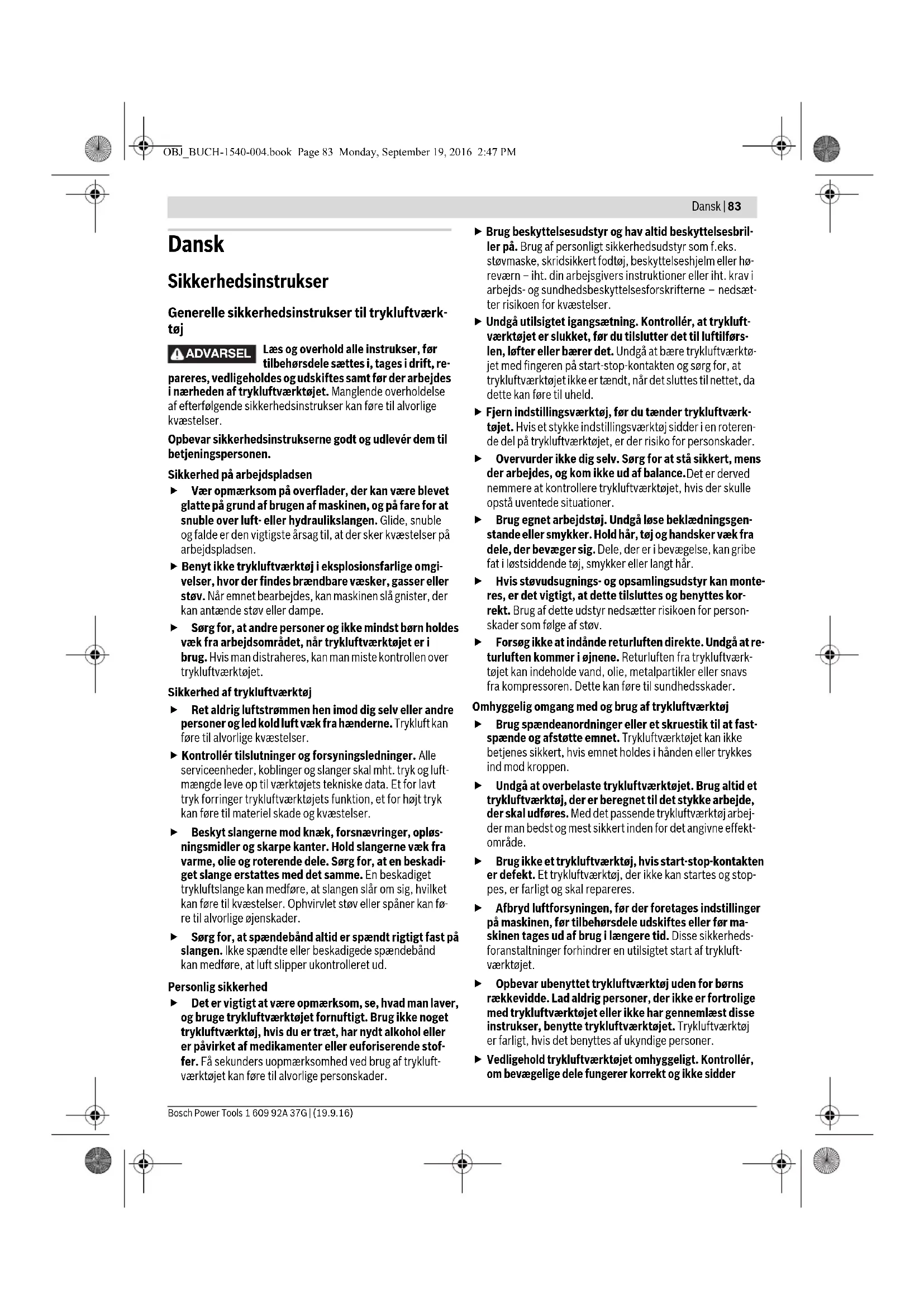 Vedligehold trykluftværktøjet omhyggeligt. Kontrollér, om bevægelige dele fungerer korrekt og ikke sidder ADVARSEL OBJ_BUCH-1540-004.book Page 83 Monday, September 19, 2016 2:47 PM84 | Dansk 1 609 92A 37G | (19.9.16) Bosch Power Tools fast, og om delene er brækket eller beskadiget, så tryk- luftværktøjets funktion påvirkes. Få beskadigede dele repareret, inden trykluftværktøjet tages i brug. Mange uheld skyldes dårligt vedligeholdte trykluftværktøjer. Sørg for, at skæreværktøjer er skarpe og rene. Omhyg- geligt vedligeholdte skæreværktøjer med skarpe skære- kanter sætter sig ikke så hurtigt fast og er nemmere at føre. Brug trykluftværktøj, tilbehør, indsatsværktøj osv. iht. disse instrukser. Tag hensyn til arbejdsforholdene og det arbejde, der skal udføres. Dermed reduceres støvud- vikling, svingninger og støjudvikling så meget som muligt. Trykluftværktøjet bør udelukkende klargøres, indstil- les eller bruges af kvalificerede og instruerede bruge- re. Trykluftværktøjet må ikke ændres. Ændringer kan for- ringe sikkerhedsforanstaltningernes funktion og øge risici- ene for brugeren. Service Sørg for at trykluftværktøjet kun repareres af kvalifi- cerede fagfolk og at der kun benyttes originale reser- vedele. Dermed sikres det, at trykluftværktøjet bliver ved med at være sikkert. Sikkerhedsinstrukser til trykluft-boremaskiner Kontrollér, at typeskiltet kan læses. Bestil i givet fald et nyt hos producenten. Skulle emnet eller en af tilbehørsdelene eller endda trykluftværktøjet brække, kan dele slynges ud med stor hastighed. Brug altid et slagresistent øjenværn under driften samt i forbindelse med reparations- eller vedligeholdelses- arbejde og når tilbehørsdele udskiftes på trykluftværk- tøjet. Graden af den nødvendige beskyttelse bør vur- deres separat i hver enkelt situation. Brugerne og vedligeholdelsespersonalet skal være fy- sisk i stand til at håndtere trykluftværktøjets størrelse, vægt og ydelse/effekt. Vær forberedt på, at trykluftværktøjet kan udføre ufor- ventede bevægelser, der kan opstå som følge af reakti- onskræfter eller fordi indsatsværktøjet brækker. Hold godt fast i trykluftværktøjet og sørg for, at både krop og arme befinder sig i en position, der kan klare disse bevægelser. Disse sikkerhedsforanstaltninger kan undgå kvæstelser. Sluk for trykluftværktøjet med det samme, hvis ind- satsværktøjet blokerer. Vær klar, hvis maskinen arbej- der med høje reaktionsmomenter, da dette kan føre til tilbageslag. Indsatsværktøjet blokerer, hvis: – trykluftværktøjet overbelastes, – det kommer i klemme i det materiale, der er ved at blive bearbejdet, eller – dets spids trænger igennem det materiale, der er ved at blive bearbejdet. Brug hjælpemidler til optagelse af reaktionsmomenter som f.eks. en støtteanordning. Er dette ikke muligt, bruges et ekstrahåndtag. Sørg for, at din hånd aldrig kommer i nærheden af det roterende indsatsværktøj. Du kan komme til skade. Sluk for trykluftværktøjet, hvis luftforsyningen afbry- des eller driftstrykket reduceres. Kontrollér driftstryk- ket og start igen, når driftstrykket er optimalt. Når trykluftværktøjet er i brug, kan brugeren få en ube- hagelig fornemmelse i hænder, arme, skuldre, halsom- råde eller andre legemsdele, når brugeren udfører et arbejdsrelateret arbejde. Indtag en behagelig position, når du arbejder med det- te trykluftværktøj, sørg for at stå sikkert og undgå ufordelagtige positioner eller positioner, hvor det er vanskeligt at holde ligevægten. Brugeren bør ændre sin kropsholdning ved længerevarende arbejde, da dette kan hjælpe med at undgå besvær og træthed. Hvis brugeren registrerer symptomer som f.eks. ved- varende utilpashed, lidelse, bankning, smerter, krib- lende fornemmelse, døvhed, brændende fornemmelse eller stivhed, bør du ikke ignorere disse advarselstegn. Brugeren bør informere sin arbejdsgiver om dette og gå til en kvalificeret læge. Vær forsigtig! Indsatsværktøj kan blive varmt, hvis trykluftværktøjet benyttes i længere tid. Brug beskyt- telseshandsker. Anvend egnede søgeinstrumenter til at finde frem til skjulte forsyningsledninger eller kontakt det lokale forsyningsselskab. Kontakt med elektriske ledninger kan føre til brand og elektrisk stød. Beskadigelse af en gasled- ning kan føre til eksplosion. Beskadigelse af en vandled- ning kan føre til materiel skade. Undgå kontakt med en spændingsførende ledning. Trykluftværktøjet er ikke isoleret, og kontakten med en spændingsførende ledning kan føre til elekrisk stød. Det støv, der opstår i forbindelse med smergling, savning, slibning, boring og lignende arbejde, kan være kræftfremkaldende, fo- sterbeskadigende eller ændre arveanlæggene. Nogle af stofferne i dette støv er: – Bly i blyholdige farver og lakker; – Krystallin kieseljord i tegl, cement og andre murerarbej- der; – Arsen og chromat i kemisk behandlet træ. Risikoen for at blive syg afhænger af, hvor ofte du udsættes for disse stoffer. For at reducere faren bør du kun arbejde i godt ventilerede rum med tilsvarende beskyttelsesudstyr (f.eks. med specielt konstruerede åndedrætsmasker, der og- så bortfiltrerer selv de mindste støvpartikler). Når der arbejdes på emnet, kan der opstå yderligere støjbelastning, der kan undgås ved at træffe egnede foranstaltninger, som f.eks. brug af isoleringsmateria- ler, hvis der opstår klingestøj på emnet. Er trykluftværktøjet udstyret med en lyddæmper, skal det altid sikres, at denne er på stedet, når trykluft- værktøjet bruges, og at den befinder sig i en god ar- bejdstilstand. ADVARSEL OBJ_BUCH-1540-004.book Page 84 Monday, September 19, 2016 2:47 PMDansk | 85 Bosch Power Tools 1 609 92A 37G | (19.9.16)