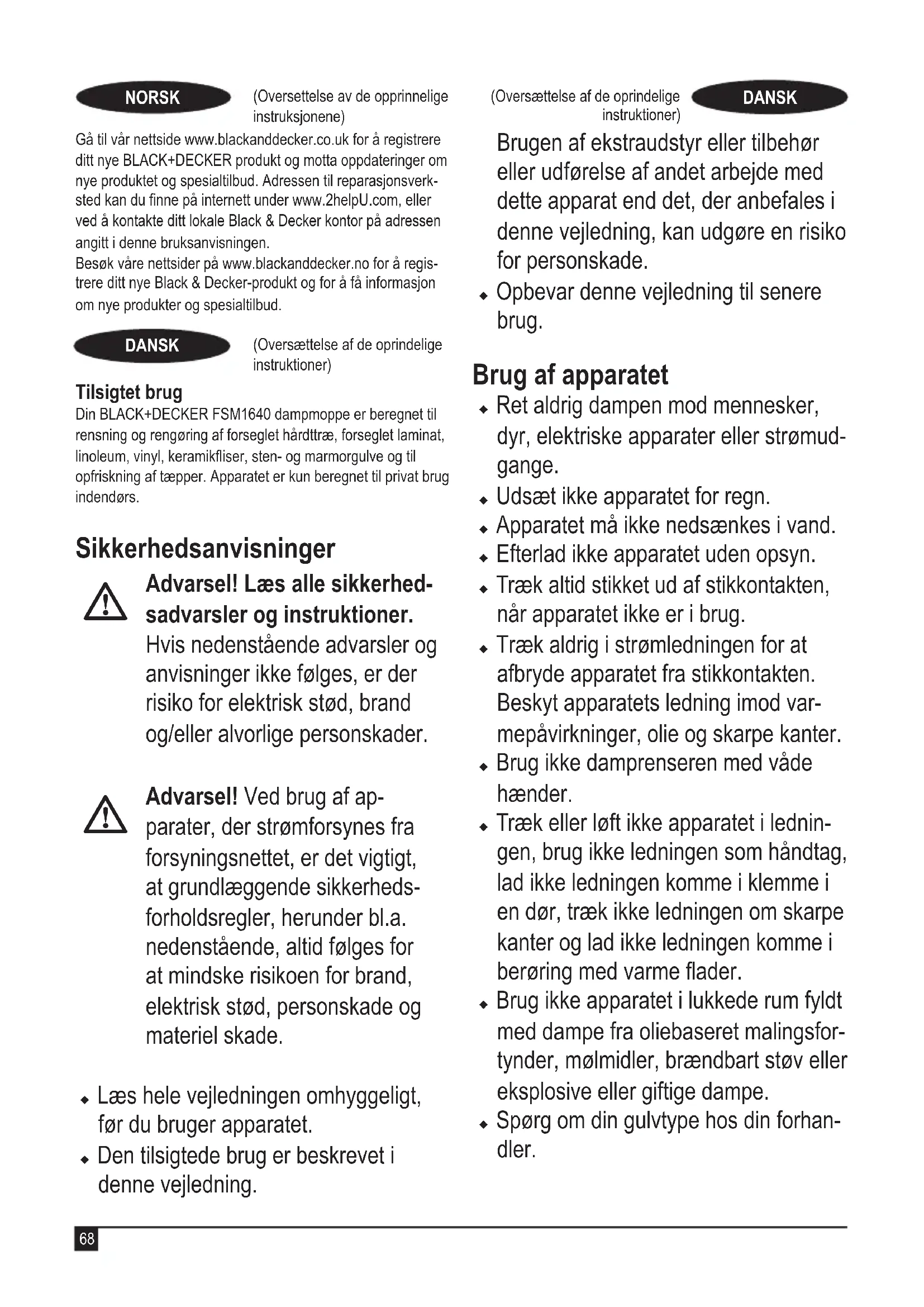 Effekt W Beholderkapacitet ml Vægt kg 3.4 Garanti Black & Decker er overbevist om den gode kvalitet af sine produkter og giver forbrugerne en garanti på 24 måneder fra købsdatoen. Garantien er et tillæg til forbrugerens lovmæssige rettigheder og påvirker ikke disse. Garantien er gyldig inden for medlemsstaterne af Den Europæiske Union, Det Europæiske Frihandelsområde og Det Forenede Kongerige.Når du gør krav på garantien, skal kravet være i overens-stemmelse med Black & Decker vilkår og betingelser, og du skal indsende dokumentation for købet til sælgeren eller til en autoriseret reparatør. Vilkår og betingelser for Black & Decker 2 års garanti og placeringen af dit nærmeste autoriserede serviceværksted kan fås på internettet på www.2helpU.com, eller ved at kontakte dit lokale Black & Decker kontor på den adresse, der er angivet i denne vejledning.Besøg venligst vores websted www.blackanddecker.co.uk for at registrere dit nye BLACK+DECKER produkt og modtage opdateringer om nye produkter og specielle tilbud.service-værksted kan fås på internettet på www.2helpU.com, eller ved at kontakte dit lokale Black & Decker kontor på den adresse, der er angivet i denne vejledning.Besøg venligst vores websted www.blackanddecker.co.uk for at registrere dit nye Black & Decker produkt og modtage opdateringer om nye produkter og specielle tilbud. Käyttötarkoitus BLACK+DECKER SM1640 -höyrymoppi on tarkoitettu tiivistet-tyjen puu- ja laminaatti-, linoleumi-, vinyyli-, keramiikkalaatta-, kivi- ja marmorilattioiden puhdistamiseen ja desinointiin sekä mattojen siistimiseen. Laite on tarkoitettu ainoastaan sisätiloissa tapahtuvaan kotitalouskäyttöön. Turvallisuusohjeet